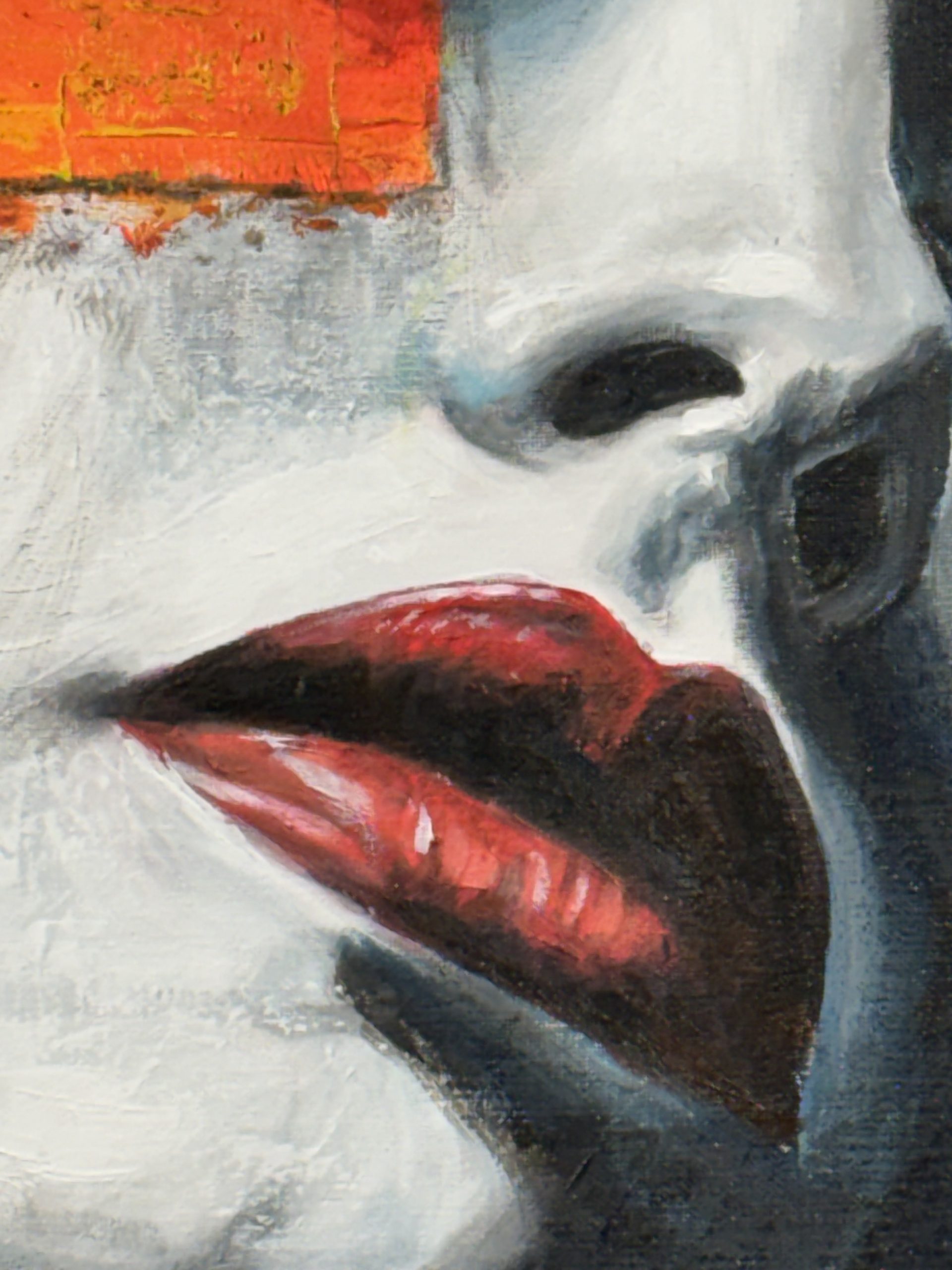 La irrupción del color vivo—el azul eléctrico, el rojo terroso y el naranja cálido—es el elemento clave de la composición. Estos bloques de color dividen el rostro como una cicatriz o una banda de energía. No son decorativos, sino la visualización tangible de la emoción que subyace al gesto. Es mi manera de decir que el anhelo no es una sensación sutil, sino una fuerza fragmentadora y vibrante que rompe la fachada de la serenidad.