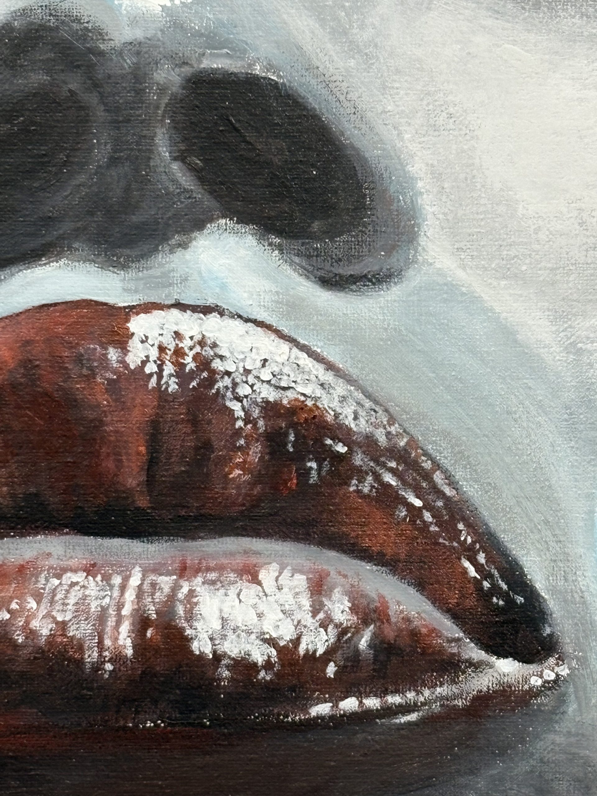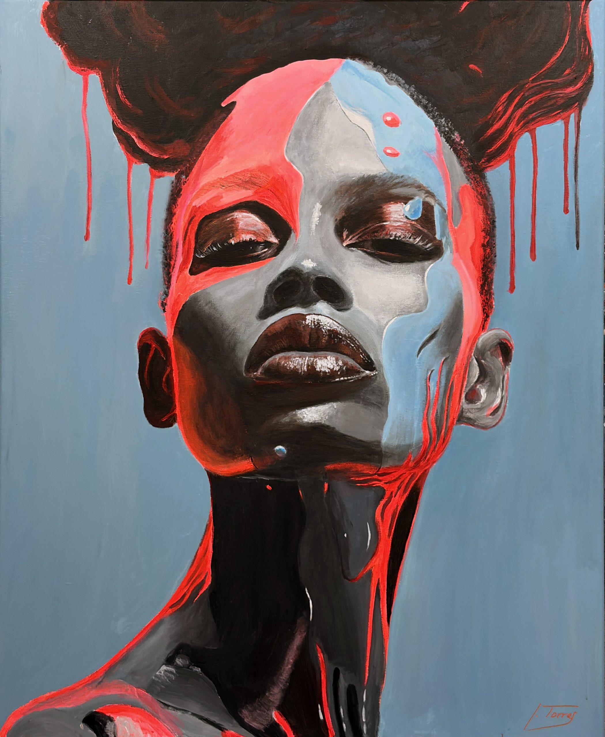 Hay en esta imagen una dualidad que intriga. Los trazos de color, de un salmón suave y un gris azulado, se deslizan por la cara y el cuello como una segunda piel, como si la mujer estuviera en un proceso de transformación o, tal vez, desintegración. El pelo, recogido en una especie de nudo o corona, parece estar hecho de la misma materia que las sombras que envuelven el cuadro, añadiendo un toque de misterio.
