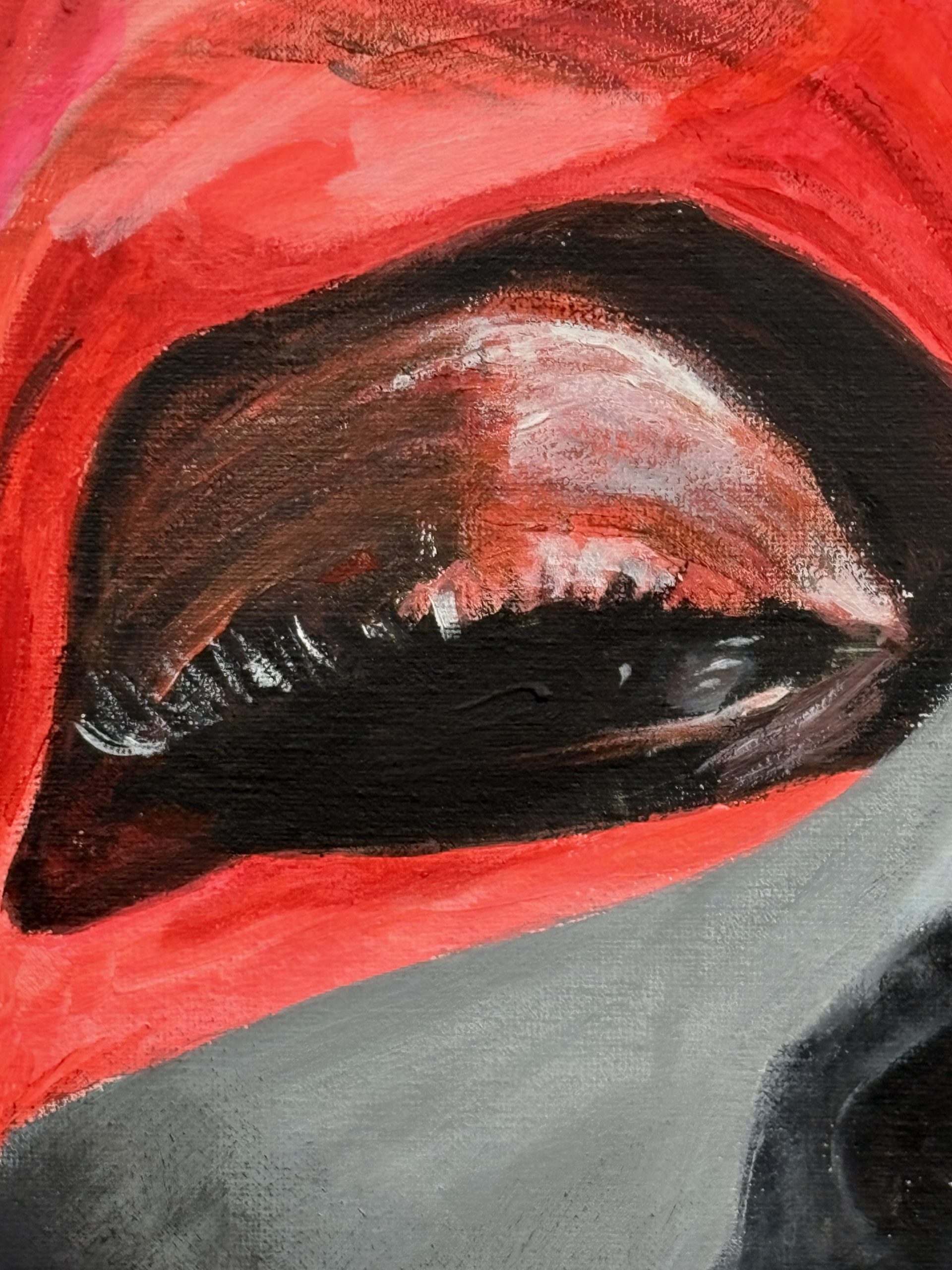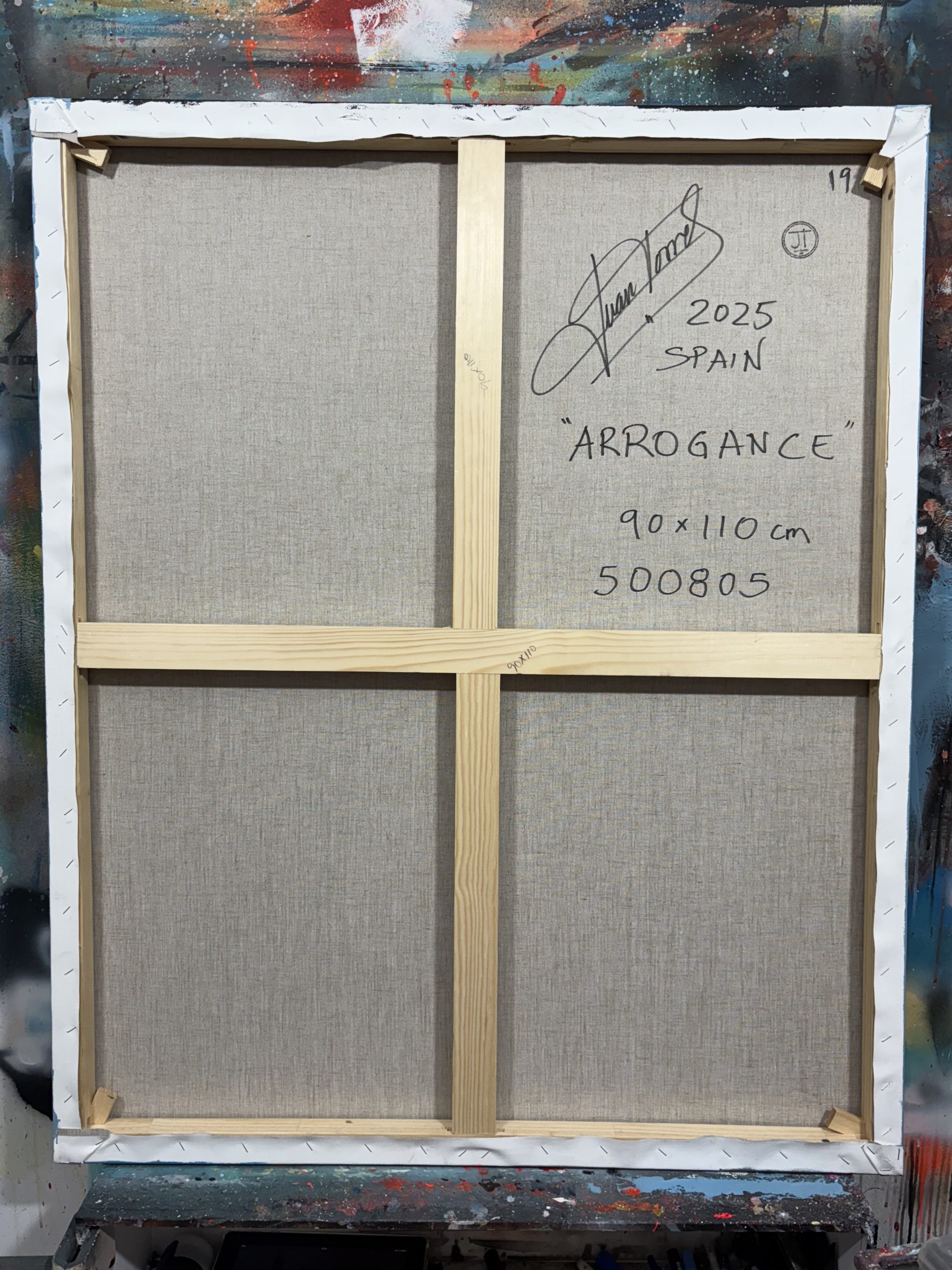 No sé si esta mujer se está preparando para una batalla, si ha salido de ella o si está inmersa en un acto de introspección. La palabra "arrogancia" en el título invita a pensar que hay una historia de poder, de una fuerza interna que no necesita ser mostrada con los ojos abiertos. Quizá se trata de una historia de resistencia, de alguien que, incluso con el rostro pintado, sigue manteniendo una dignidad inmutable, una arrogancia que no necesita gritar para ser escuchada. Es la calma de quien sabe que su lugar en el mundo es inquebrantable, sin importar lo que se refleje en su superficie.
