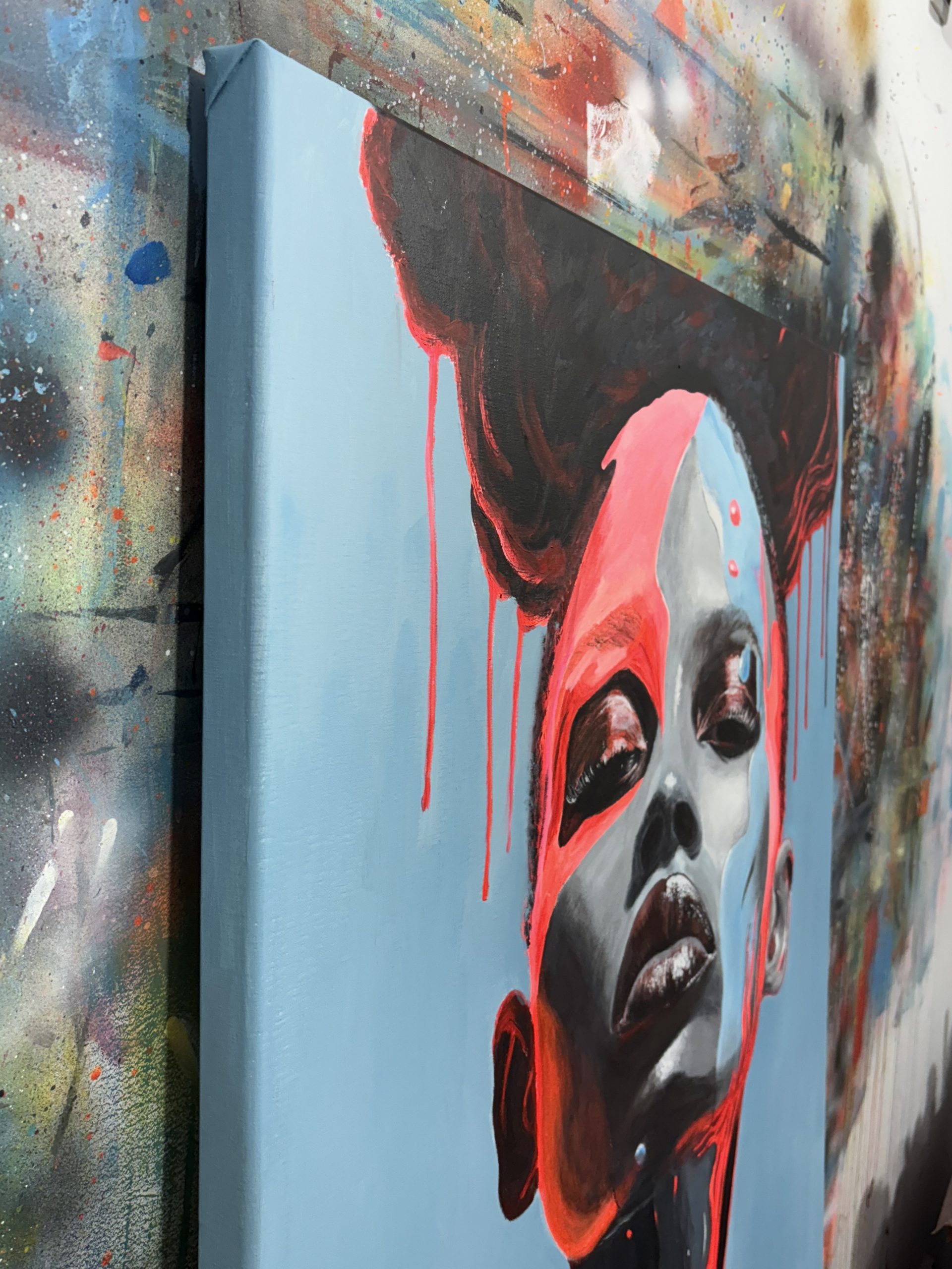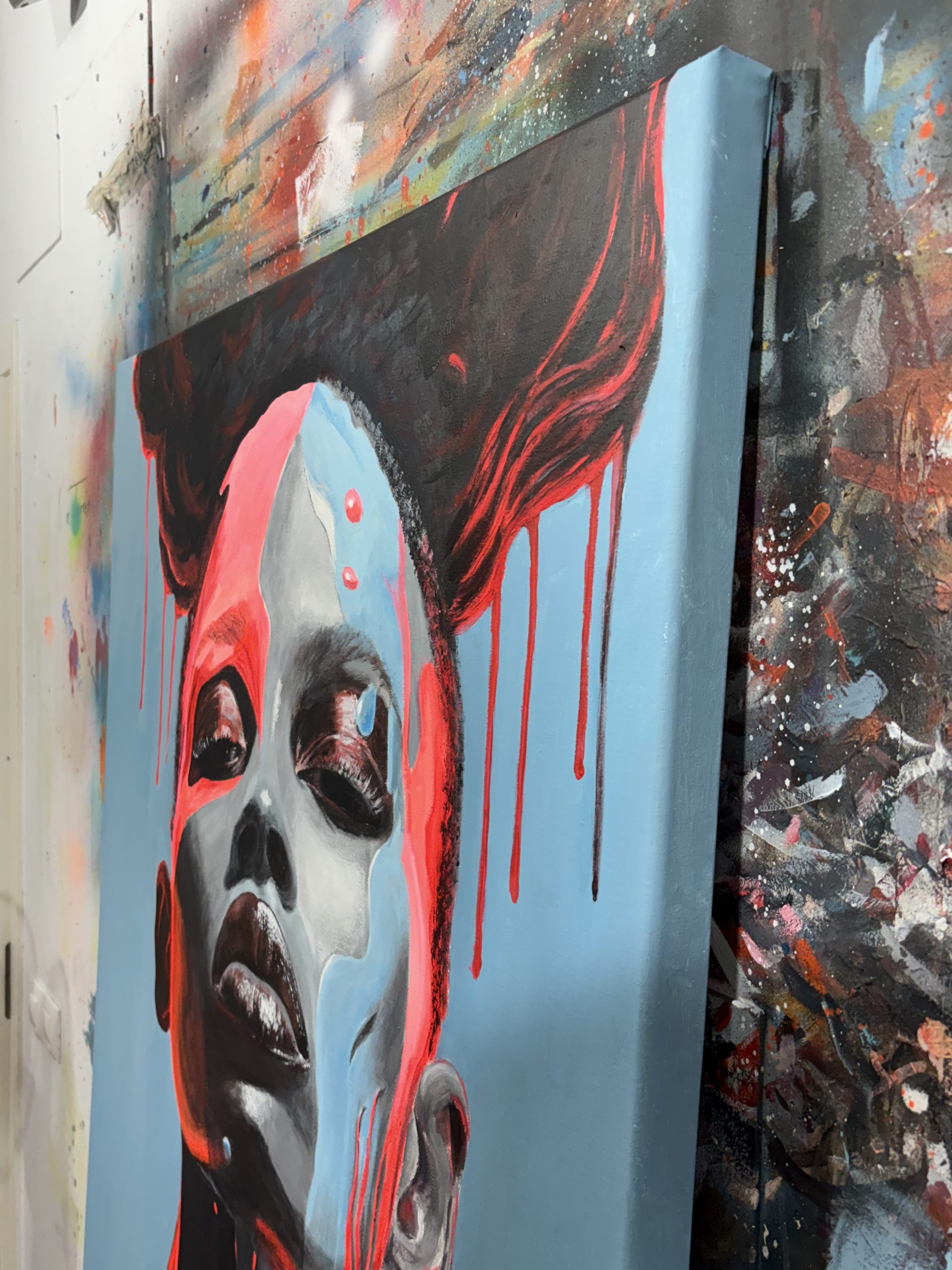 Al ver "Arrogancia", nos encontramos ante un retrato que, de primeras, desafía cualquier convención. La figura central, con su mirada entornada, no ofrece un punto de conexión directo, sino que invita a observarla, a rodearla con la vista. Mi atención se divide entre la piel oscura y los chorreones de pintura, que parecen ser un accidente o quizás una decisión premeditada.