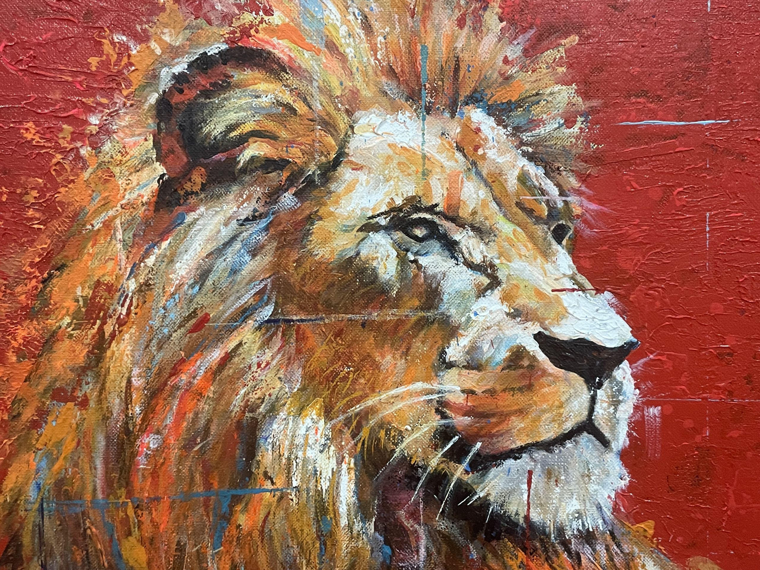 La obra "Brothers" presenta una composición impactante y cargada de simbolismo. El fondo rojo intenso crea una atmósfera dramática y vibrante, mientras que los dos leones, protagonistas indiscutibles, capturan la atención del espectador. La yuxtaposición del fondo abstracto con las figuras realistas de los animales genera una tensión visual fascinante.