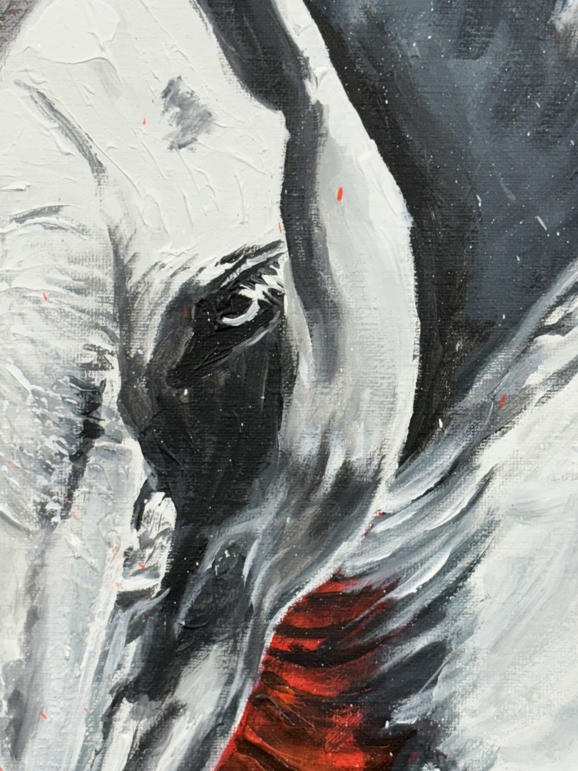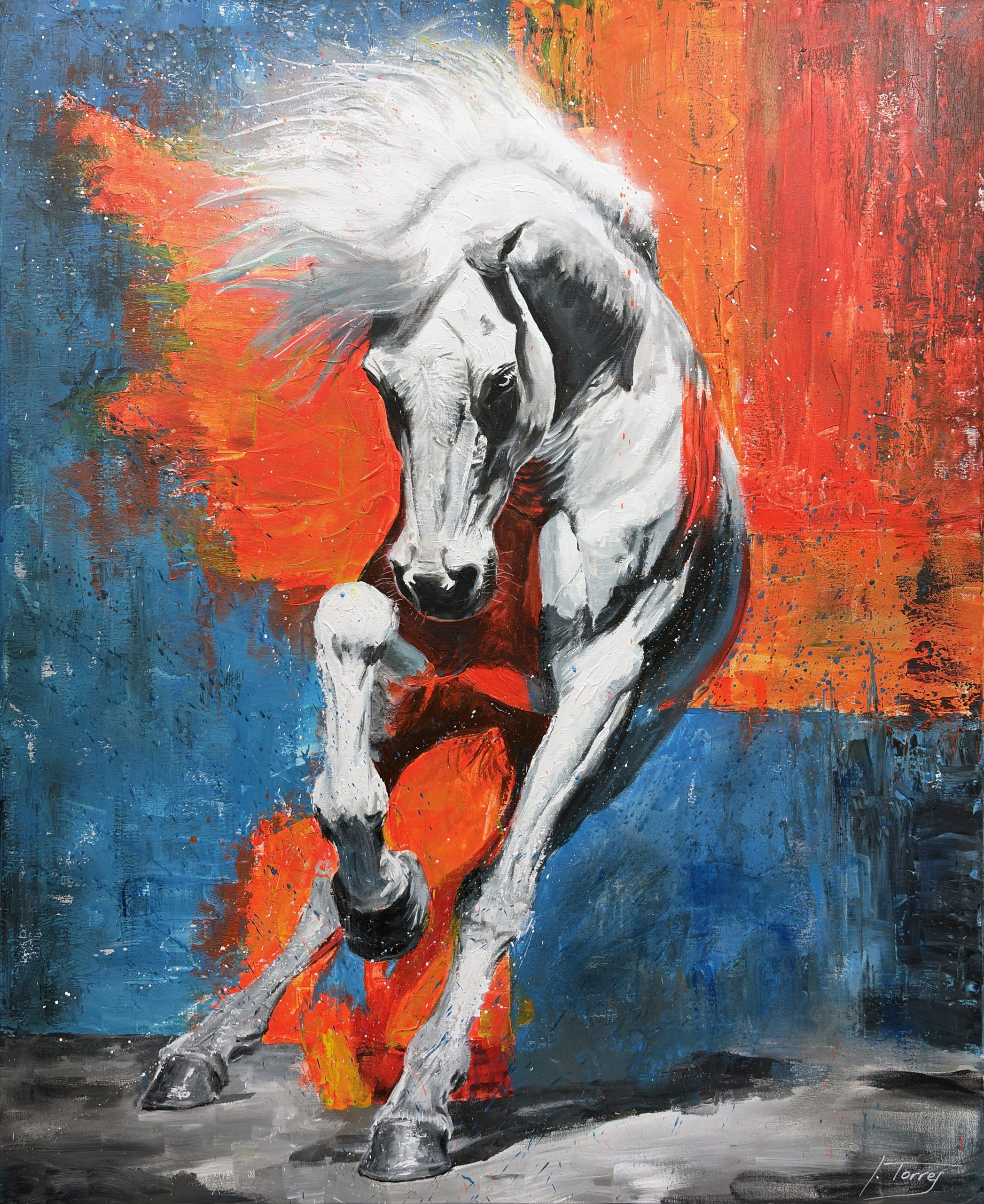 El caballo, pintado mayormente en tonos de blanco y gris, se convierte en el epicentro de este conflicto de color. No es un blanco puro; está manchado y sombreado, lo que le confiere una musculatura y una anatomía con una fuerza casi escultórica. Las sombras oscuras en su cabeza y patas lo anclan al plano inferior, mientras que la cola y la crin, trabajadas con pinceladas más largas.
