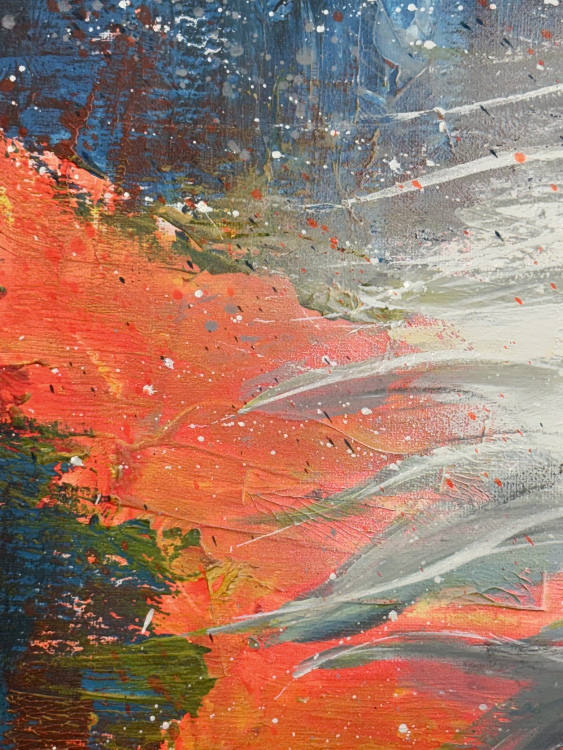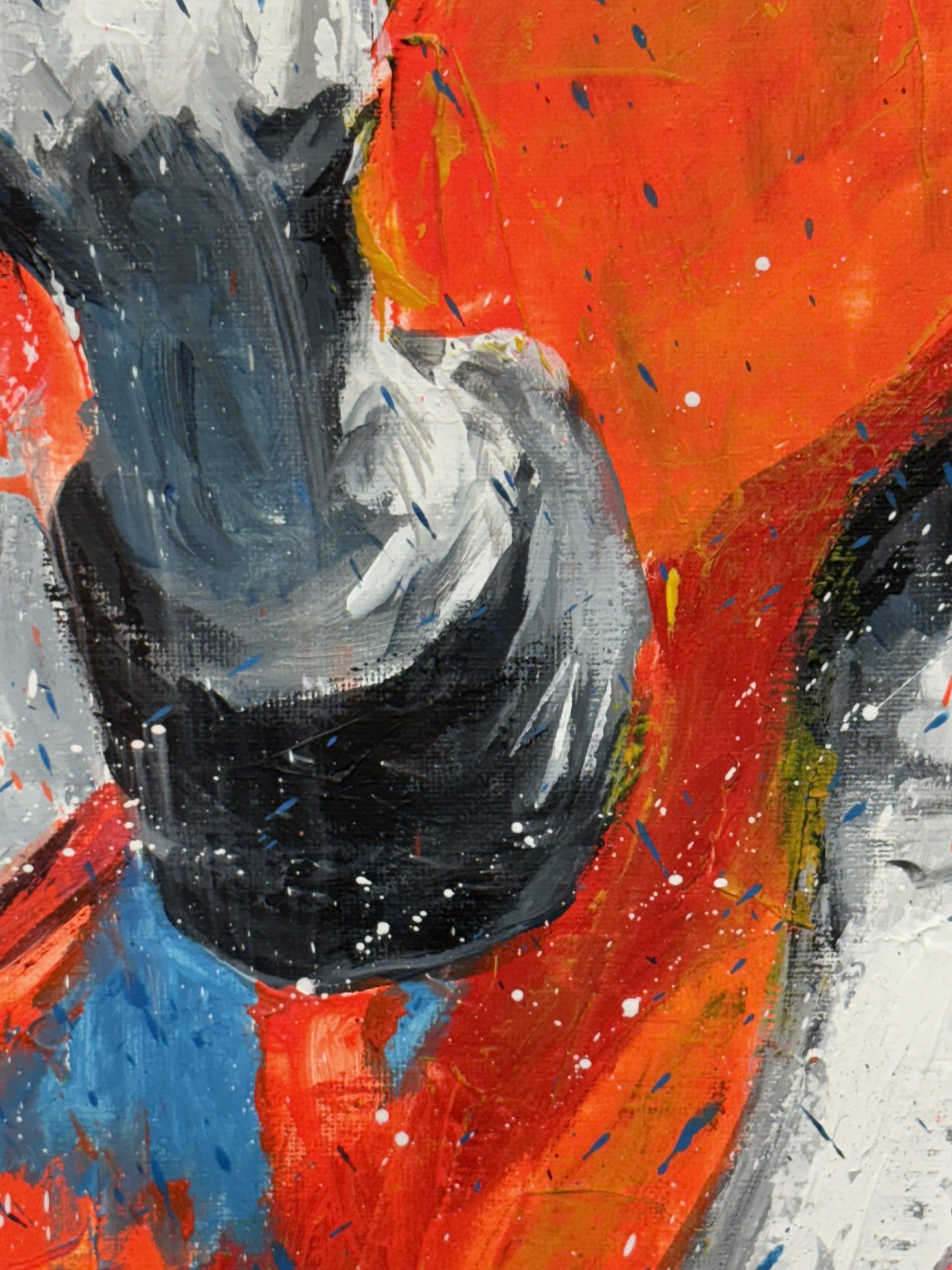 El fondo es una batalla de colores que polarizan la composición. Tenemos ese azul cobalto frío y profundo, contrastado con las masas vibrantes de rojo bermellón y naranja intenso. Esta paleta no es casual; busqué un choque violento entre el frío y el calor, una tensión que encapsulara el momento antes o durante una liberación.