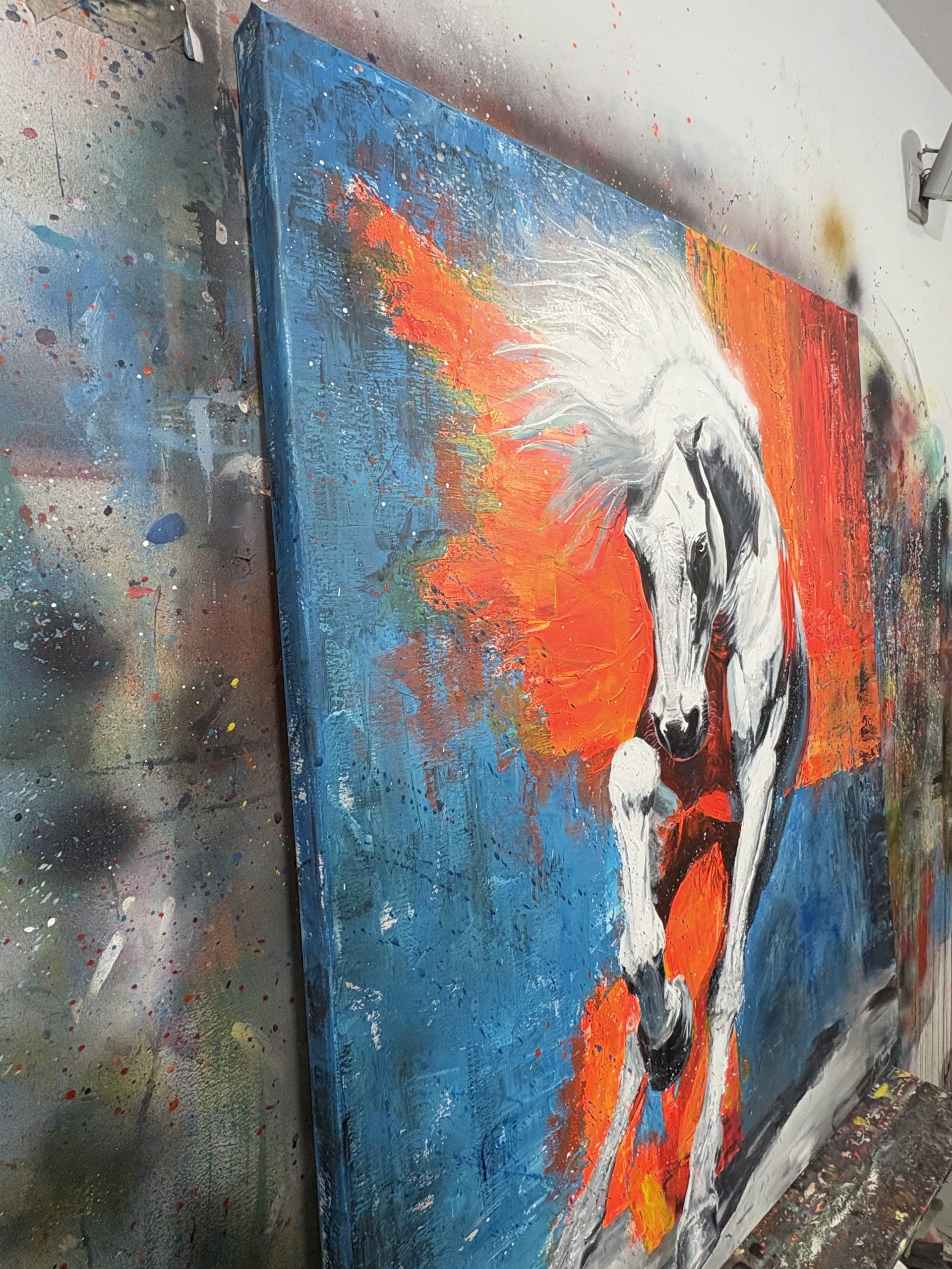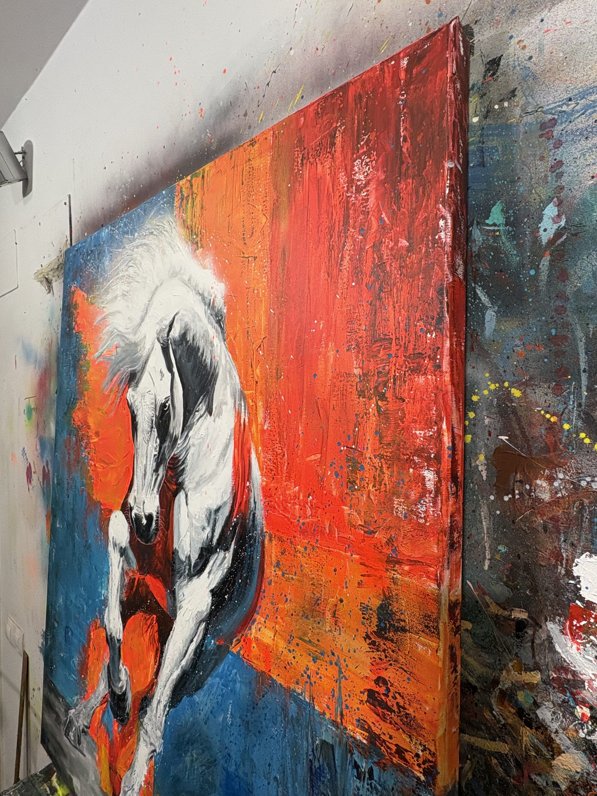 Al mirar "BURST" (Explosión), lo primero que salta a la vista es esa energía cruda e incontrolable. Es una pieza donde quise que la figura central, el caballo blanco, no solo estuviera representada, sino que pareciera que está irrumpiendo o estallando desde un plano de fondo casi abstracto.