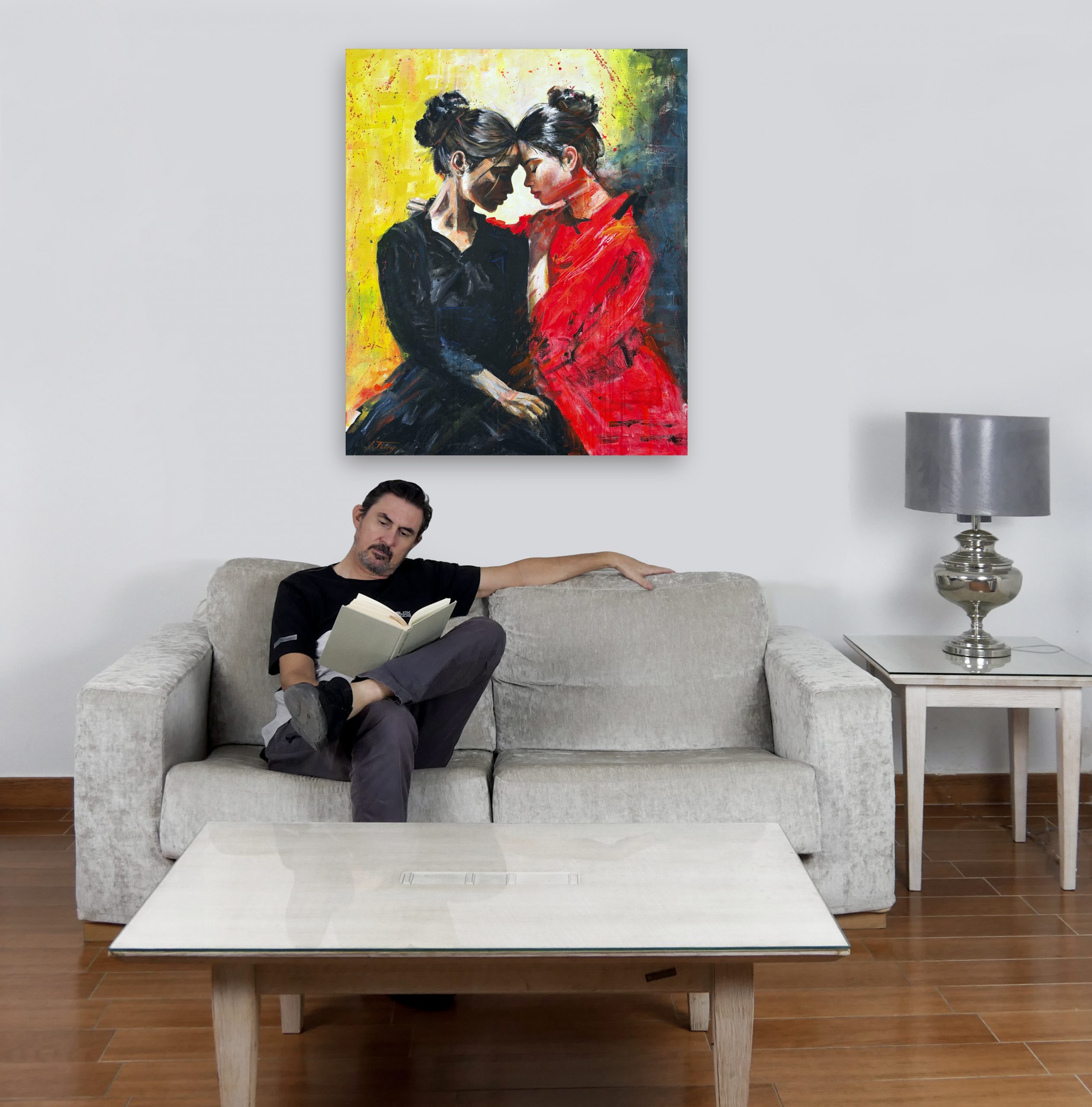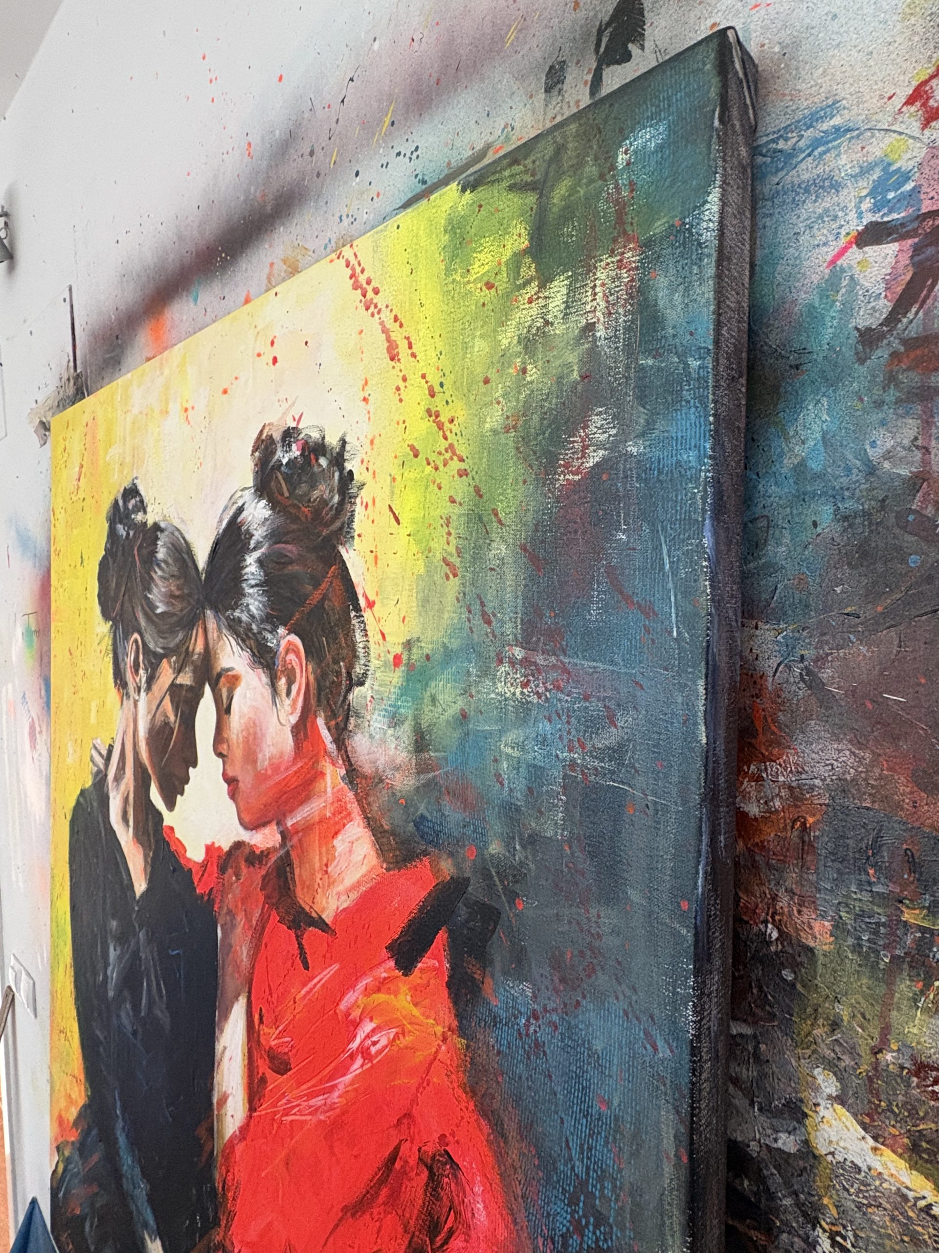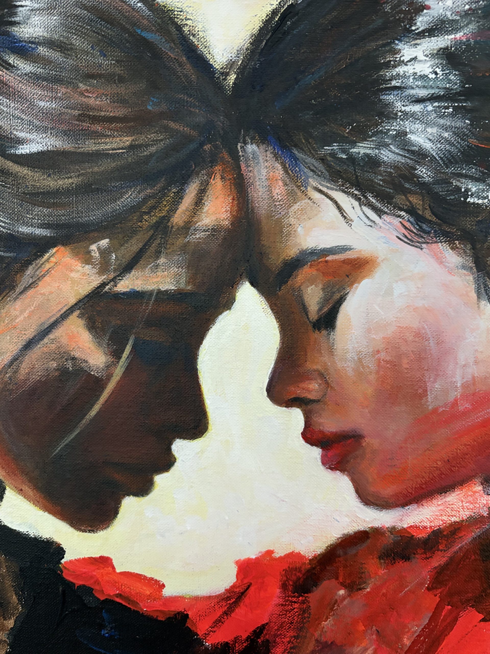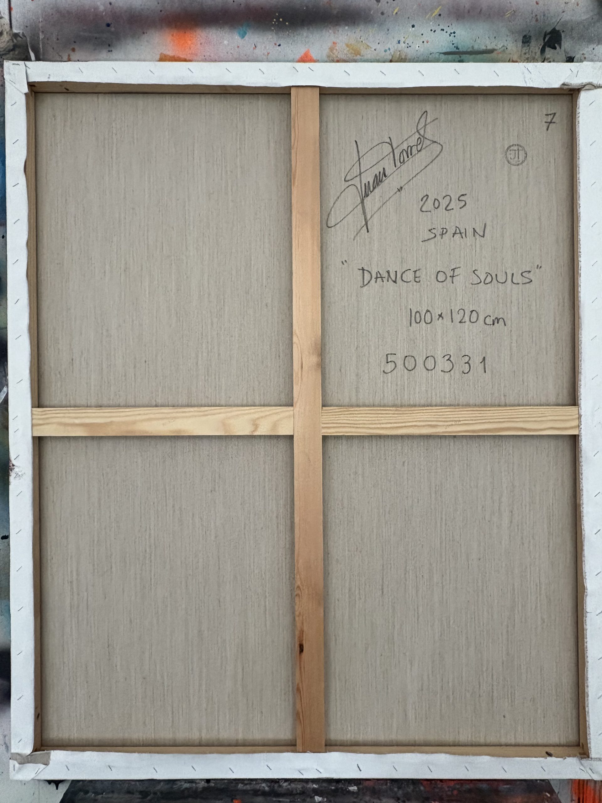 Cuando miro "Danza de Almas", veo más que solo pintura sobre un lienzo. Veo un momento cargado de intensidad. En el centro, estas dos figuras. Quise capturarlas en un instante de conexión profunda, casi como si el mundo exterior se desvaneciera a su alrededor. Sus frentes se tocan, un gesto que siempre me ha parecido muy íntimo, un punto de encuentro silencioso.