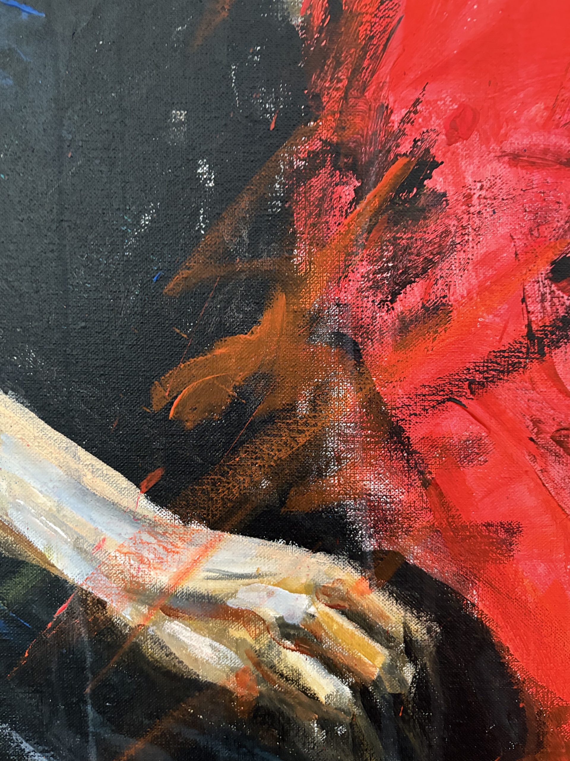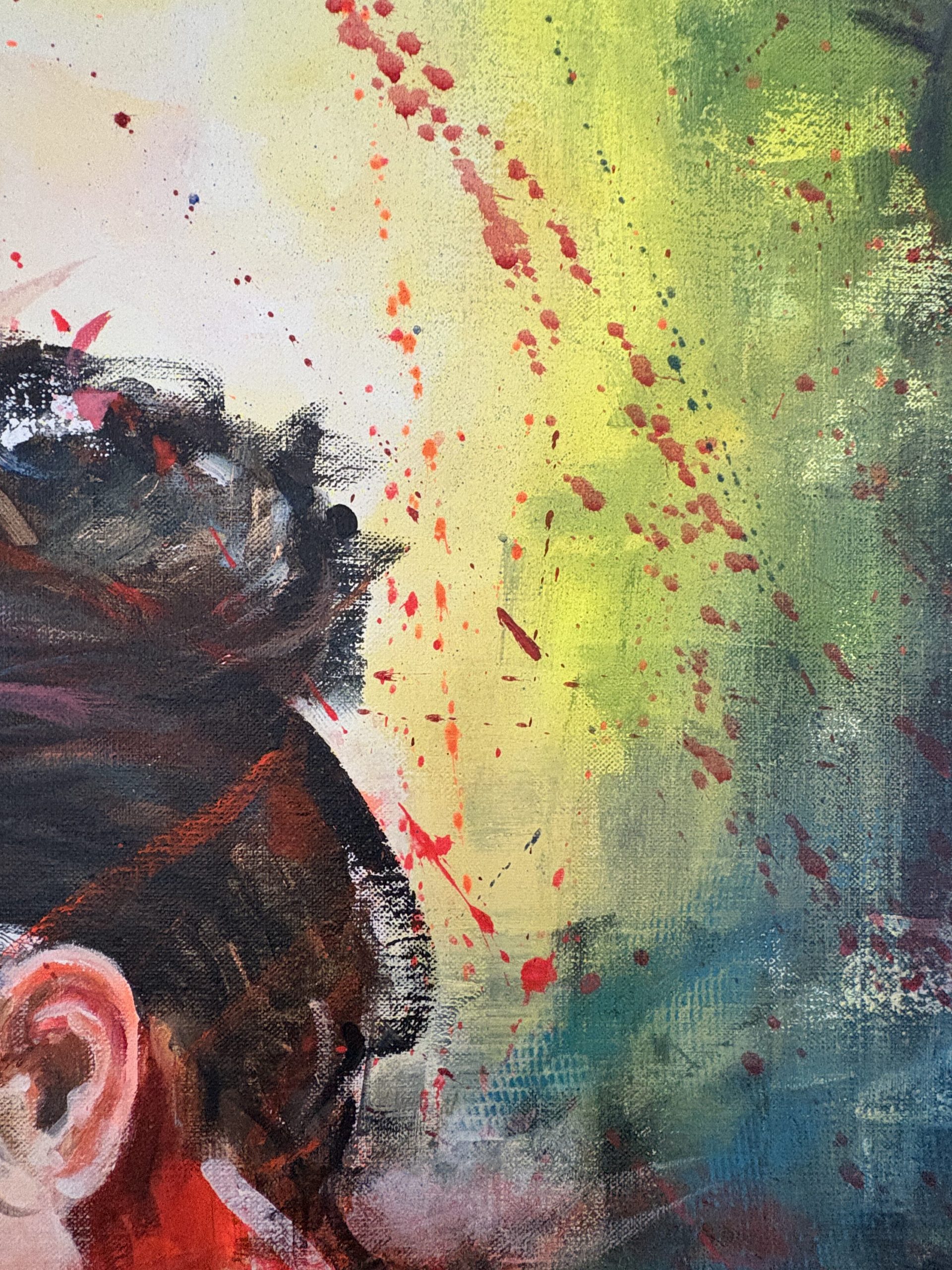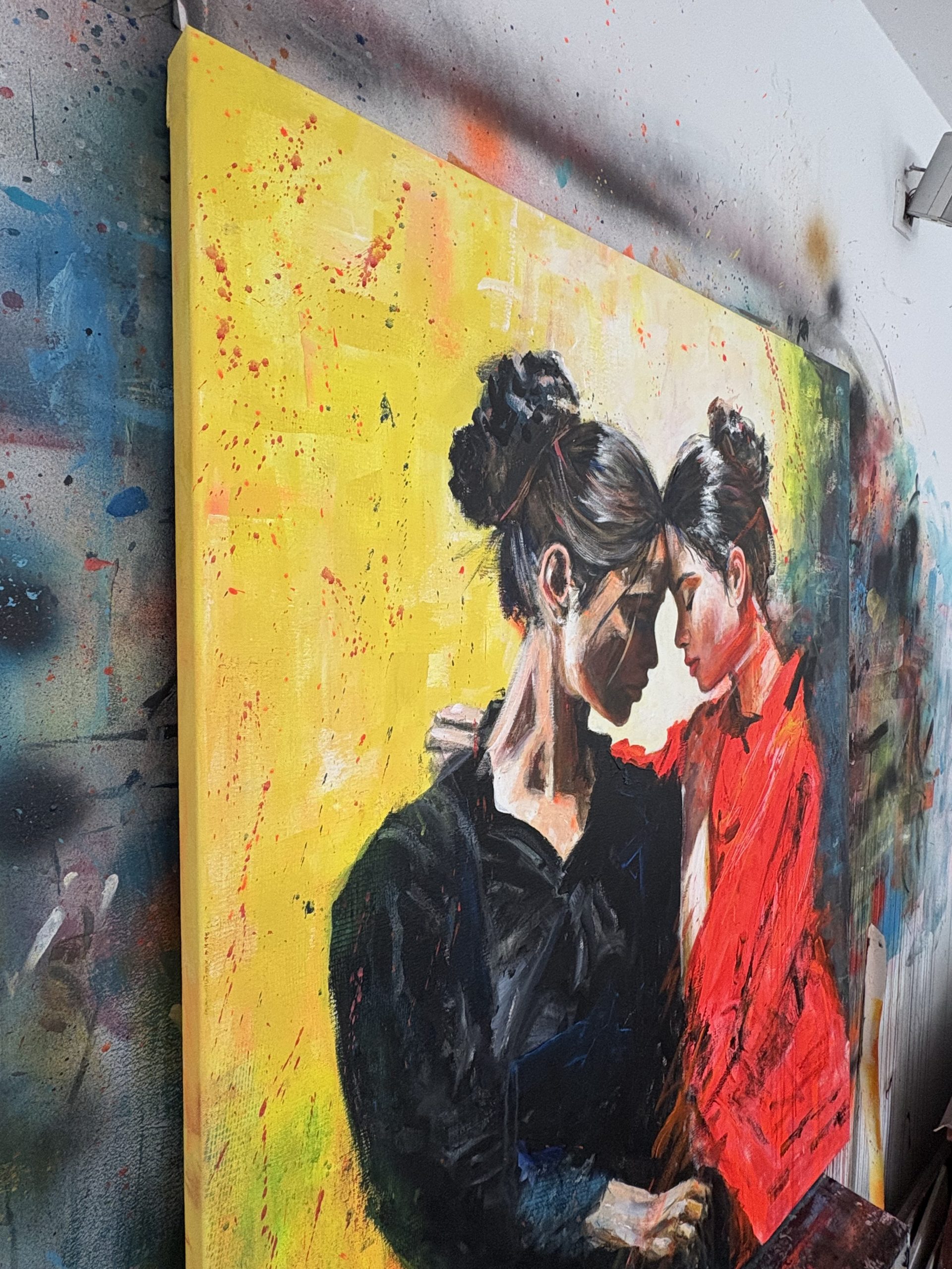 El fondo fue surgiendo de manera más espontánea. Hay amarillos luminosos que chocan con azules y verdes más sombríos, salpicaduras que rompen la calma aparente de las figuras. Quería que ese fondo reflejara una especie de torbellino emocional o energético que las rodea, o quizá que emana de ellas. Las pinceladas son visibles, enérgicas, porque sentía que la escena pedía esa textura, esa sensación de movimiento contenido.