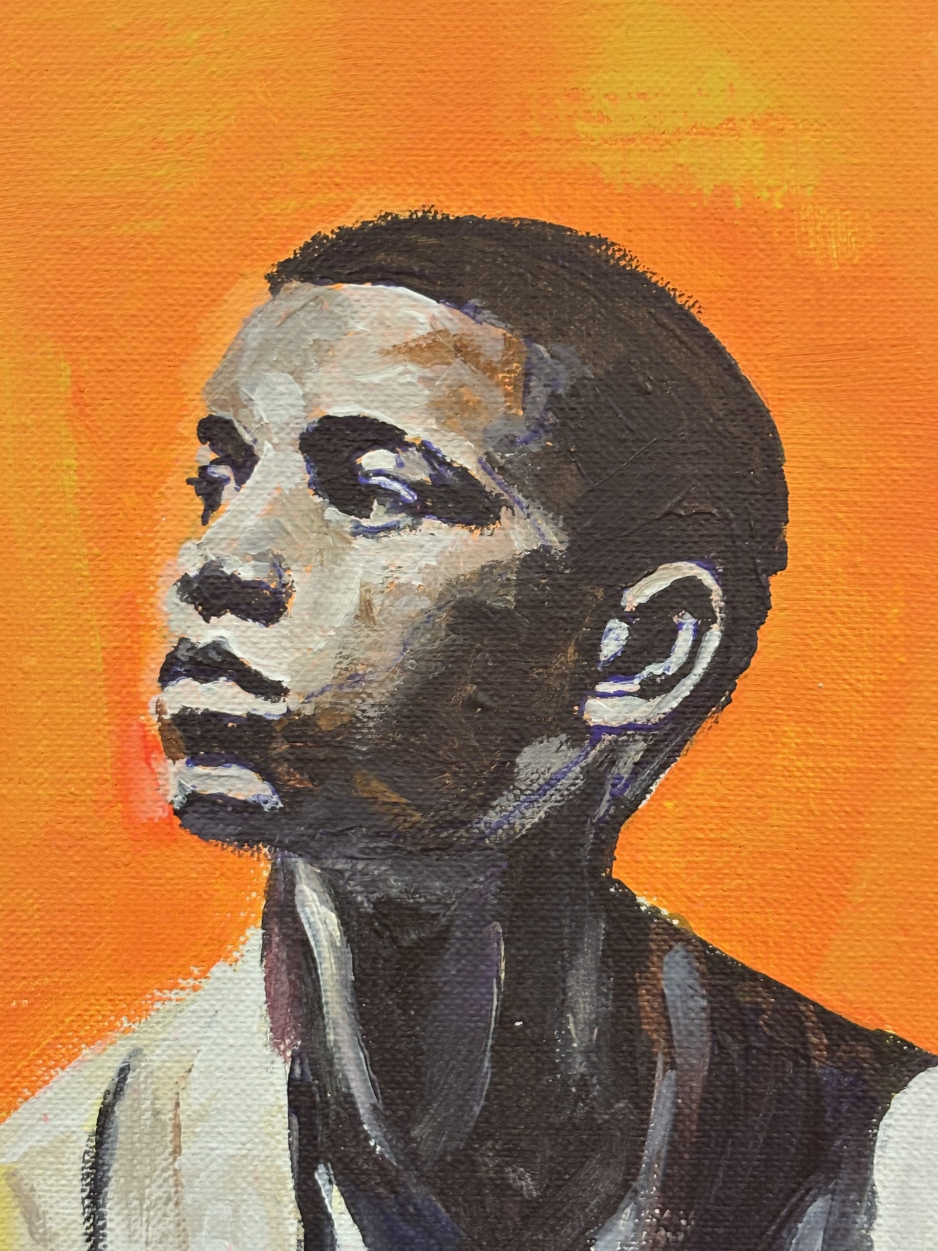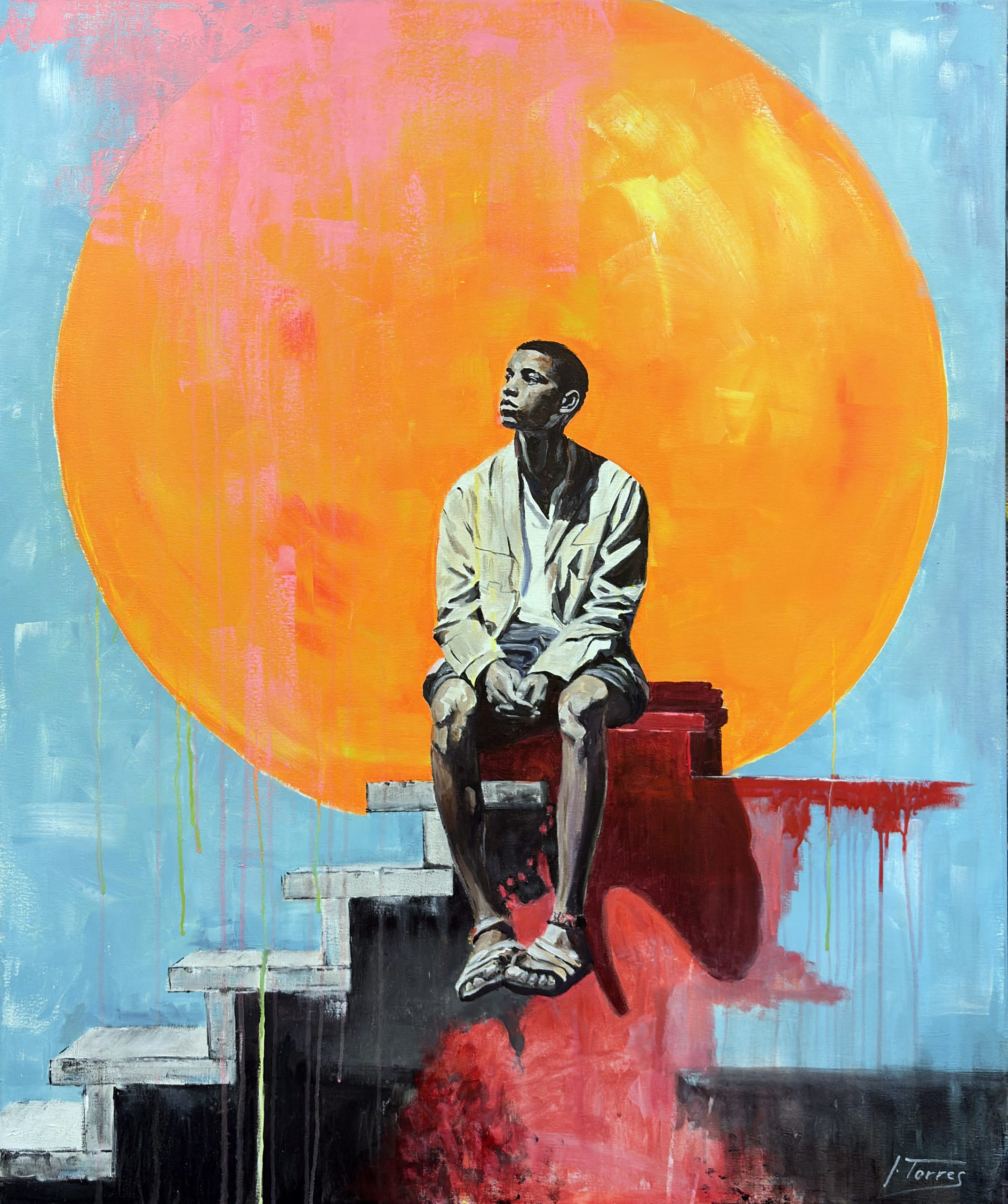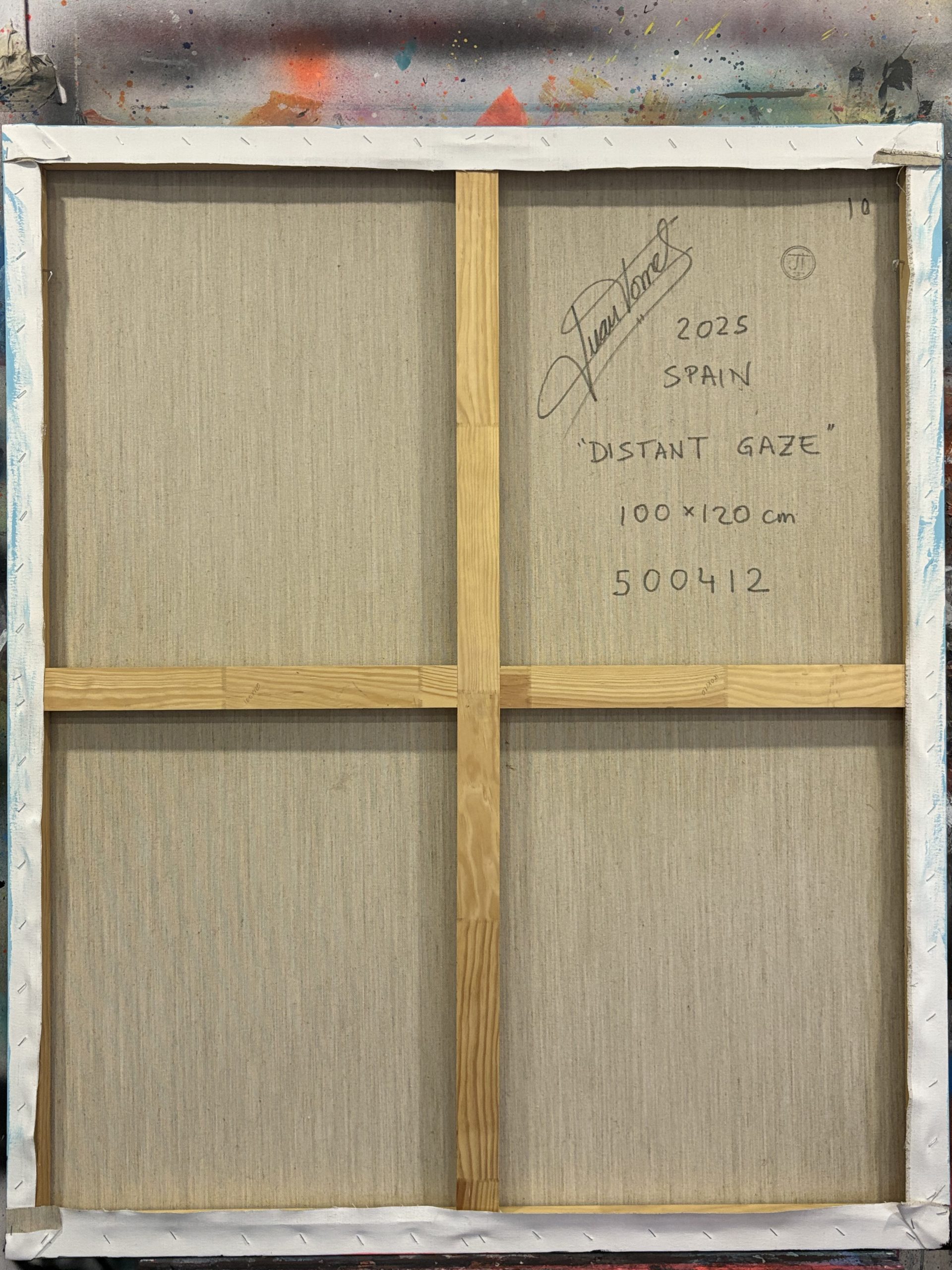 "Distant Gaze" (Mirada Lejana) es una pieza que trata de plasmar una quietud palpable. En el centro, un joven absorto en su contemplación, sentado al borde de unas escaleras inconclusas o quizás en pausa. Su mirada se dirige hacia un punto fuera del lienzo, un destino que solo él conoce.