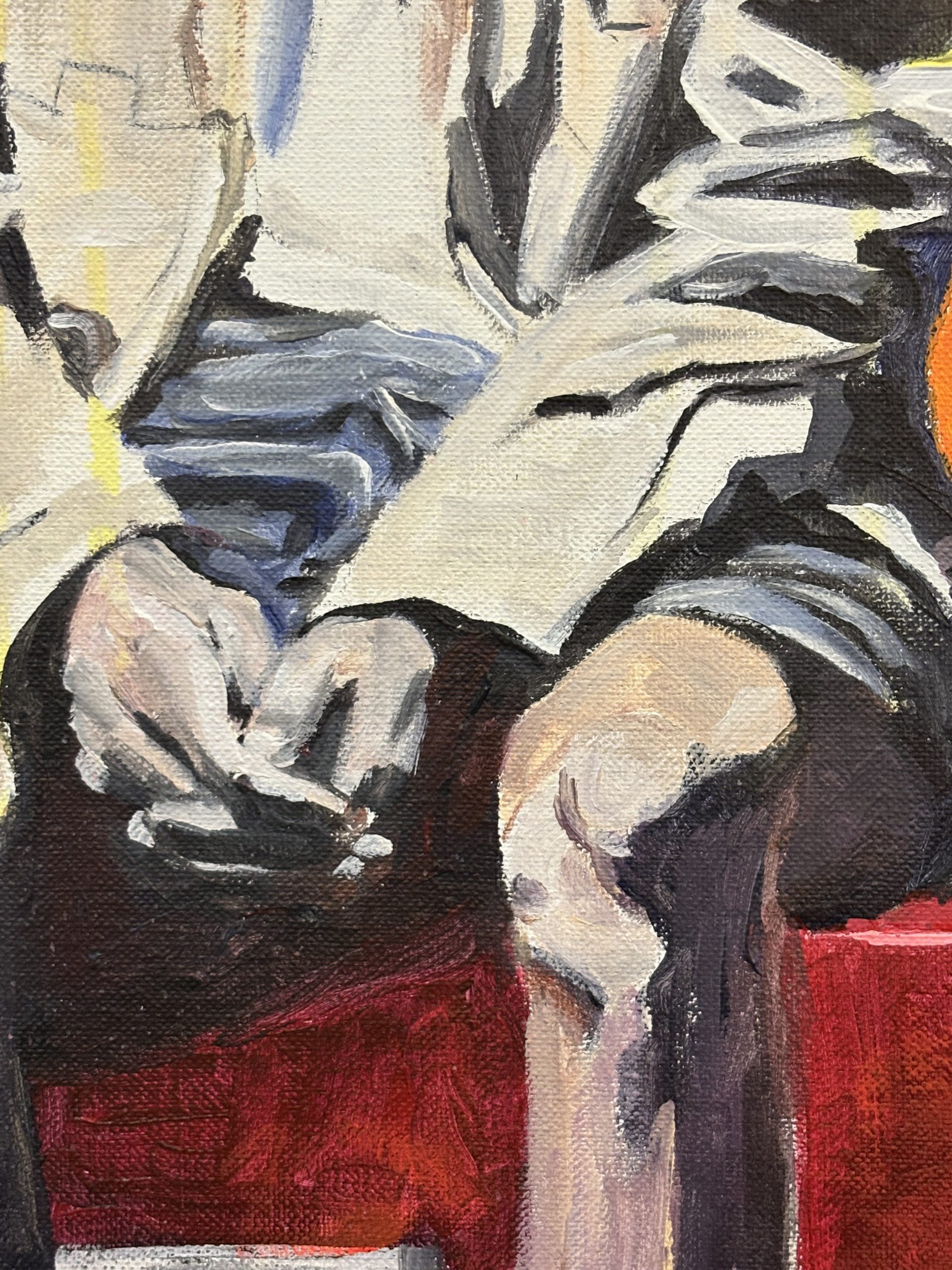Me interesa la ambigüedad de la escena. ¿Está esperando? ¿Reflexionando? ¿Qué historia subyace a esa postura ensimismada? Las escaleras, a medio construir o desmanteladas, sugieren un tránsito, un cambio, un camino que se detiene o se transforma. El espectador es invitado a imaginar el antes y el después de este instante suspendido, a construir su propia narrativa sobre este distante mirar.