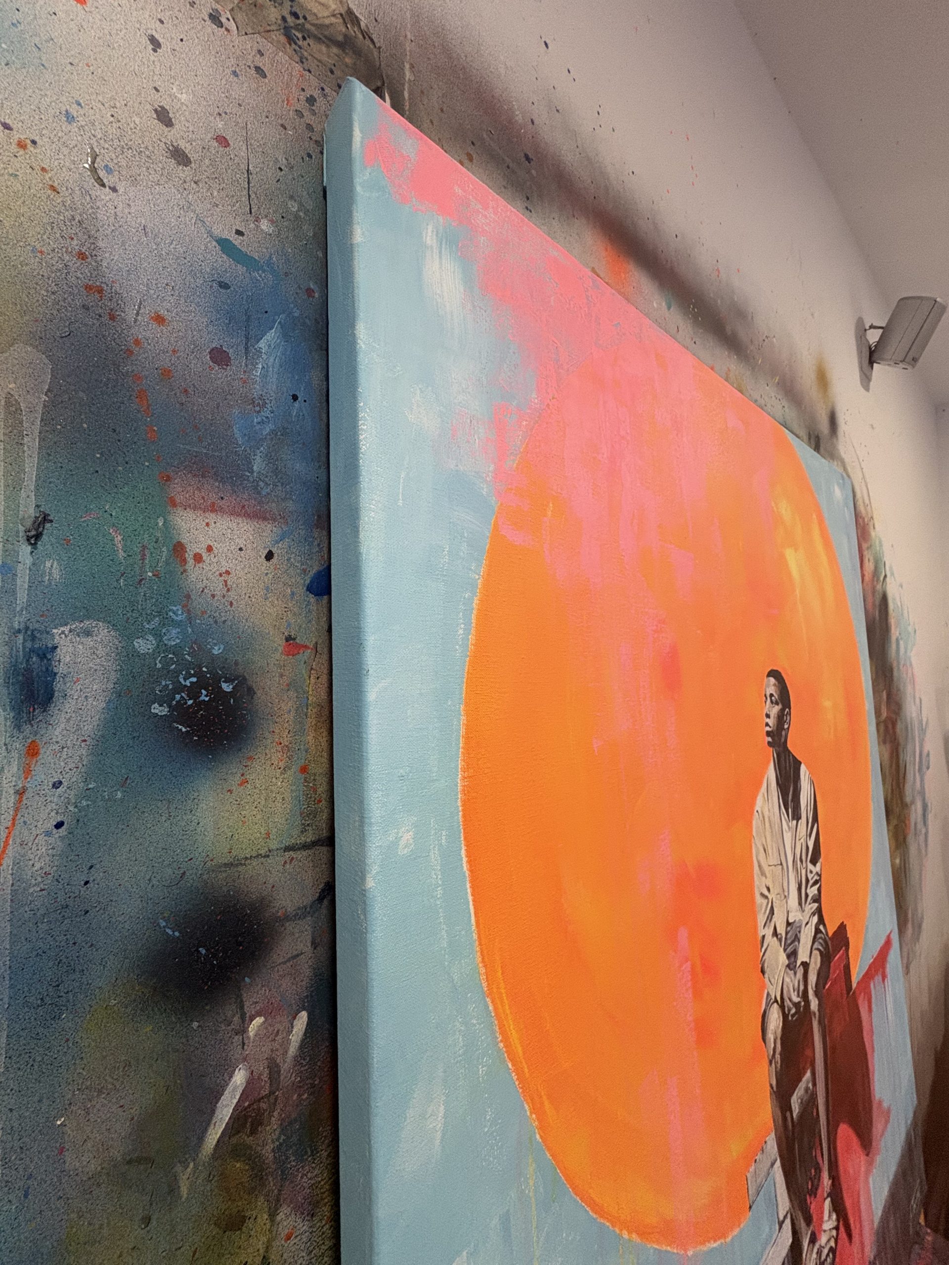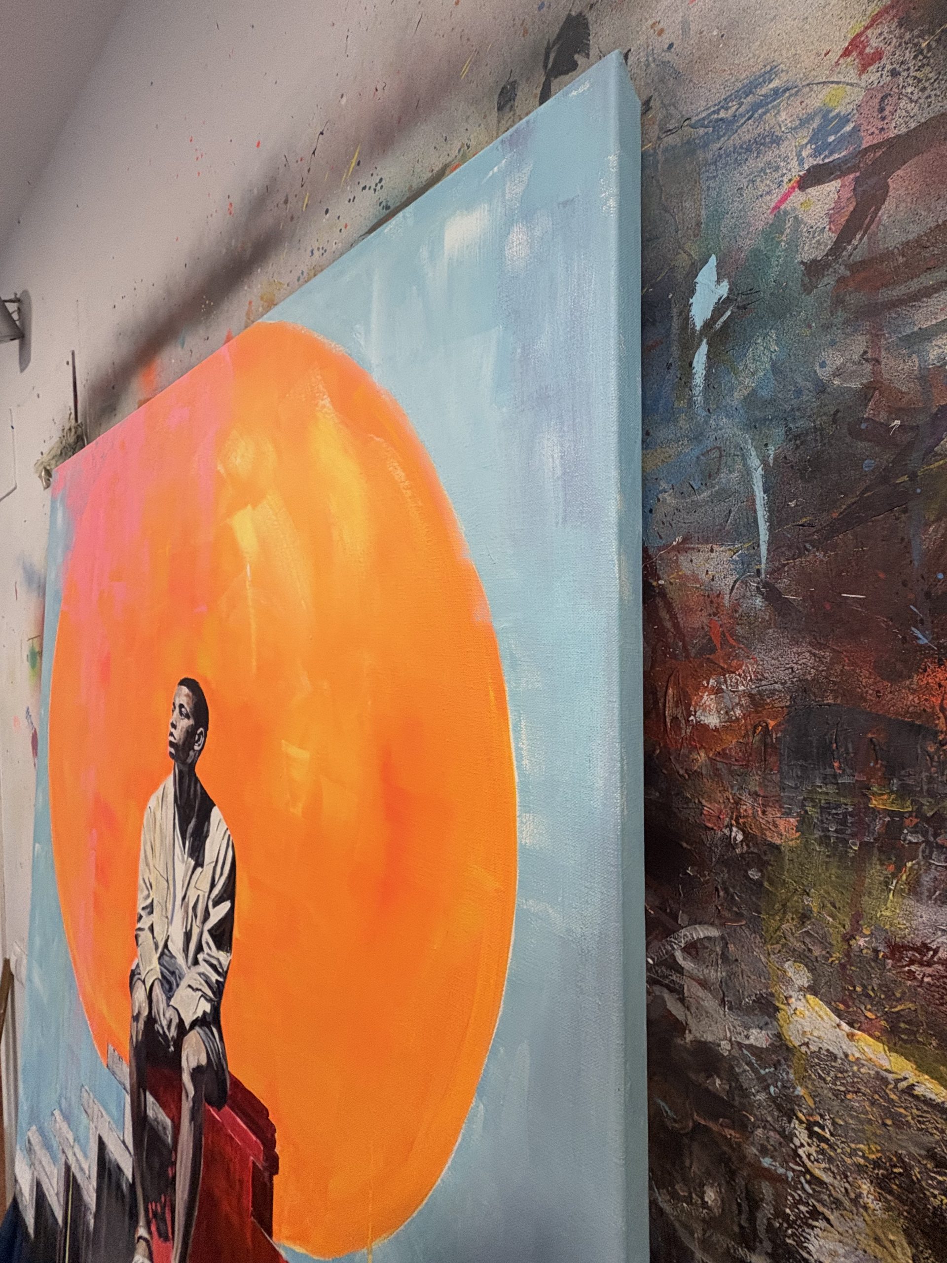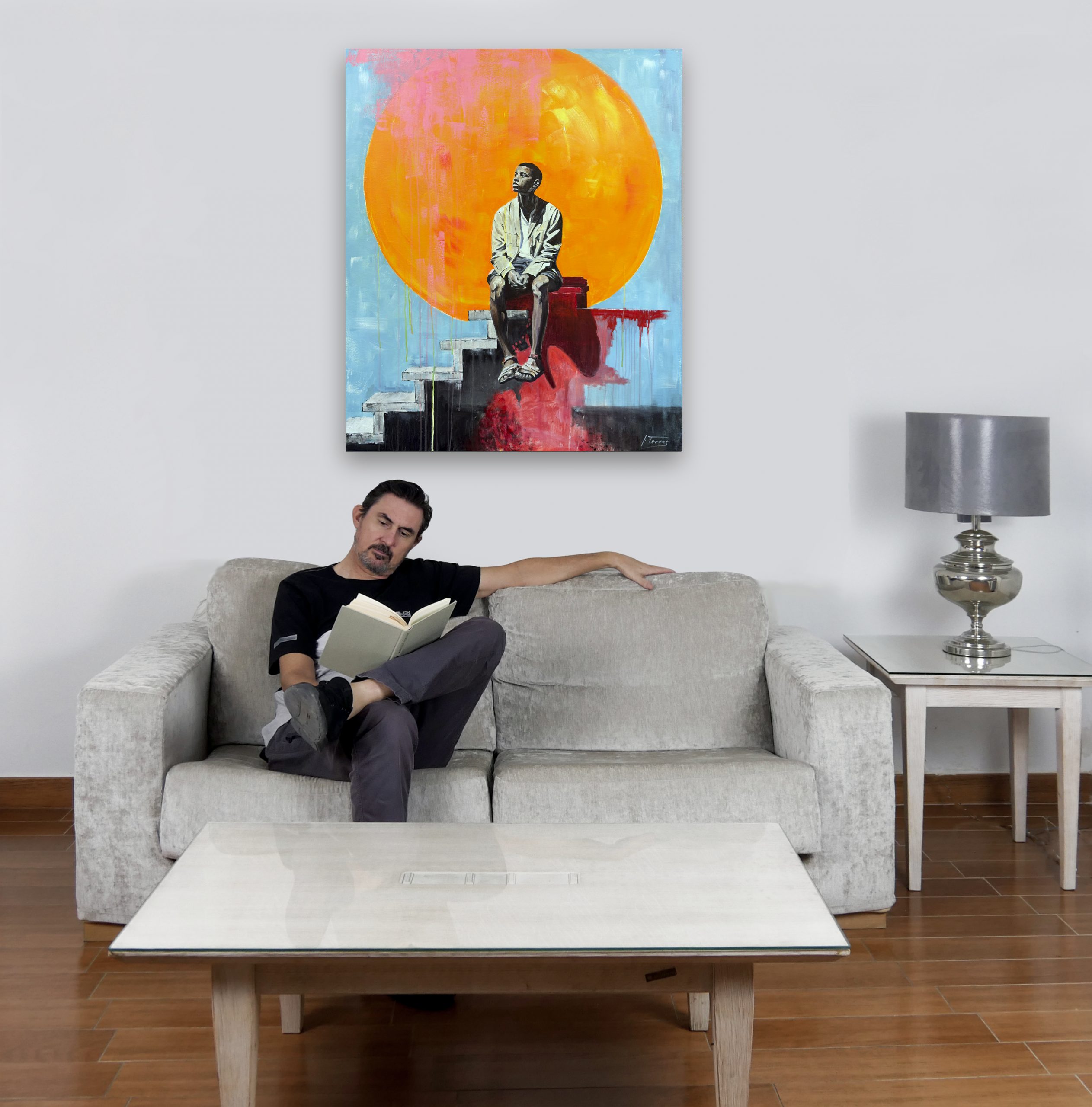 El gran círculo anaranjado que se cierne tras él podría ser un sol naciente o poniente, pero también evoca una presencia poderosa, casi onírica. Su intensidad contrasta con la palidez del cielo y la solidez terrenal de las escaleras. Las pinceladas sueltas y los goteos de pintura que descienden desde el círculo y las escaleras añaden una sensación de movimiento detenido, de una energía contenida.