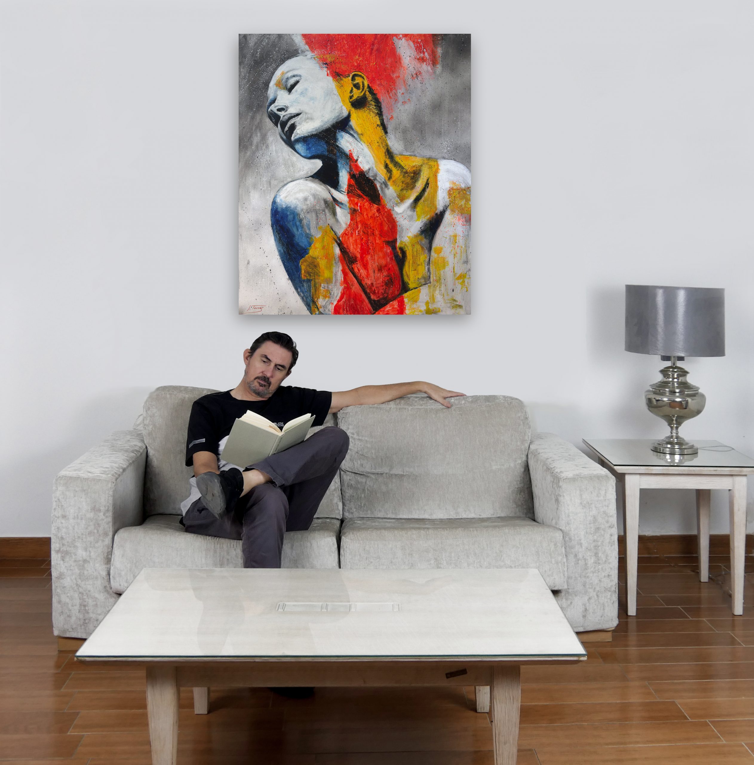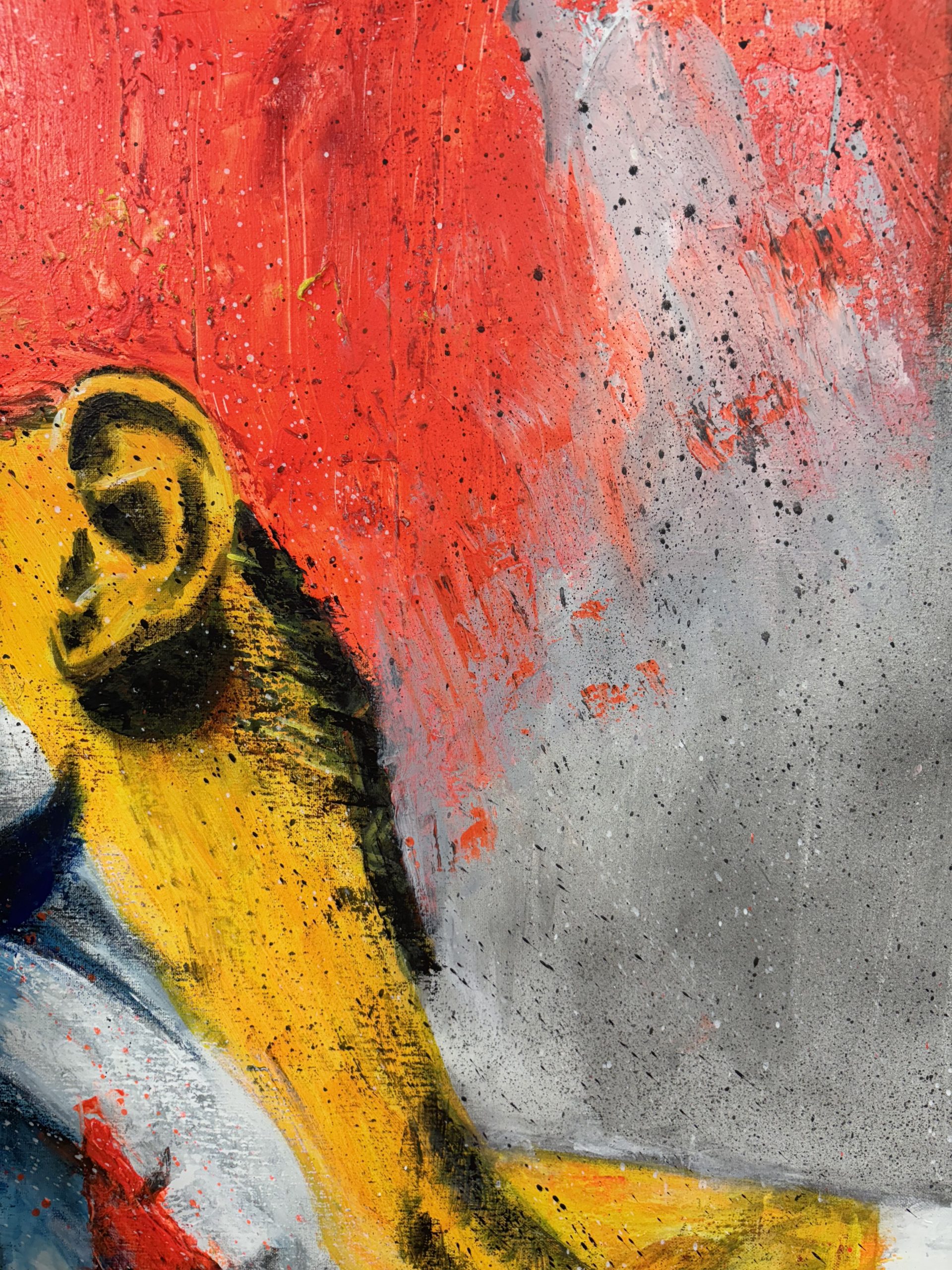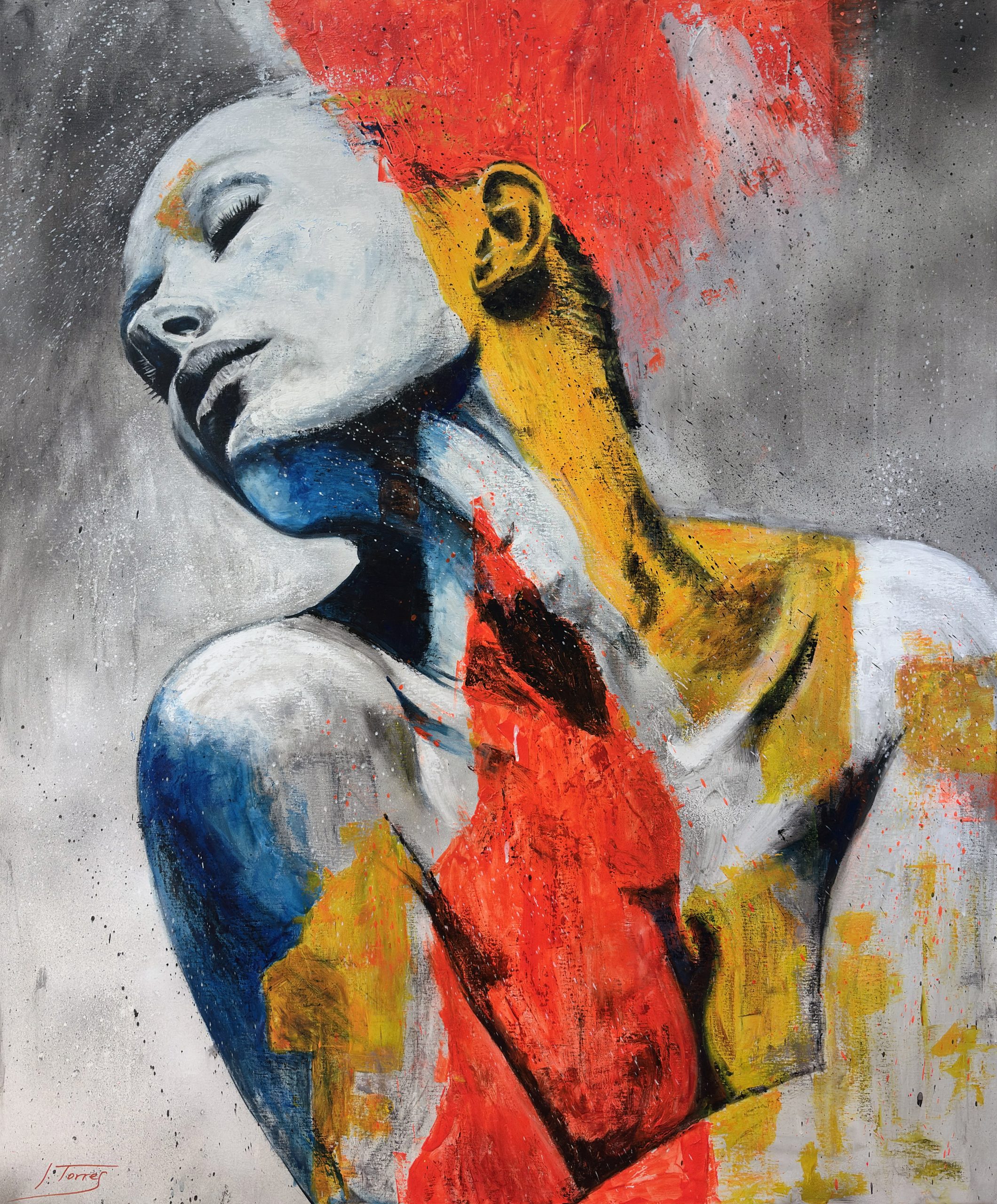 Lo que me parece más interesante, y que ha sido un aspecto clave en la creación de esta obra, es el contraste de colores. Aunque el rostro mantiene un tono blanquecino, que podría interpretarse como una ausencia o una pureza, el resto del cuerpo se ve invadido por pinceladas enérgicas de rojo, azul y amarillo. Estos colores vibrantes, aplicados con una textura casi gestual, rompen la quietud de la figura, como si una fuerza interna, una pasión o una explosión emocional, estuviera emergiendo y transformando a la persona.
