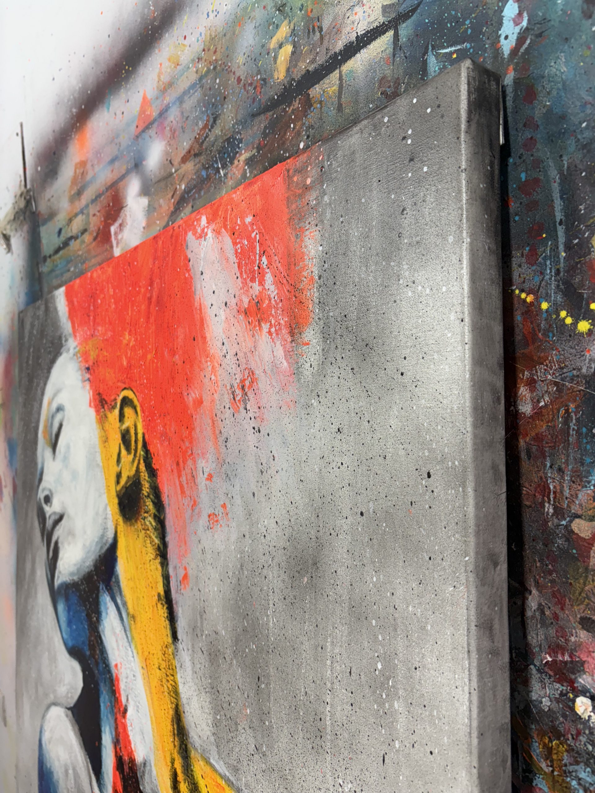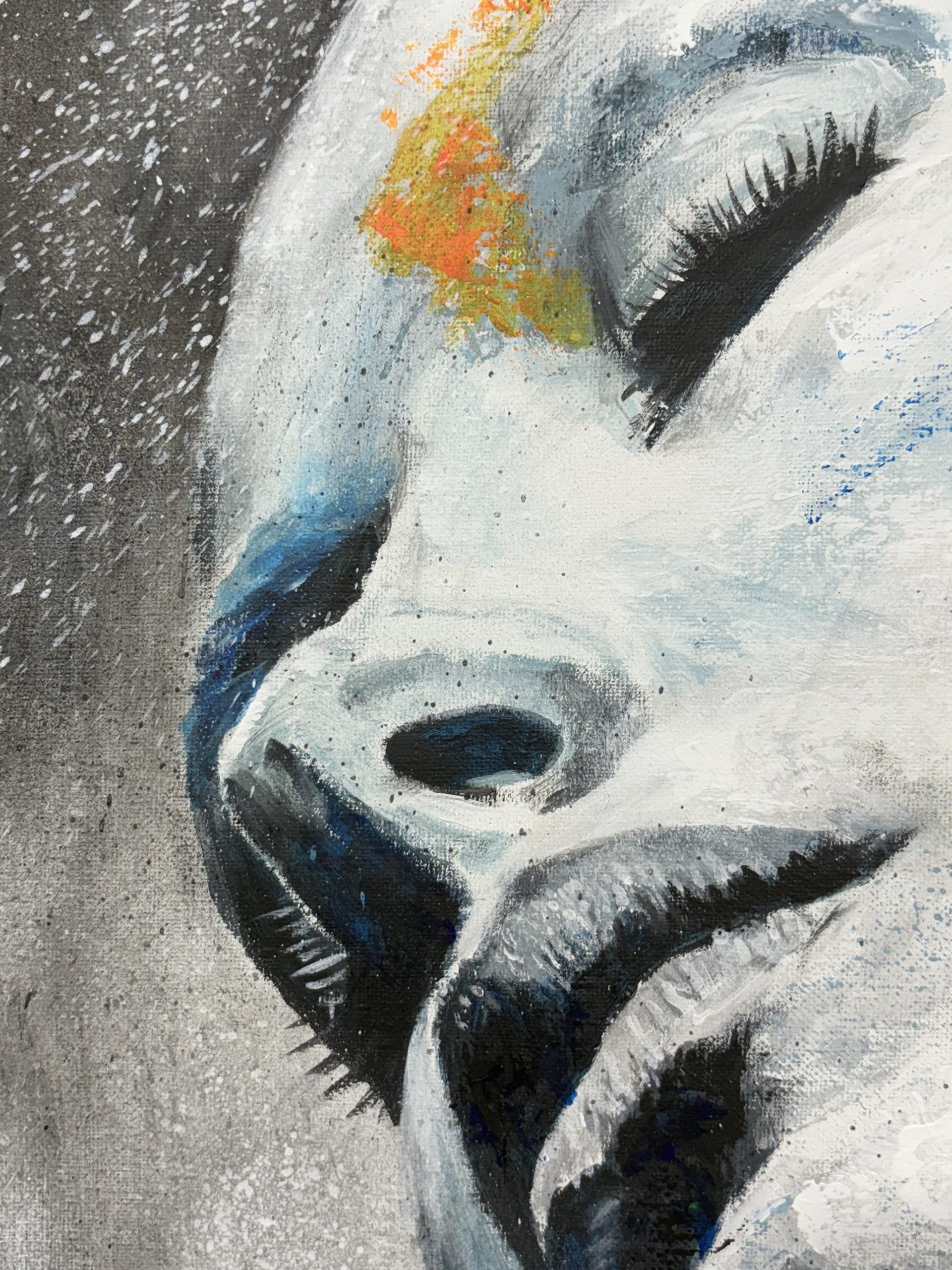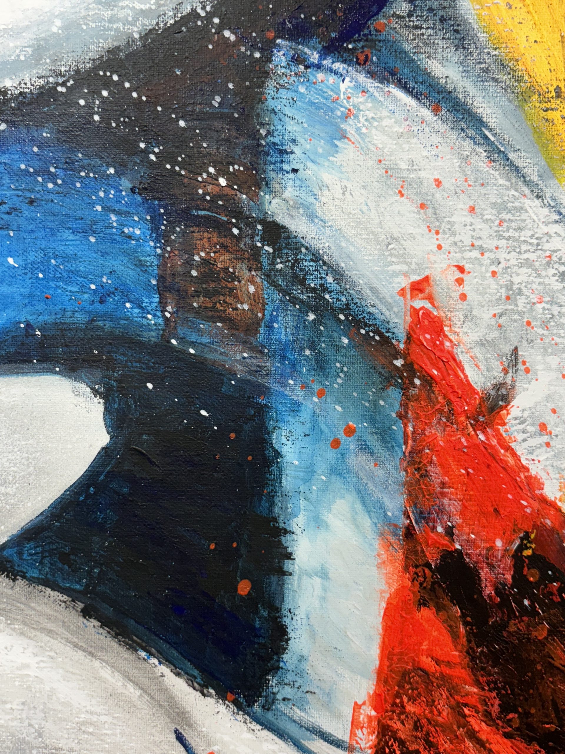 Lo que me parece más interesante, y que ha sido un aspecto clave en la creación de esta obra, es el contraste de colores. Aunque el rostro mantiene un tono blanquecino, que podría interpretarse como una ausencia o una pureza, el resto del cuerpo se ve invadido por pinceladas enérgicas de rojo, azul y amarillo. Estos colores vibrantes, aplicados con una textura casi gestual, rompen la quietud de la figura, como si una fuerza interna, una pasión o una explosión emocional, estuviera emergiendo y transformando a la persona.