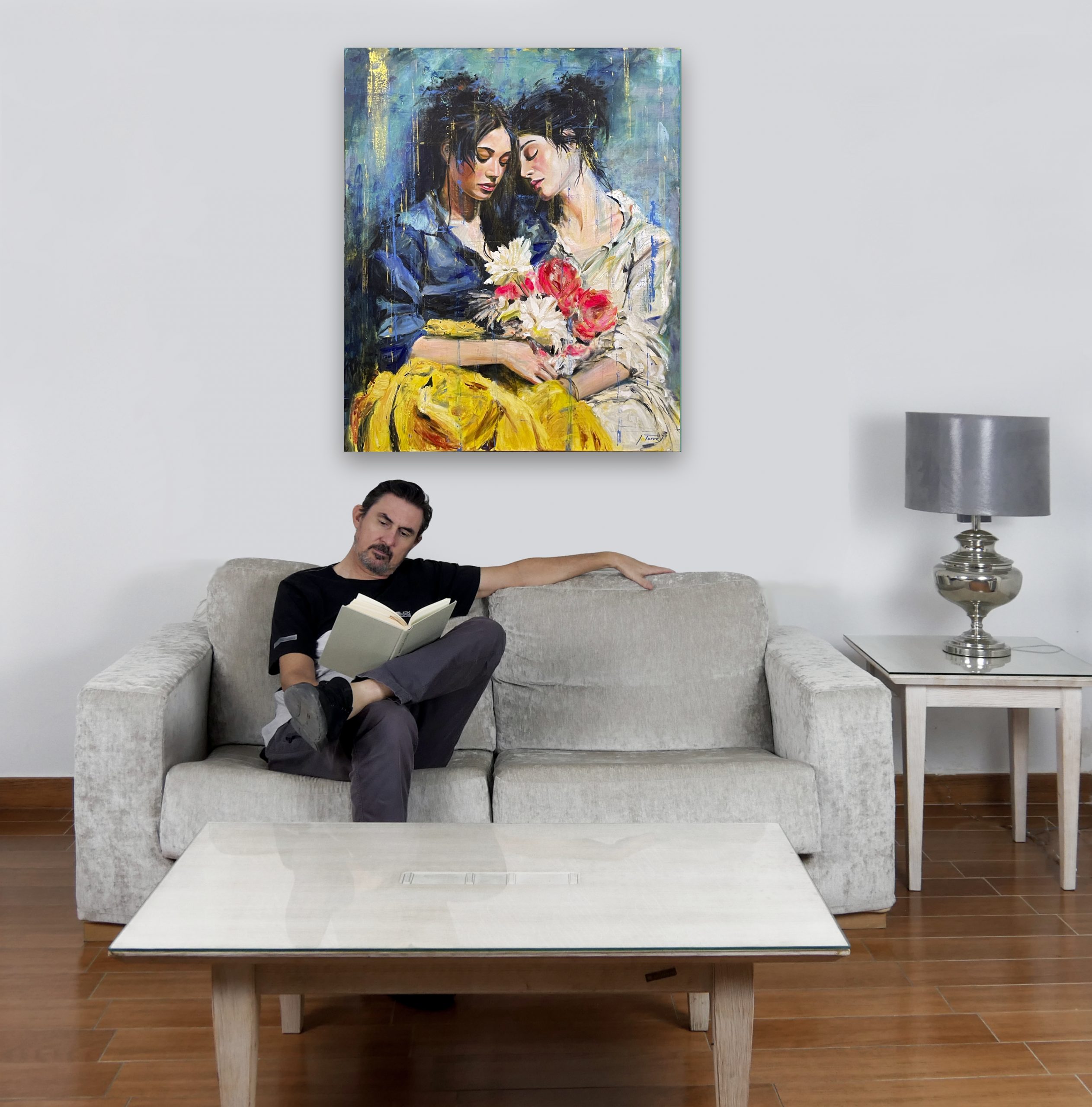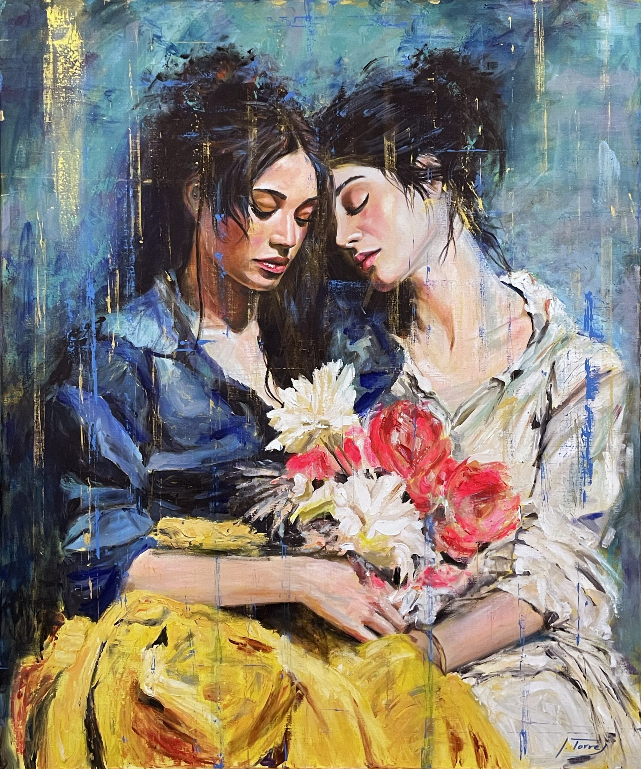 En esta obra, busqué capturar un momento de serenidad y conexión humana a través de colores vibrantes y pinceladas expresivas. Las dos figuras, sumidas en un silencioso diálogo emocional, están envueltas en tonos profundos que contrastan con la luminosidad y la pureza de las flores que sostienen, símbolo de su vínculo y belleza interna. Esta pintura invita a la contemplación y a apreciar la belleza de las relaciones humanas en su más pura expresión.