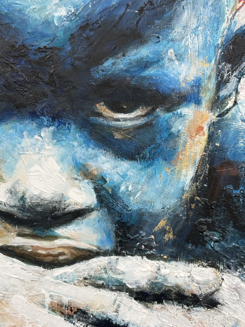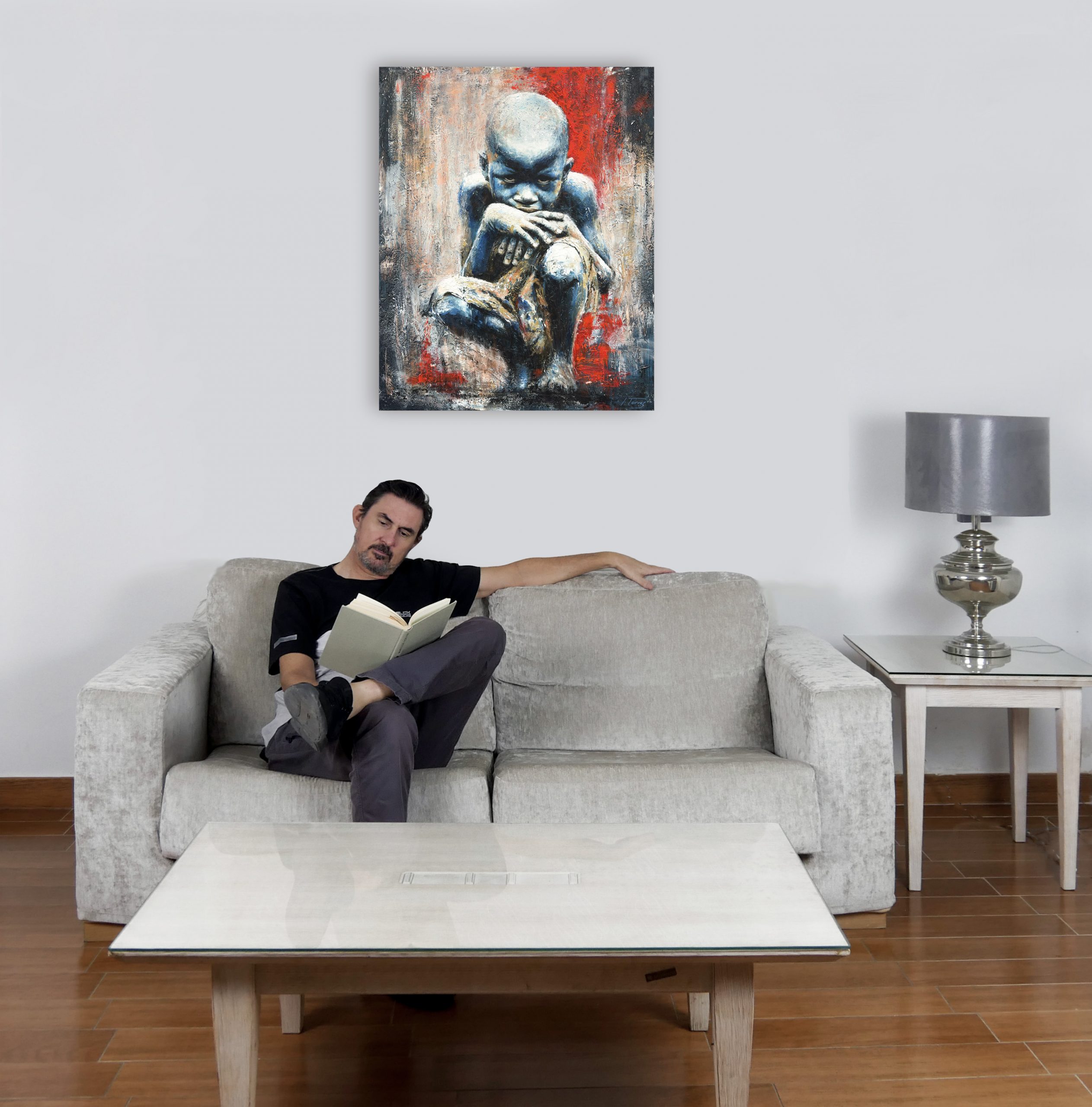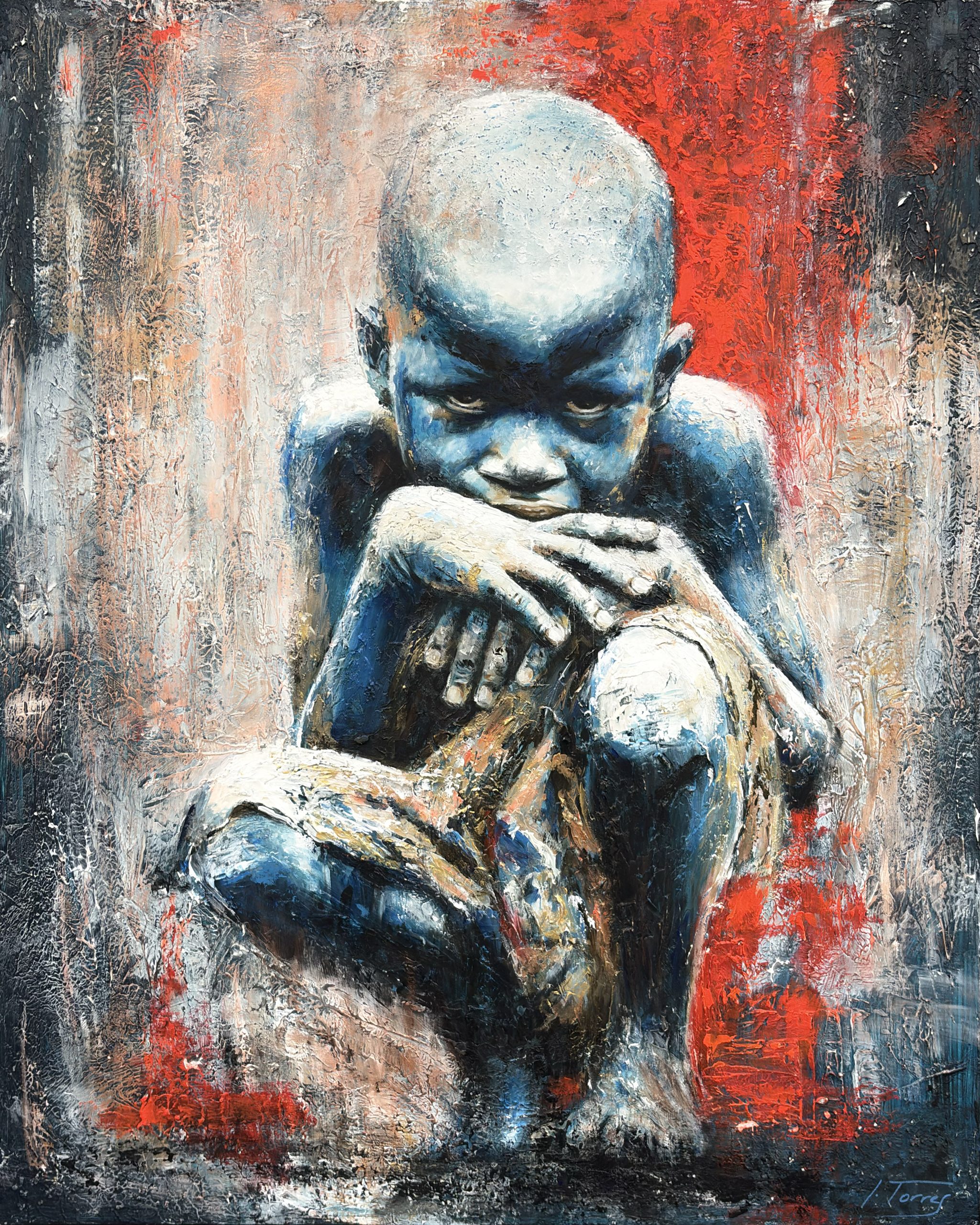 He titulado esta obra El Vigía Silencioso porque entiendo que su inmovilidad es engañosa; no es descanso, es guardia. La figura no está simplemente sentada; está agazapada, ocupando el mínimo espacio posible, convertida en un bloque compacto que se protege a sí mismo. Al pintar esa piel en tonos fríos y azules, busqué despojar al niño de la calidez habitual de la infancia para otorgarle una temperatura distinta: la de quien ha tenido que enfriar sus emociones para resistir el entorno.