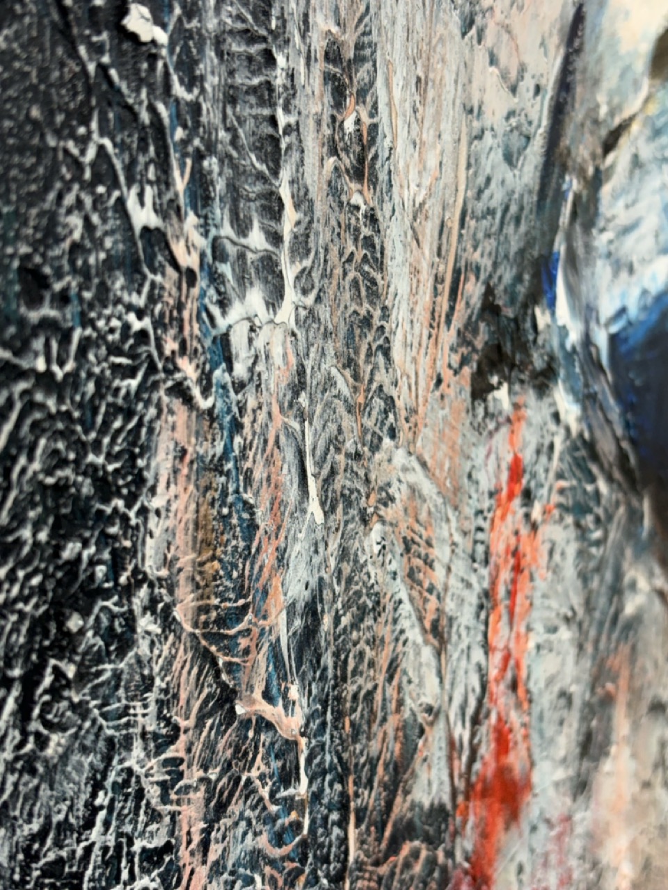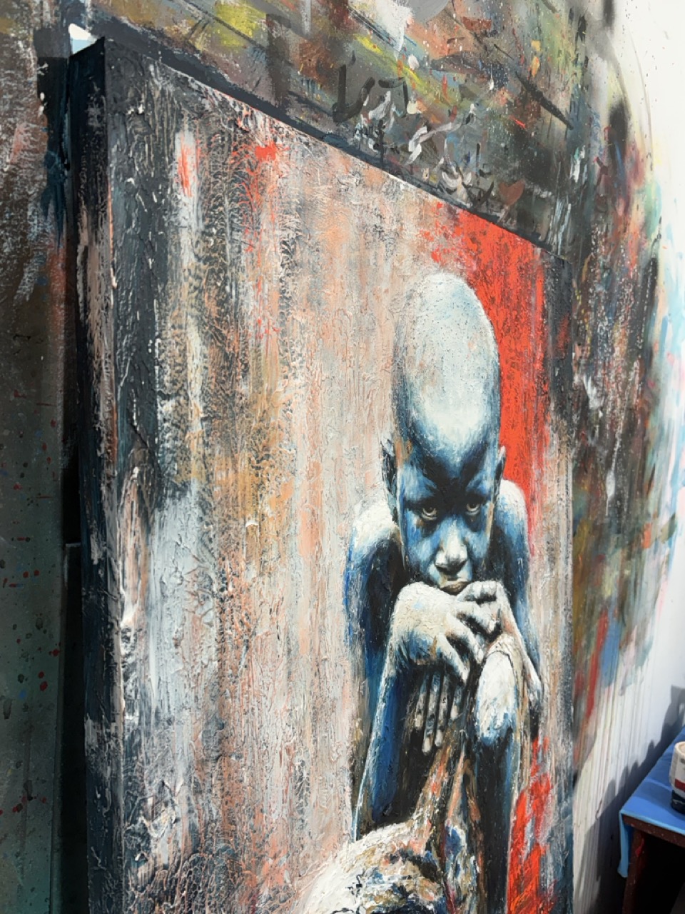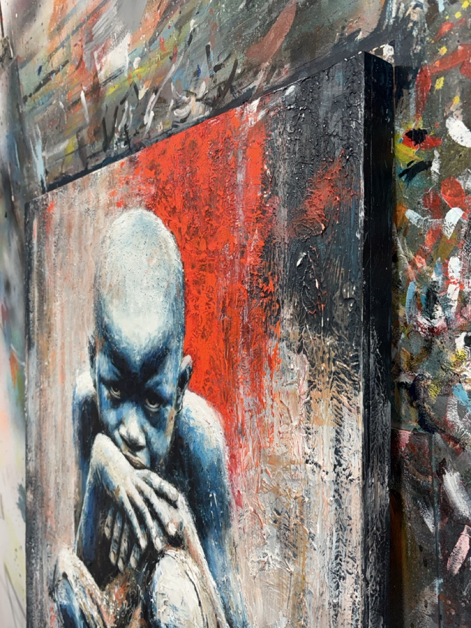 He titulado esta obra El Vigía Silencioso porque entiendo que su inmovilidad es engañosa; no es descanso, es guardia. La figura no está simplemente sentada; está agazapada, ocupando el mínimo espacio posible, convertida en un bloque compacto que se protege a sí mismo. Al pintar esa piel en tonos fríos y azules, busqué despojar al niño de la calidez habitual de la infancia para otorgarle una temperatura distinta: la de quien ha tenido que enfriar sus emociones para resistir el entorno.