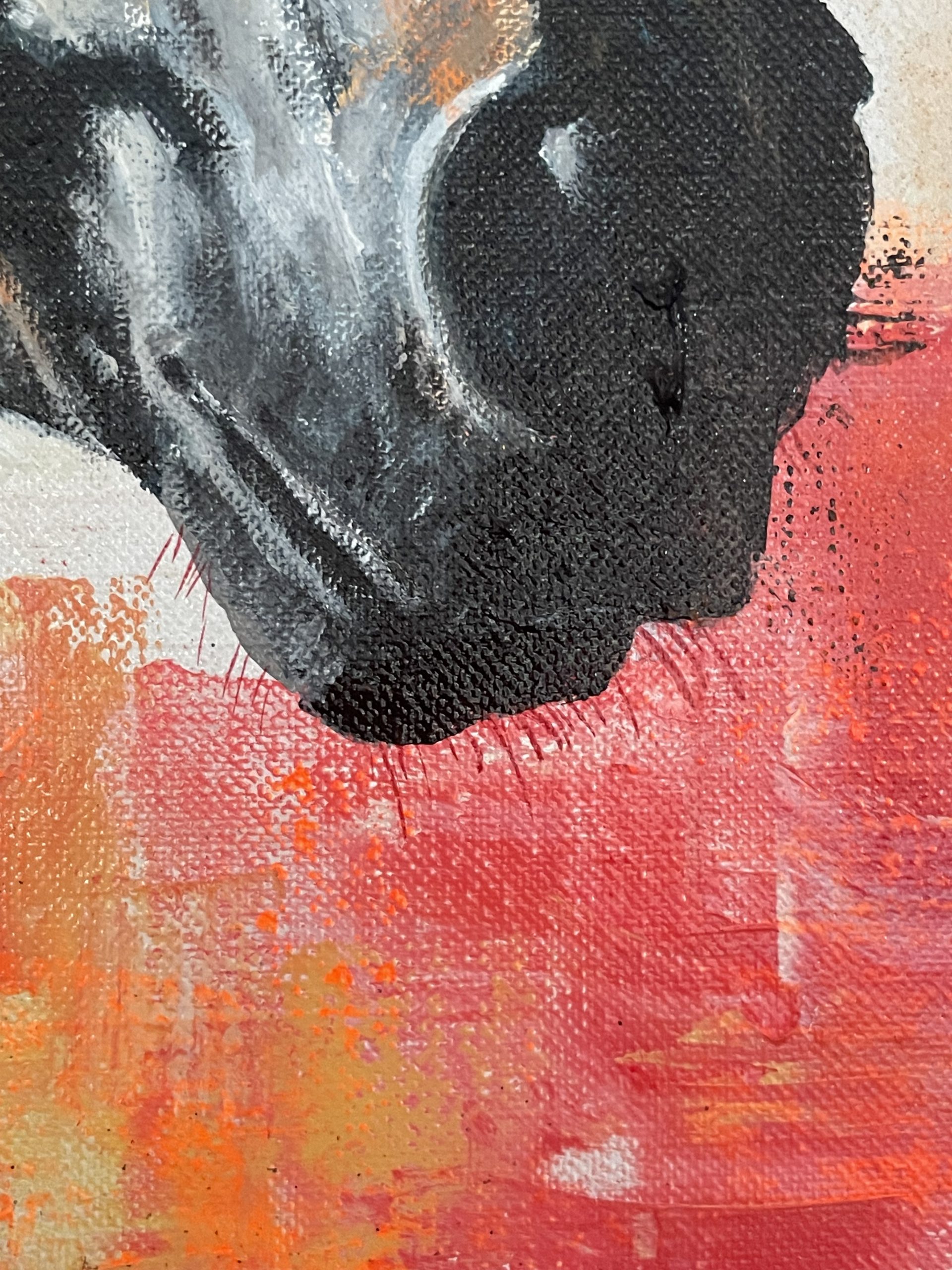 “Equino” es una obra que captura la esencia y el espíritu del caballo a través de una fusión de realismo y abstracción moderna. He utilizado una técnica expresiva, donde los detalles del rostro y el cuello del caballo se destacan con un contraste marcado entre tonos negros y blancos. Este enfoque resalta la nobleza y la fuerza del animal.