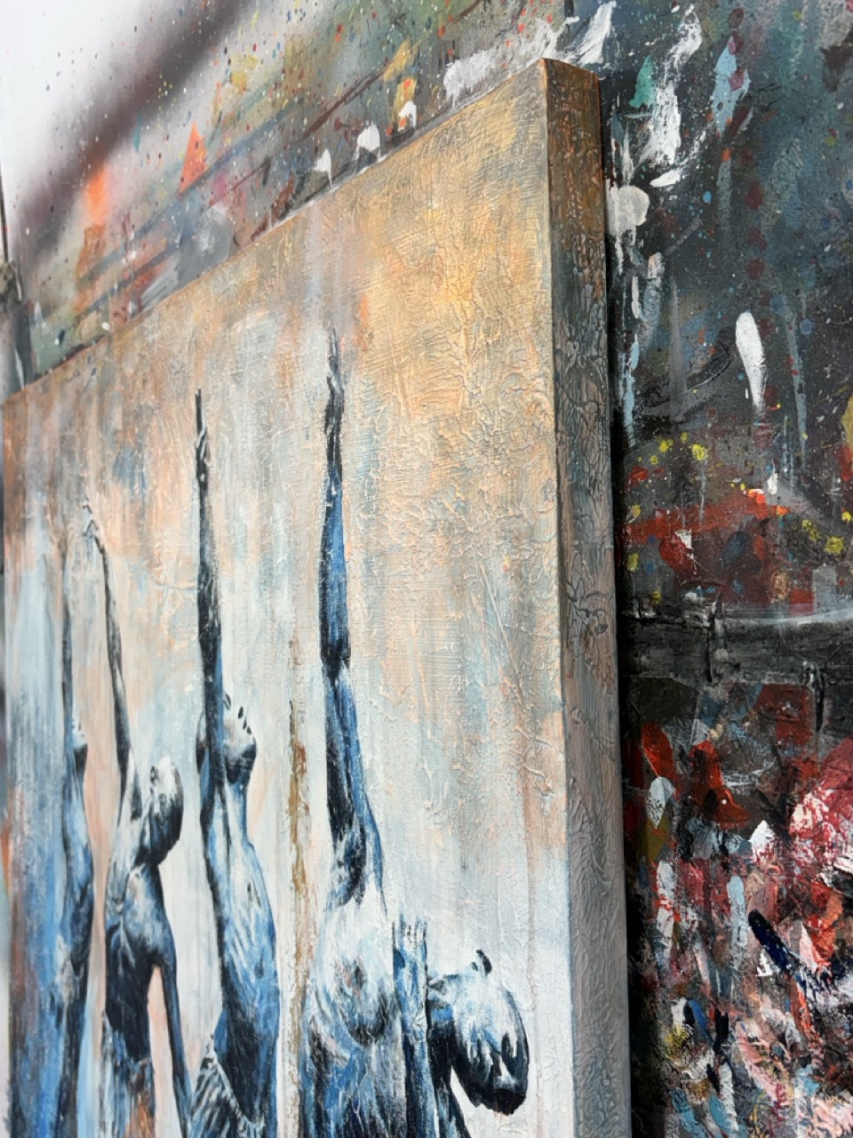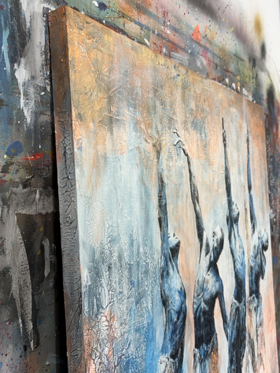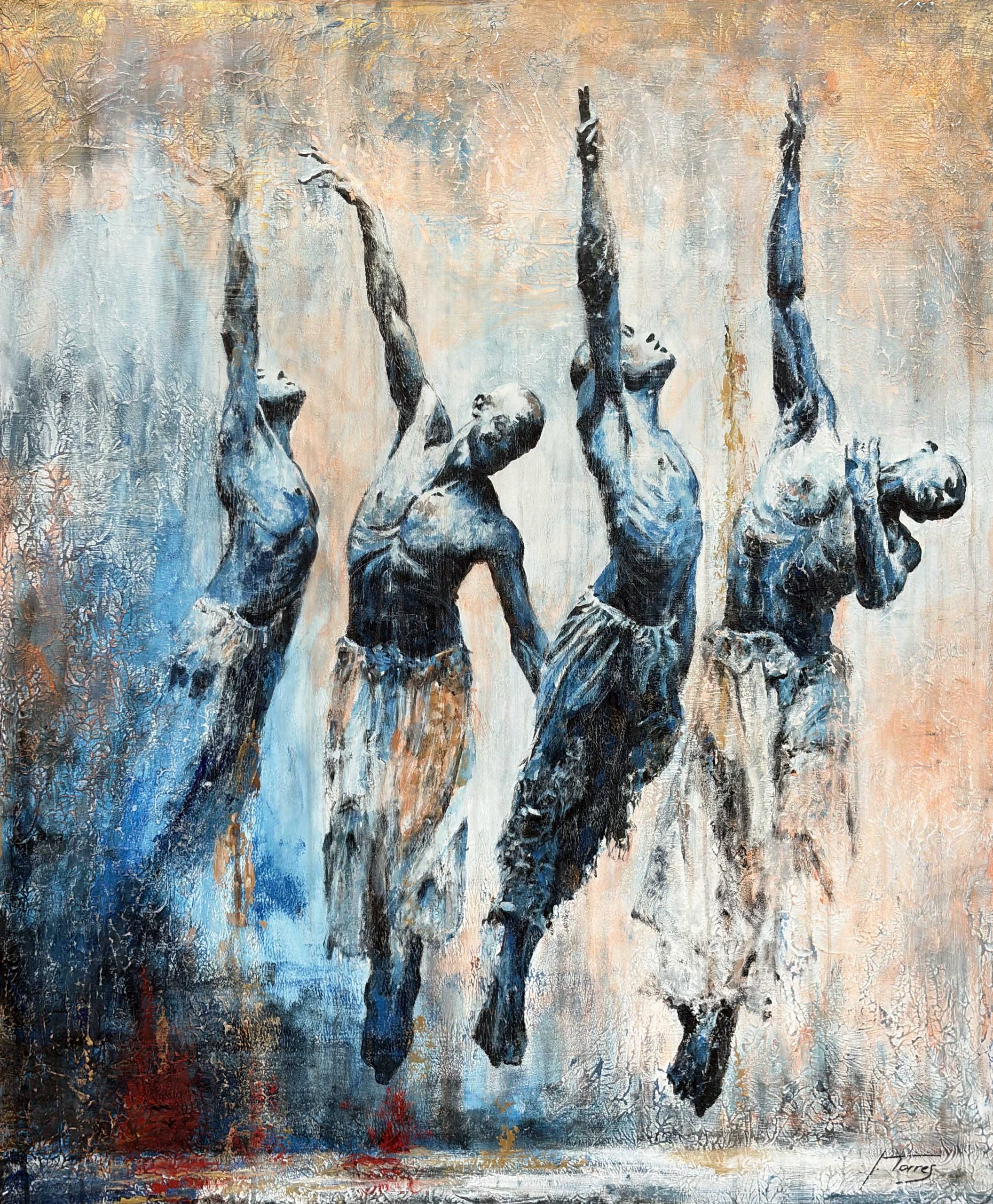 El entorno que los envuelve se percibe espeso, agrietado, convirtiendo el acto de subir en un ejercicio de pura resistencia. Las manos se estiran buscando quebrar el límite superior, persiguiendo un vacío que sea capaz de sostenerlas. Lo que late en esta imagen es una paradoja fundamental: la forma humana habitando su carga irremediable, librando una batalla silenciosa y feroz para transmutarse, aunque sea por una fracción de segundo, en aire.