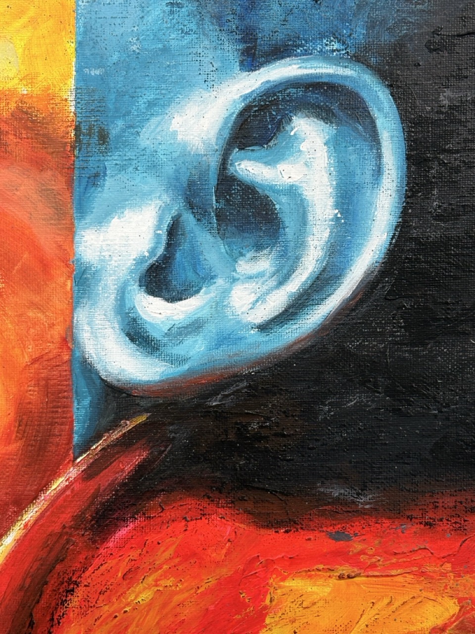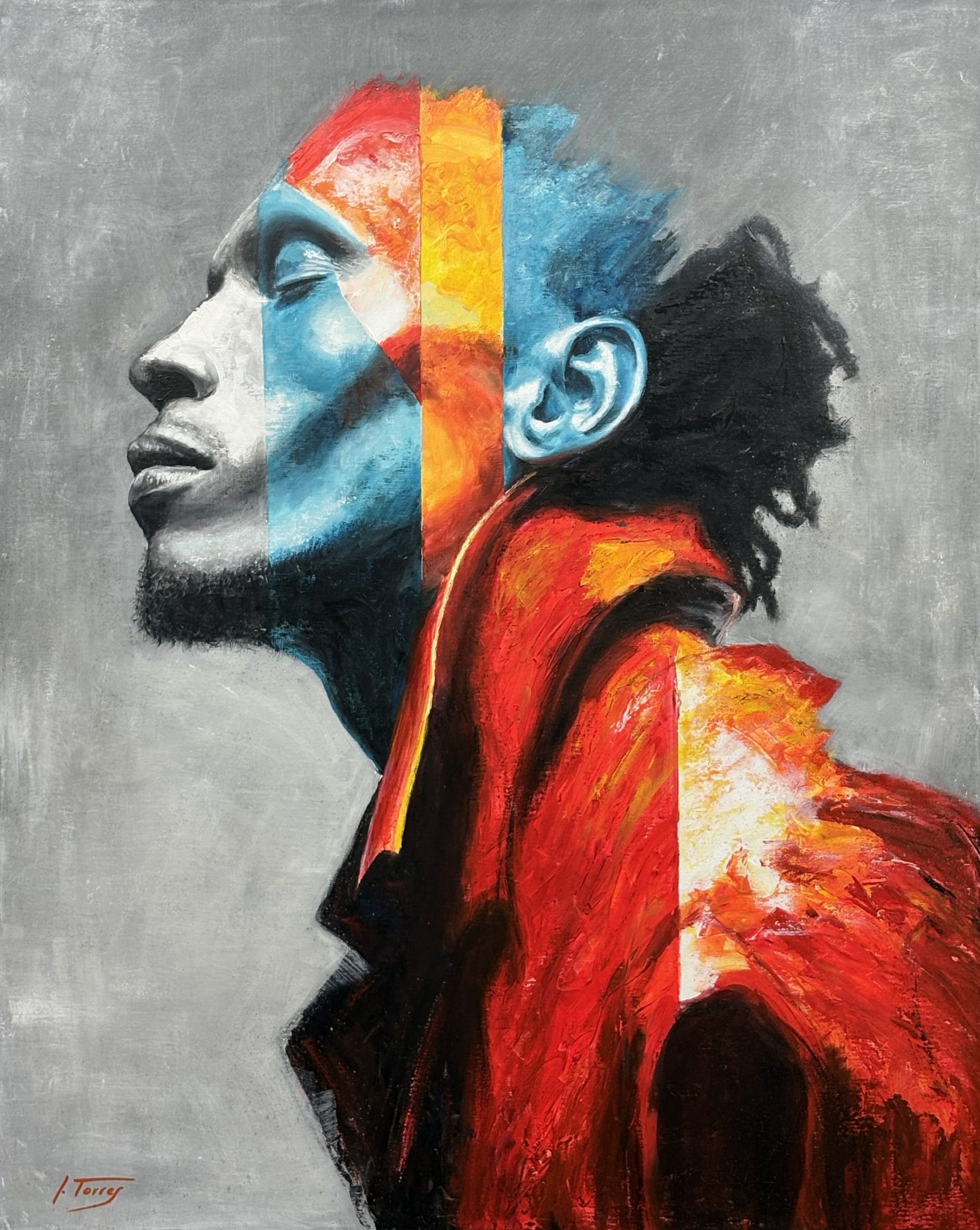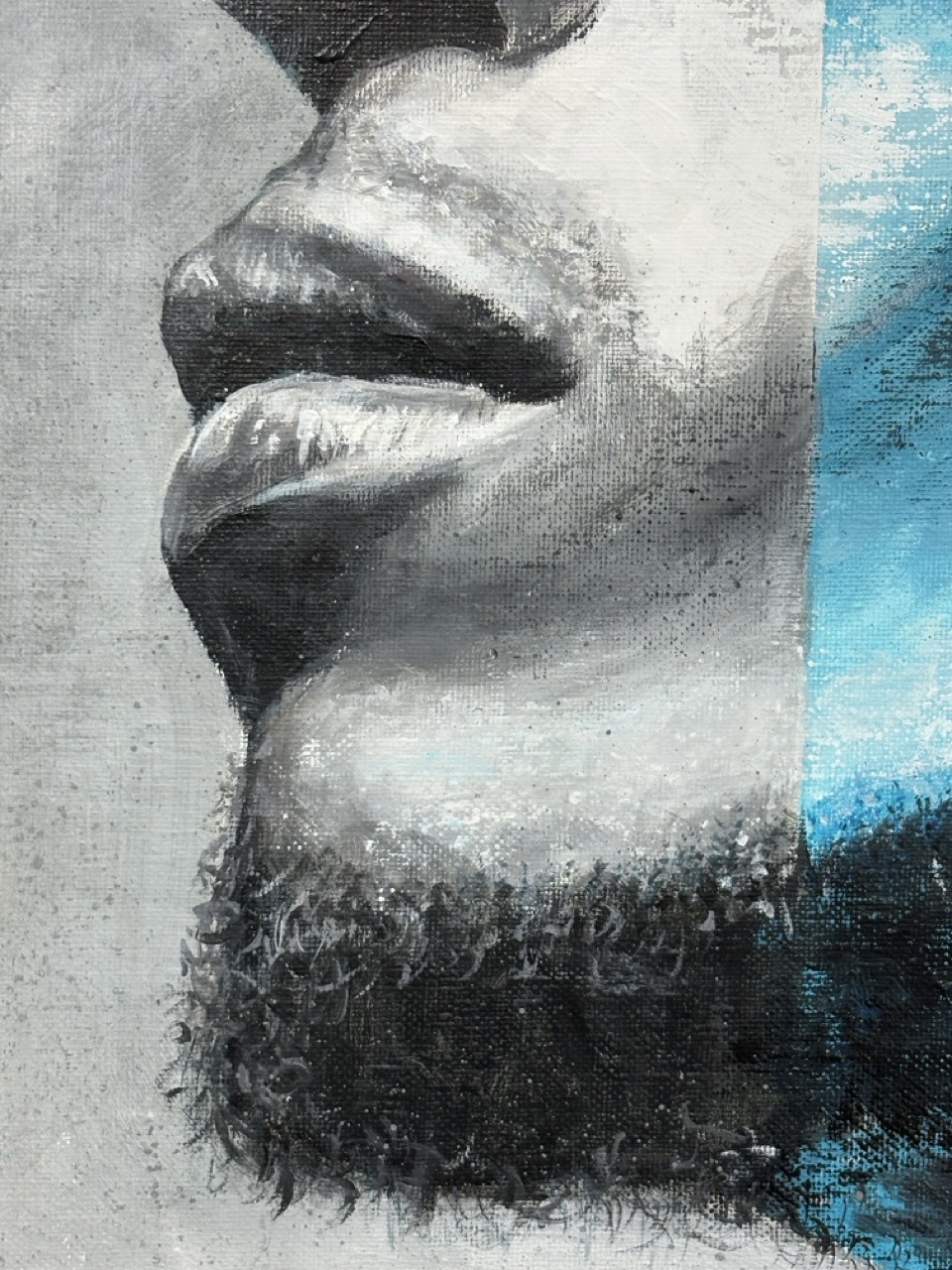 La historia de este cuadro es interna. El protagonista tiene los ojos cerrados, no porque esté dormido, sino porque se está aislando del ruido exterior. Esa barbilla ligeramente elevada muestra dignidad, pero también una especie de entrega. Es el retrato de alguien que está buscando aire, preparándose para enfrentar algo que le asusta o le desafía.