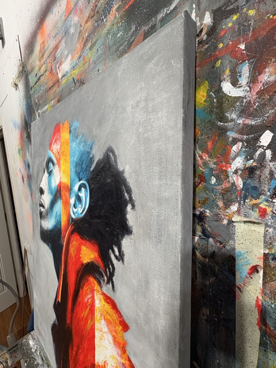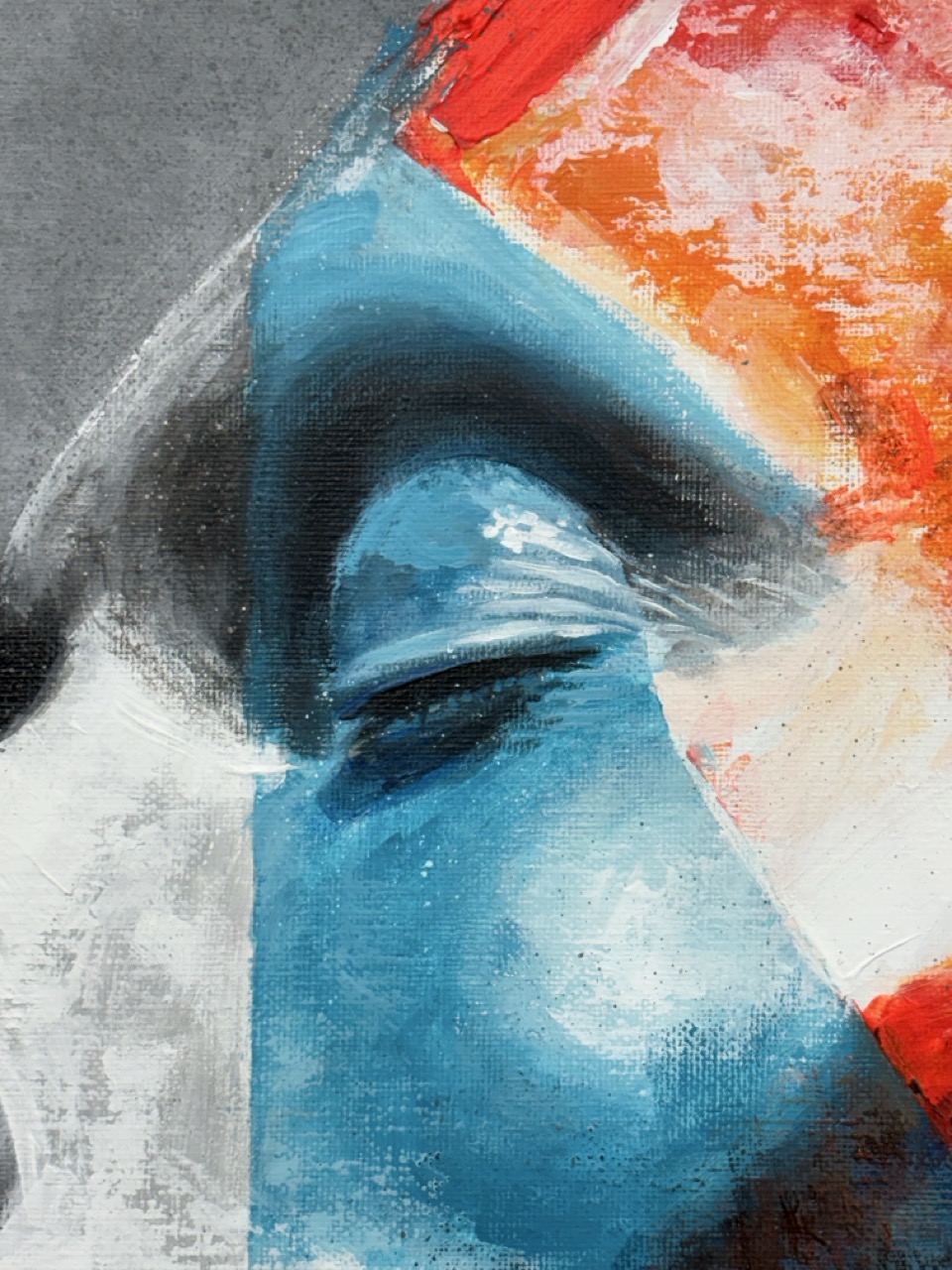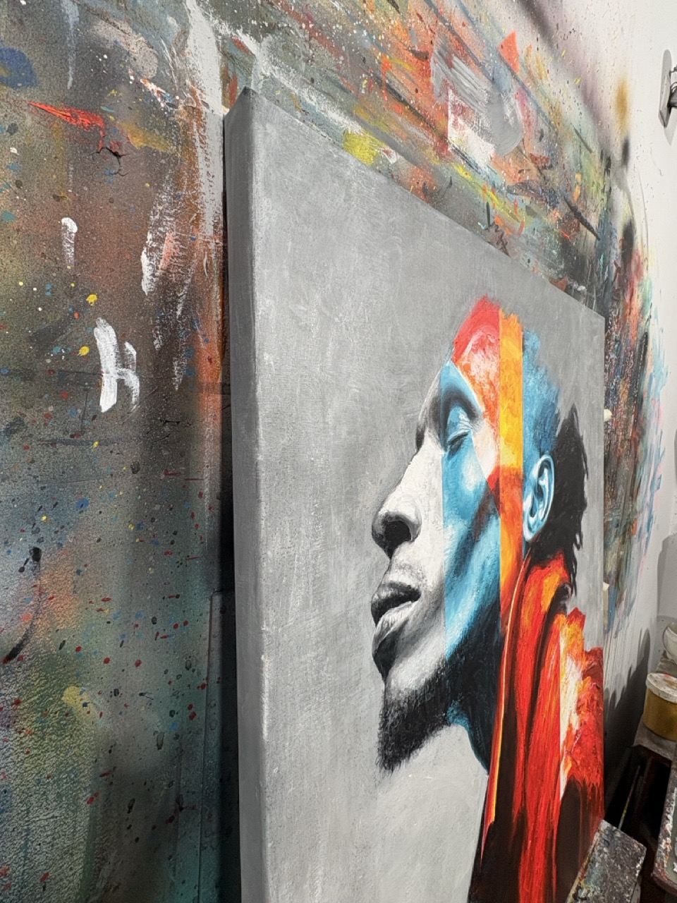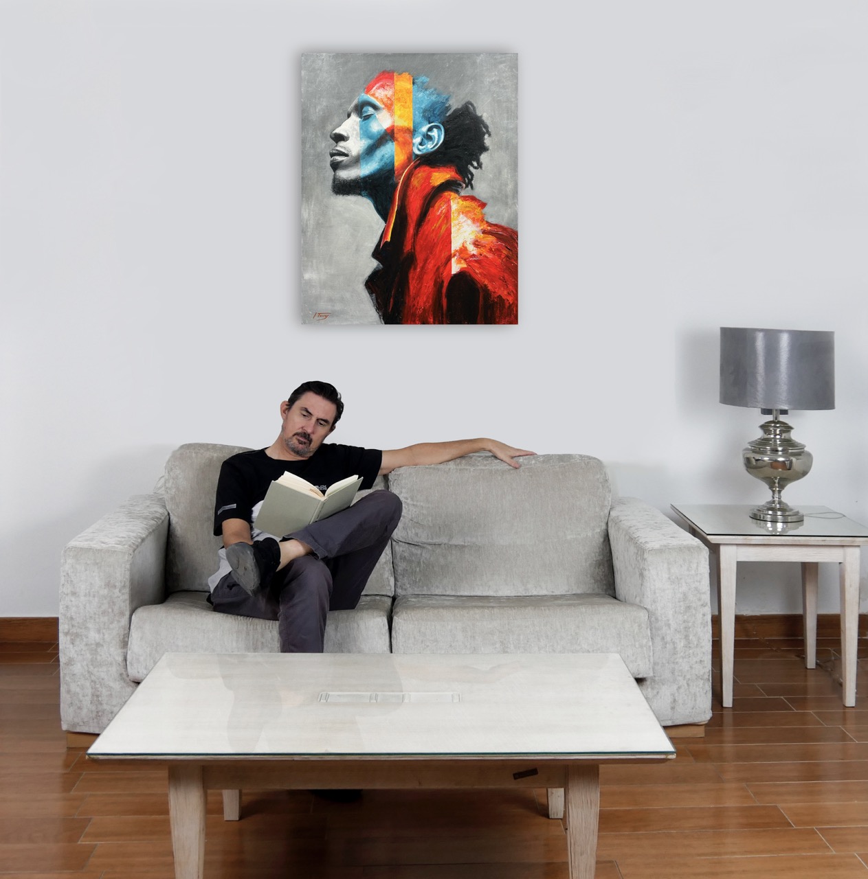 La dualidad aquí es clave para entender la emoción de la obra. Por un lado, tengo la serenidad casi estatuaria de su perfil en grises, que representa el control, la lógica y la calma que intentamos mantener. Pero esa calma está siendo invadida —o quizás alimentada— por esa explosión de color.