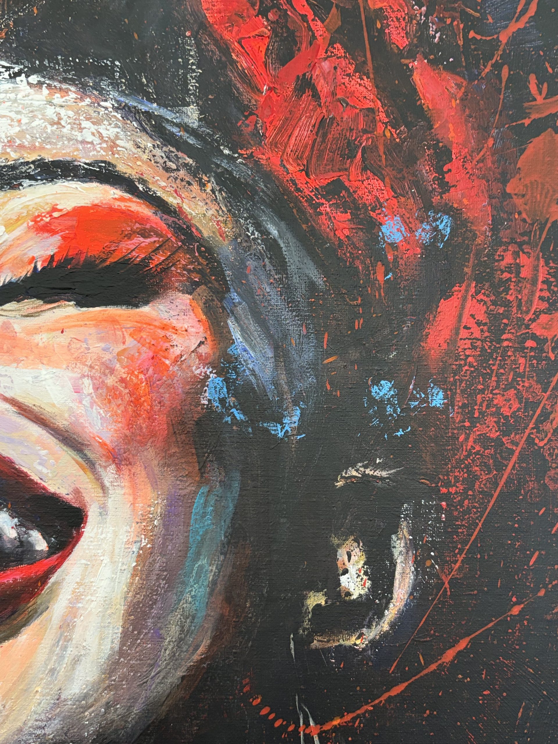 Al contemplar esta pieza, lo primero que atrapa es esa explosión de alegría tan genuina. No es una sonrisa posada, sino una risa que parece brotar desde muy adentro, iluminando todo el rostro. Es un intento de capturar ese instante fugaz, casi como si hubiéramos pillado a la protagonista en un momento de felicidad despreocupada.