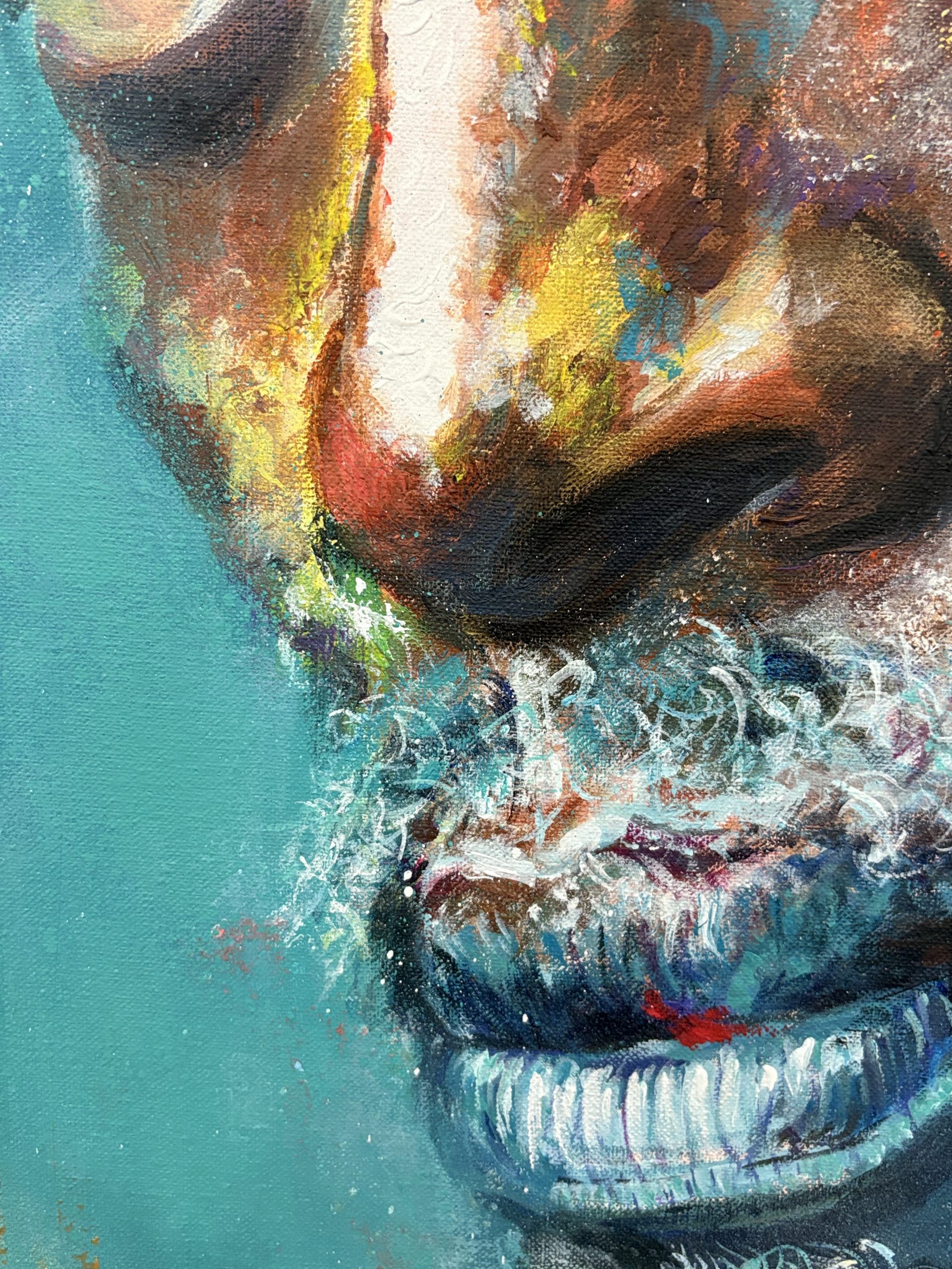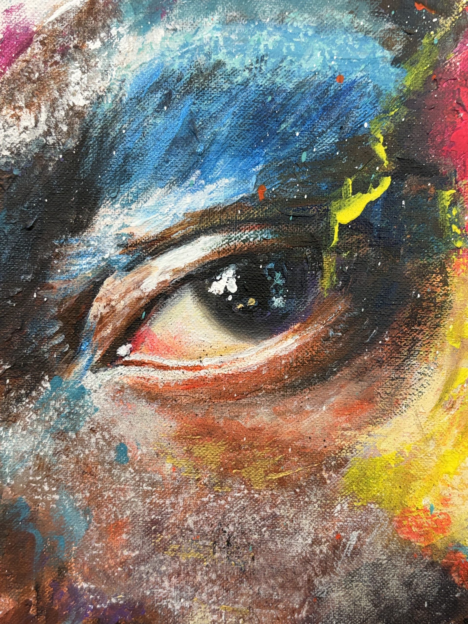 Su piel tiene la textura de la tierra, del carbón, de algo primigenio. Sobre esa base sólida y oscura, la pintura estalla. Esos toques vibrantes de amarillo, magenta, cian y azul no están puestos al azar. Para mí, son la explosión de todo lo que guarda en su interior. Son las historias, las ideas, las emociones y los conocimientos que se derraman desde su espíritu. No quería que el color estuviera simplemente sobre él, sino que pareciera emanar de él.