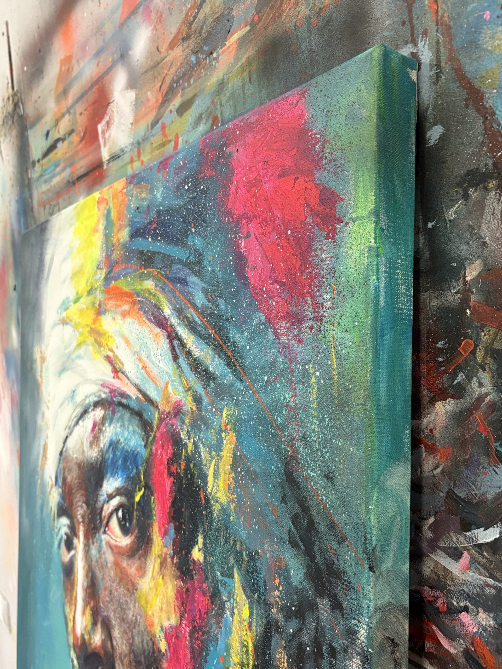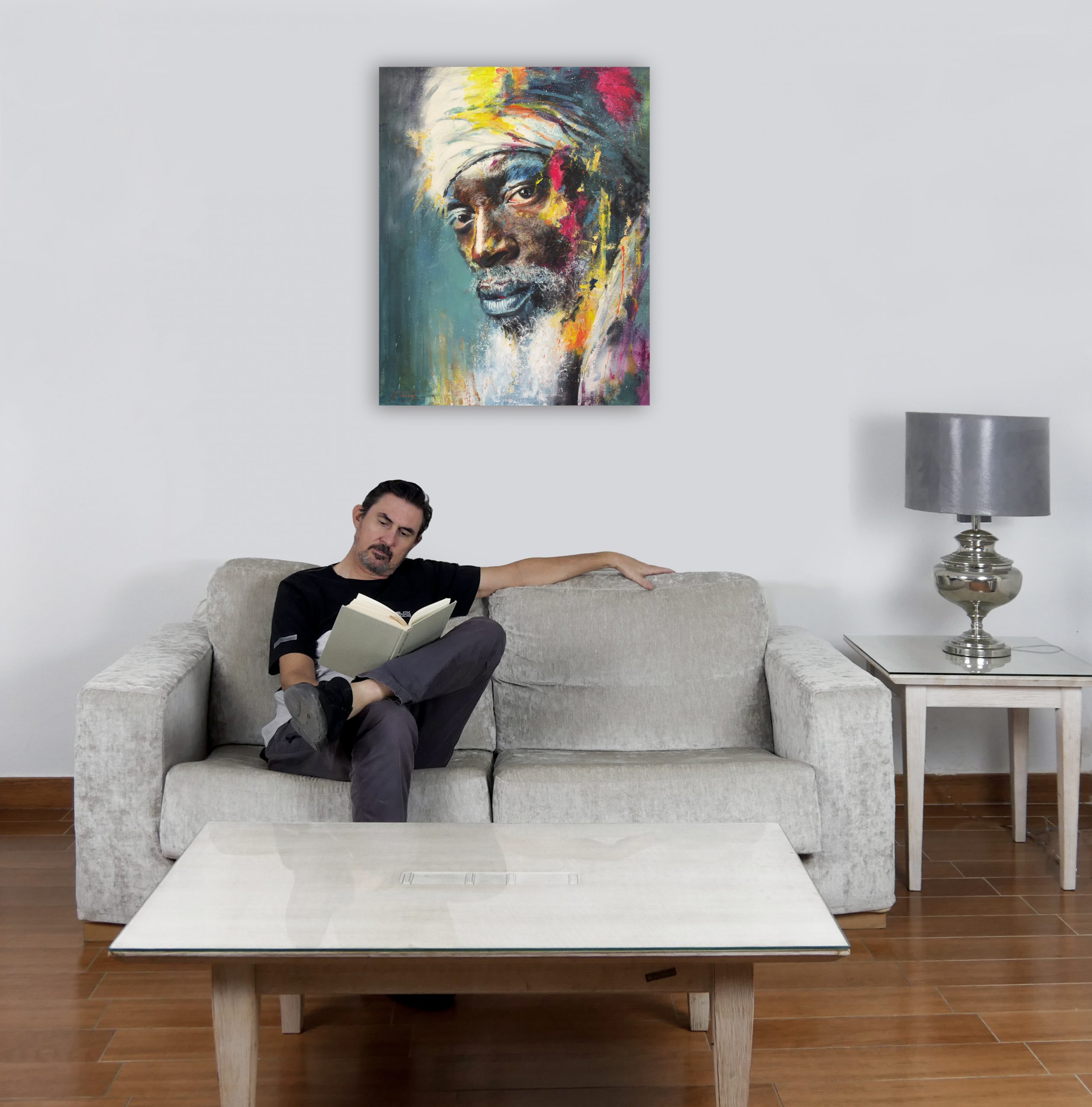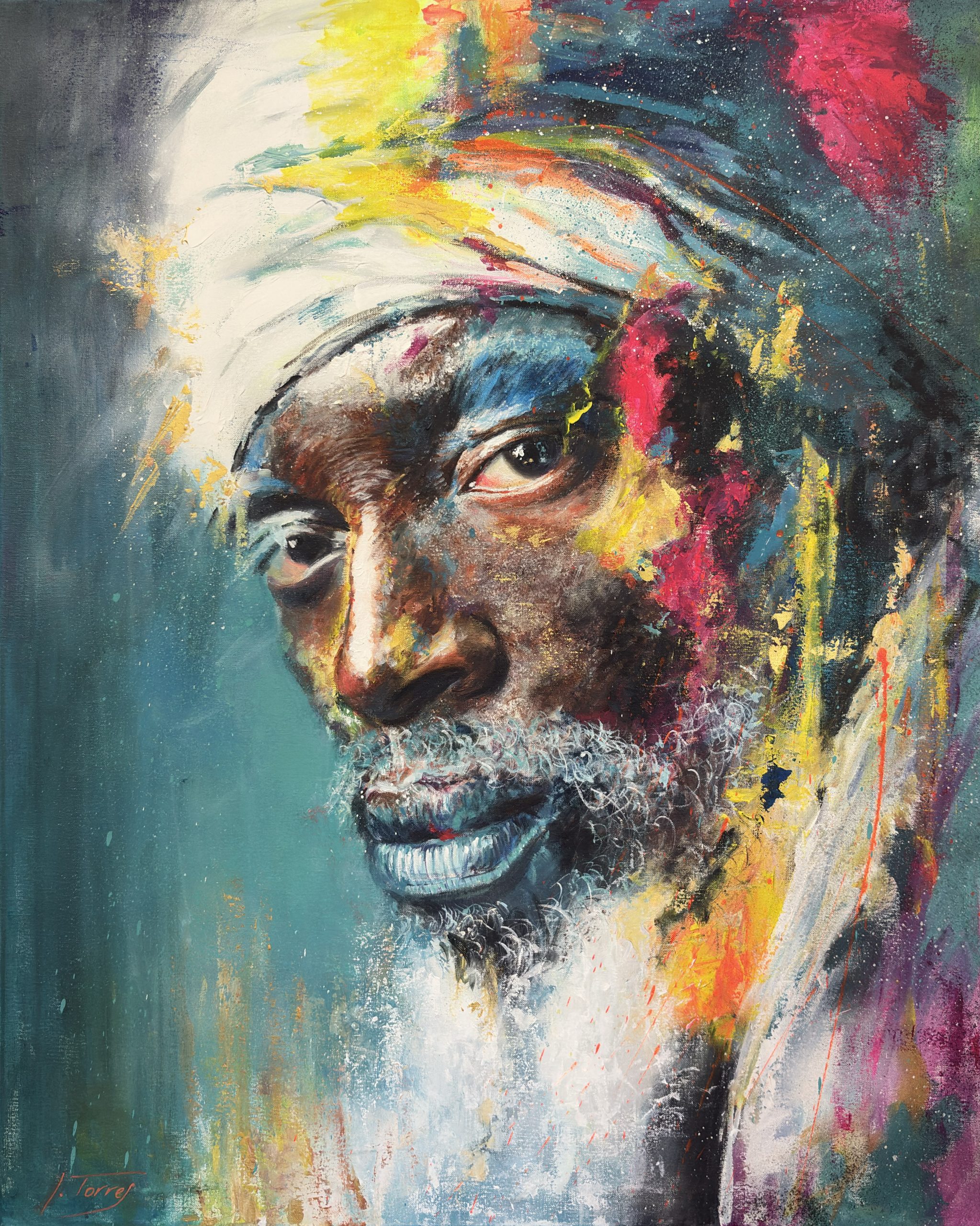 Me pregunto qué historias podría contar. Quizás cada salpicadura de color es un recuerdo: el amarillo del sol del desierto en su juventud, el rosa de un amor perdido, el azul profundo de una noche estrellada en la que comprendió algún secreto del universo. Su barba no parece hecha de pelo, sino de partículas de luz o de sabiduría cristalizada. El turbante que le envuelve la cabeza no es solo tela, sino una corona que recoge las experiencias vividas.