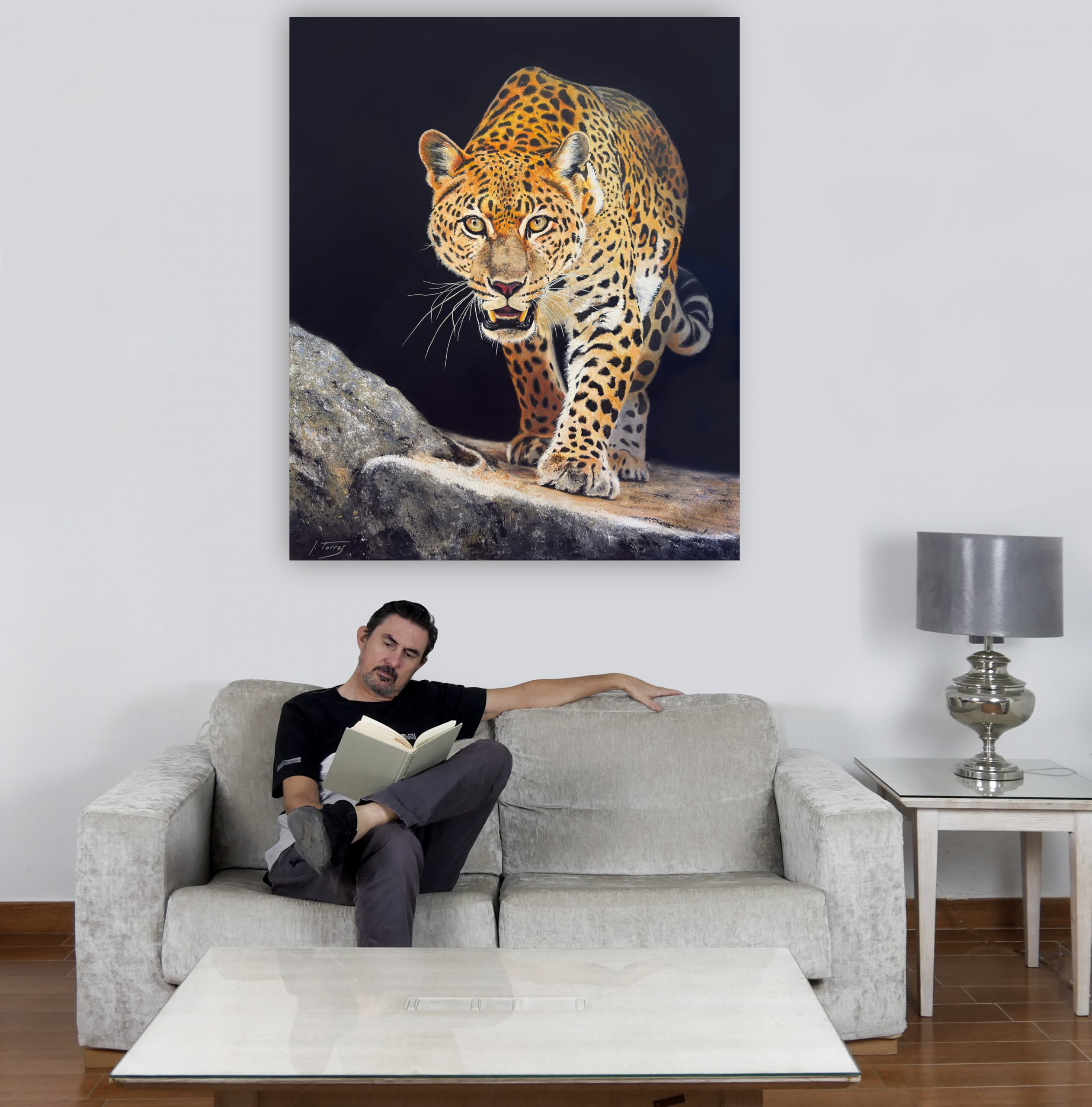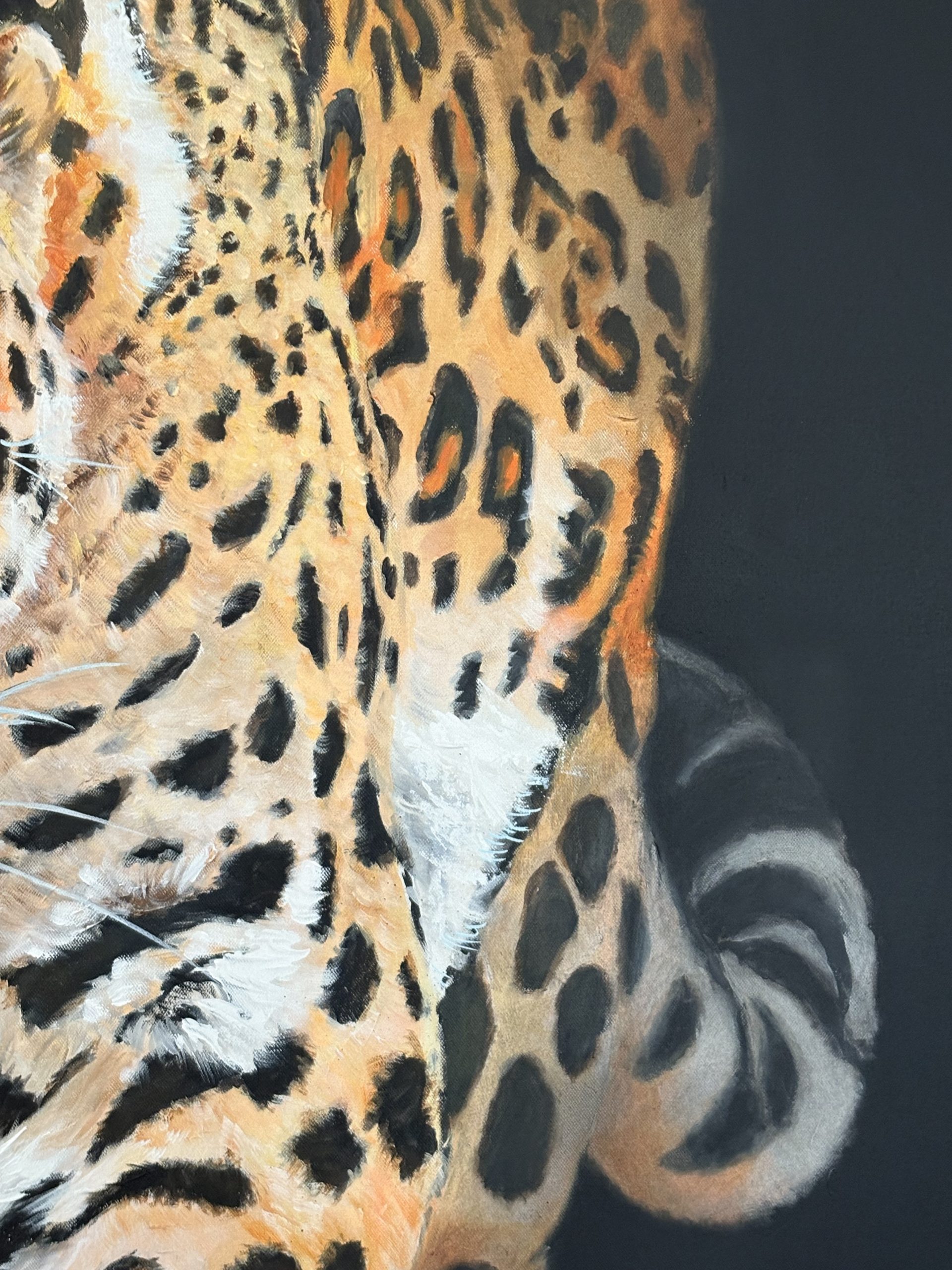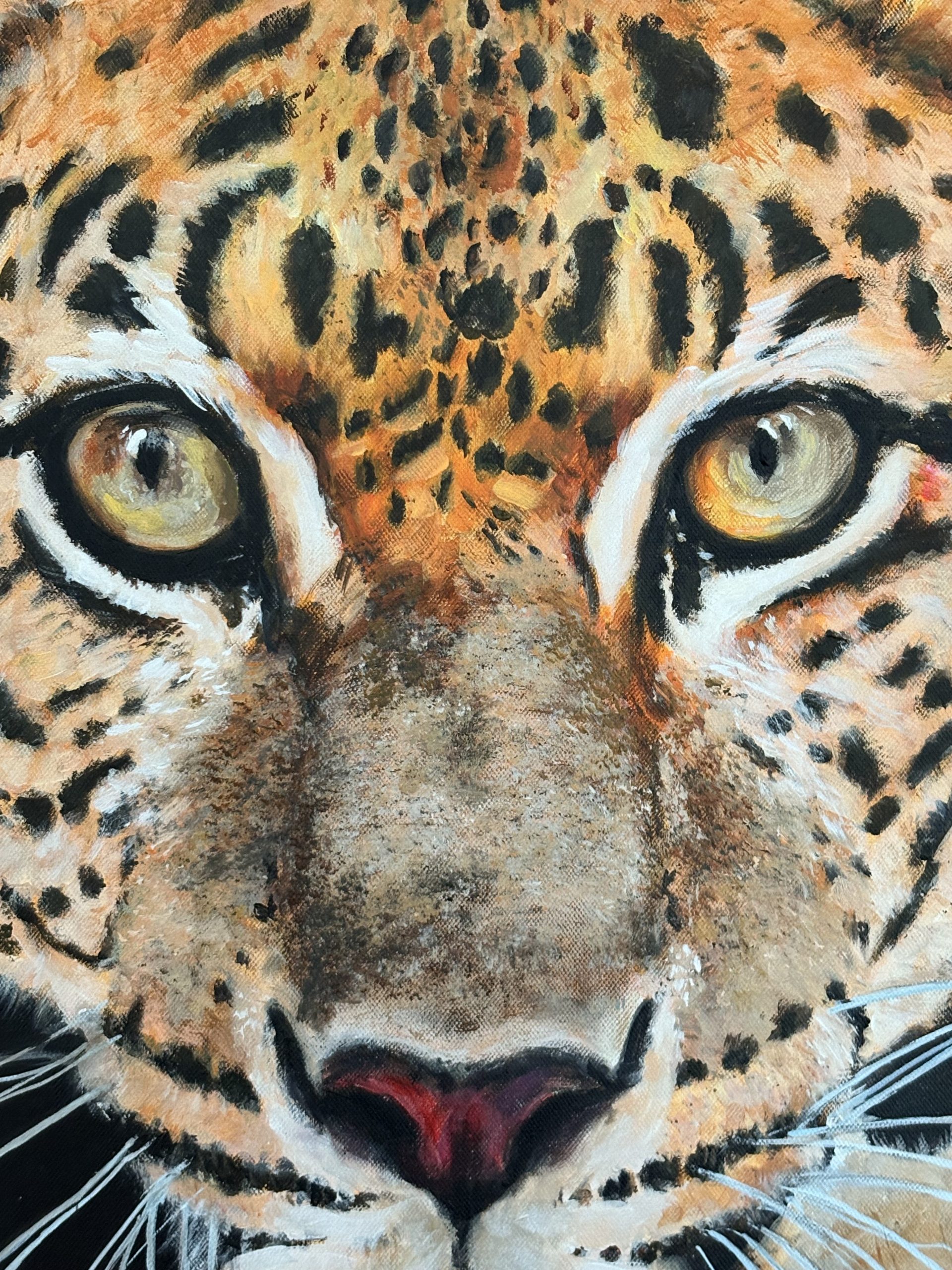 Con esta obra he buscado capturar la esencia cruda y primigenia de la naturaleza a través de la mirada intensa y amenazante de este majestuoso leopardo. Cada pincelada ha sido un intento de plasmar la fuerza contenida, la agilidad y el peligro que emanan de este félido, maestro de la supervivencia en su hábitat.