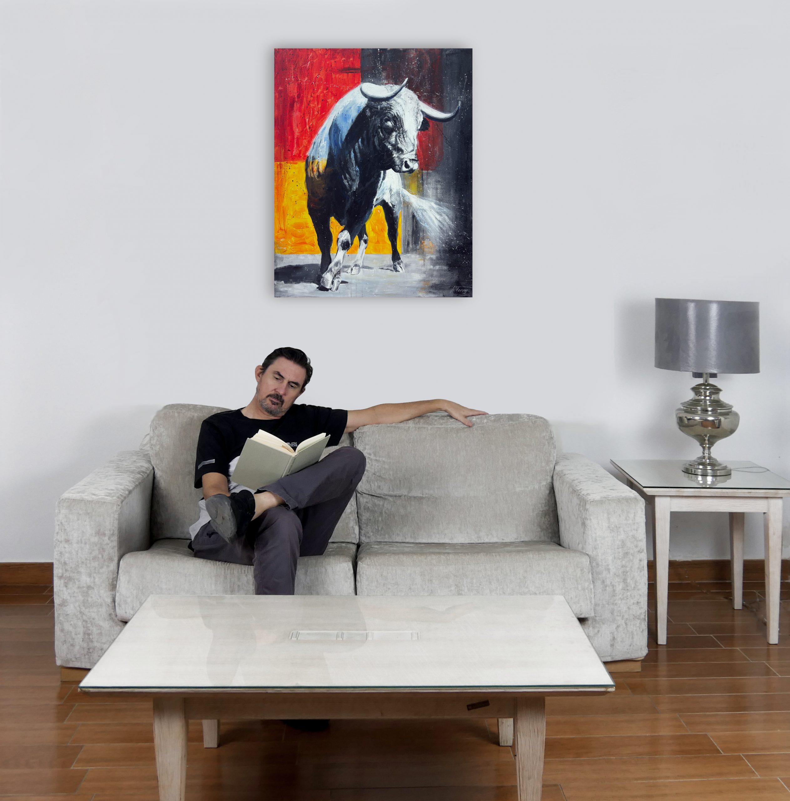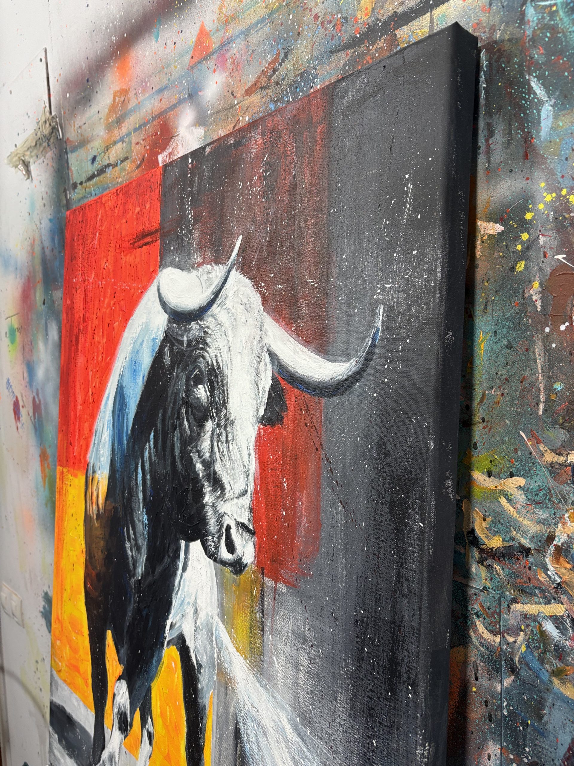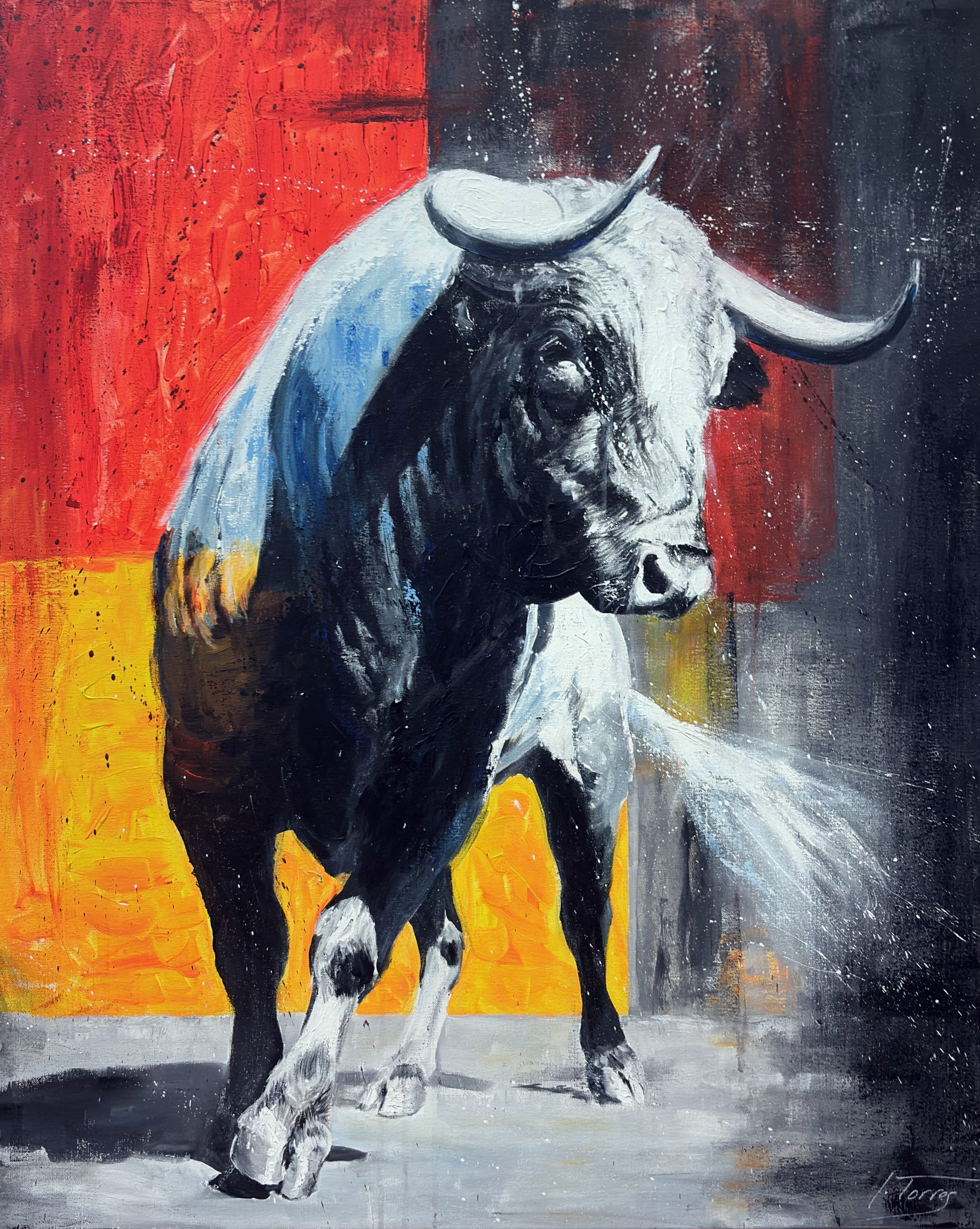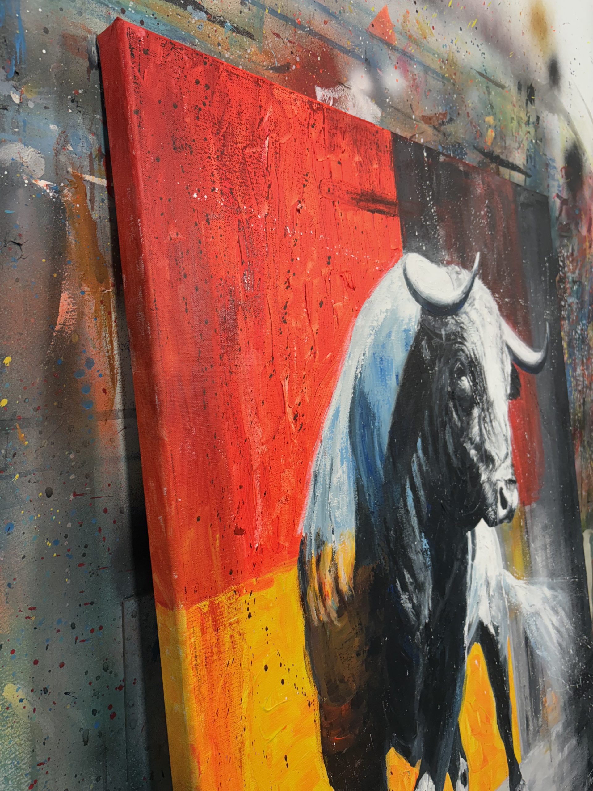 Lo que atrae al lienzo no es solo la anatomía, sino esa dignidad innegociable que irradia. Este toro lleva consigo la memoria de lo salvaje y la resistencia. La pintura se convierte en un reflejo de ese conflicto o equilibrio: la majestad de una criatura que se sabe poderosa y la libertad que se conquista al simplemente ser en medio de fuerzas contrastantes.