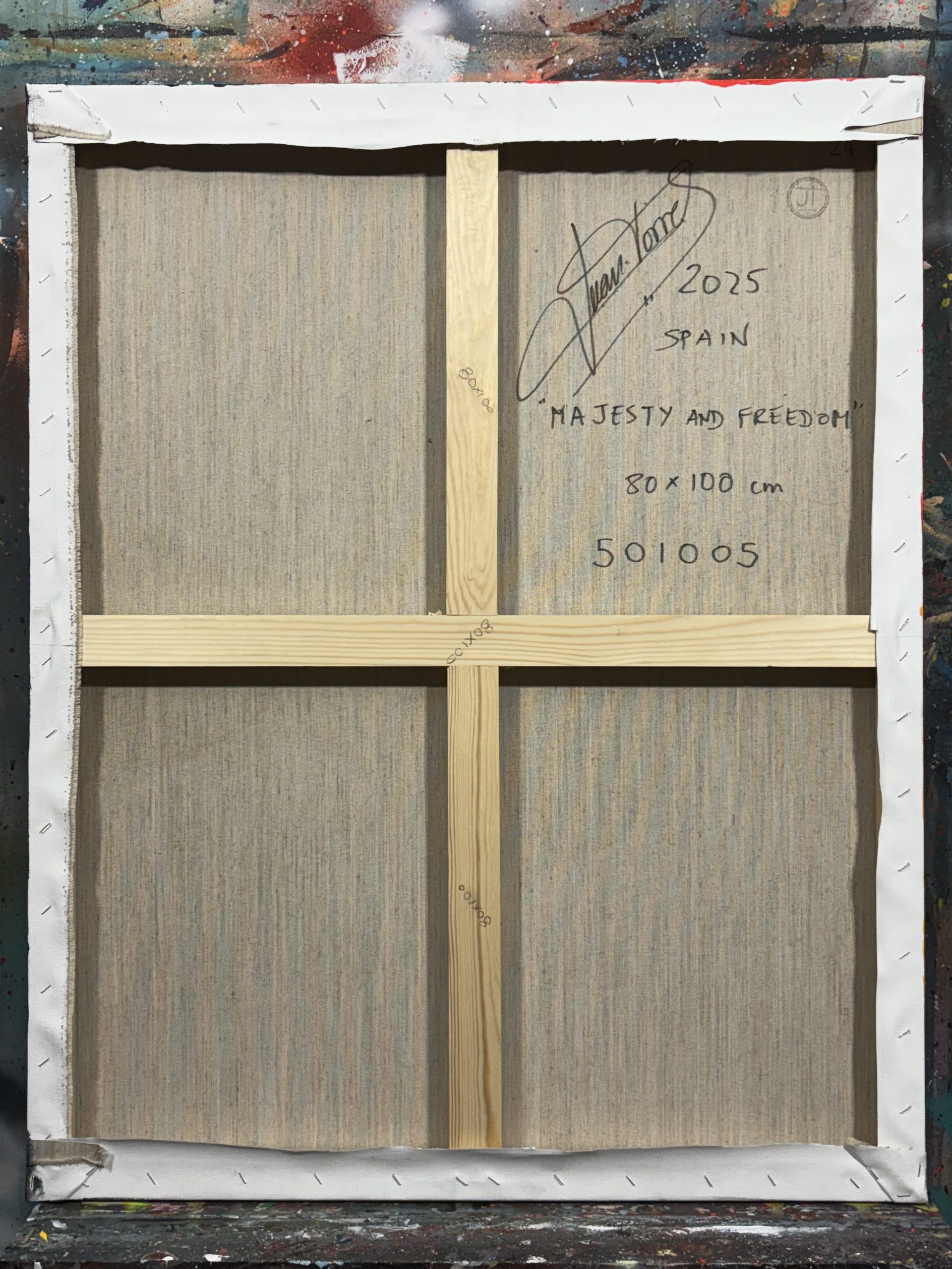 Esta pieza, "Majesty and Freedom" (Majestad y Libertad), es una inmersión en la fuerza cruda y la dignidad indomable. Es un lienzo donde el toro no es solo una figura, sino un monumento a la potencia contenida.