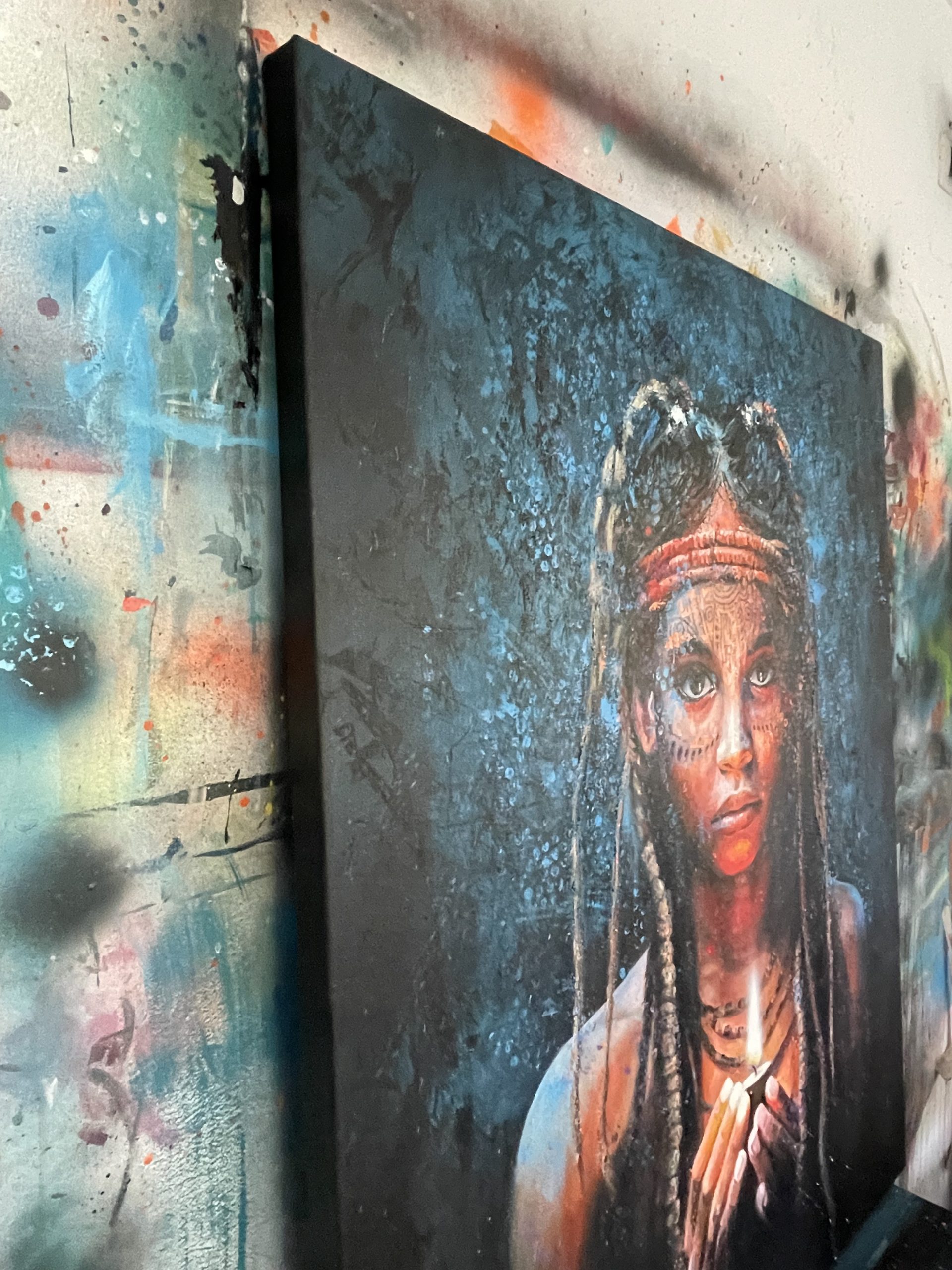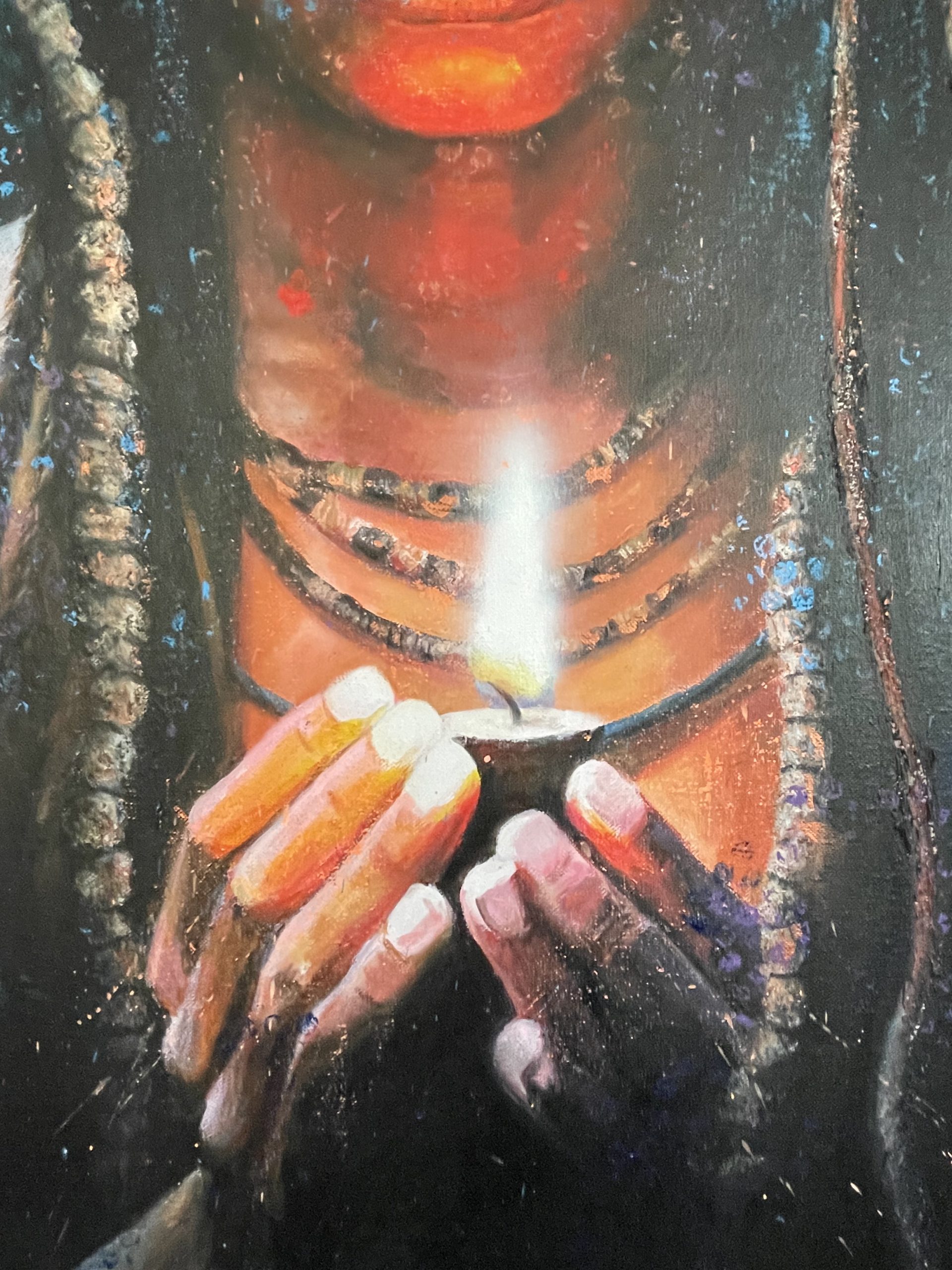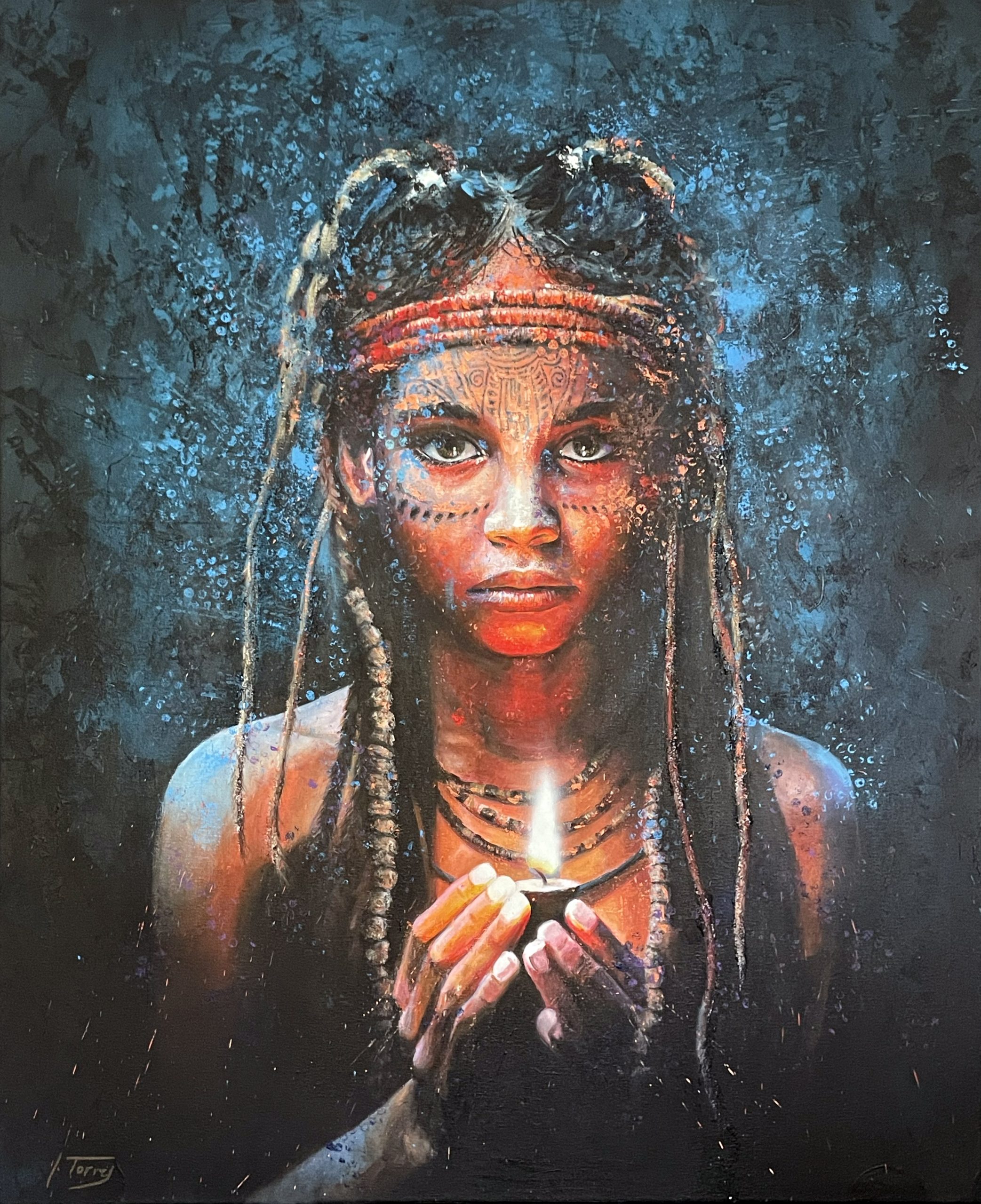 “Ofrenda” es una ventana a un mundo donde la luz y la sombra danzan en un equilibrio perpetuo. La joven, una emisaria entre dos mundos, sostiene en sus manos no solo una luminaria, sino la promesa de un conocimiento ancestral. La luz que se derrama sobre sus manos es como el agua de un río sagrado, purificando todo lo que toca.