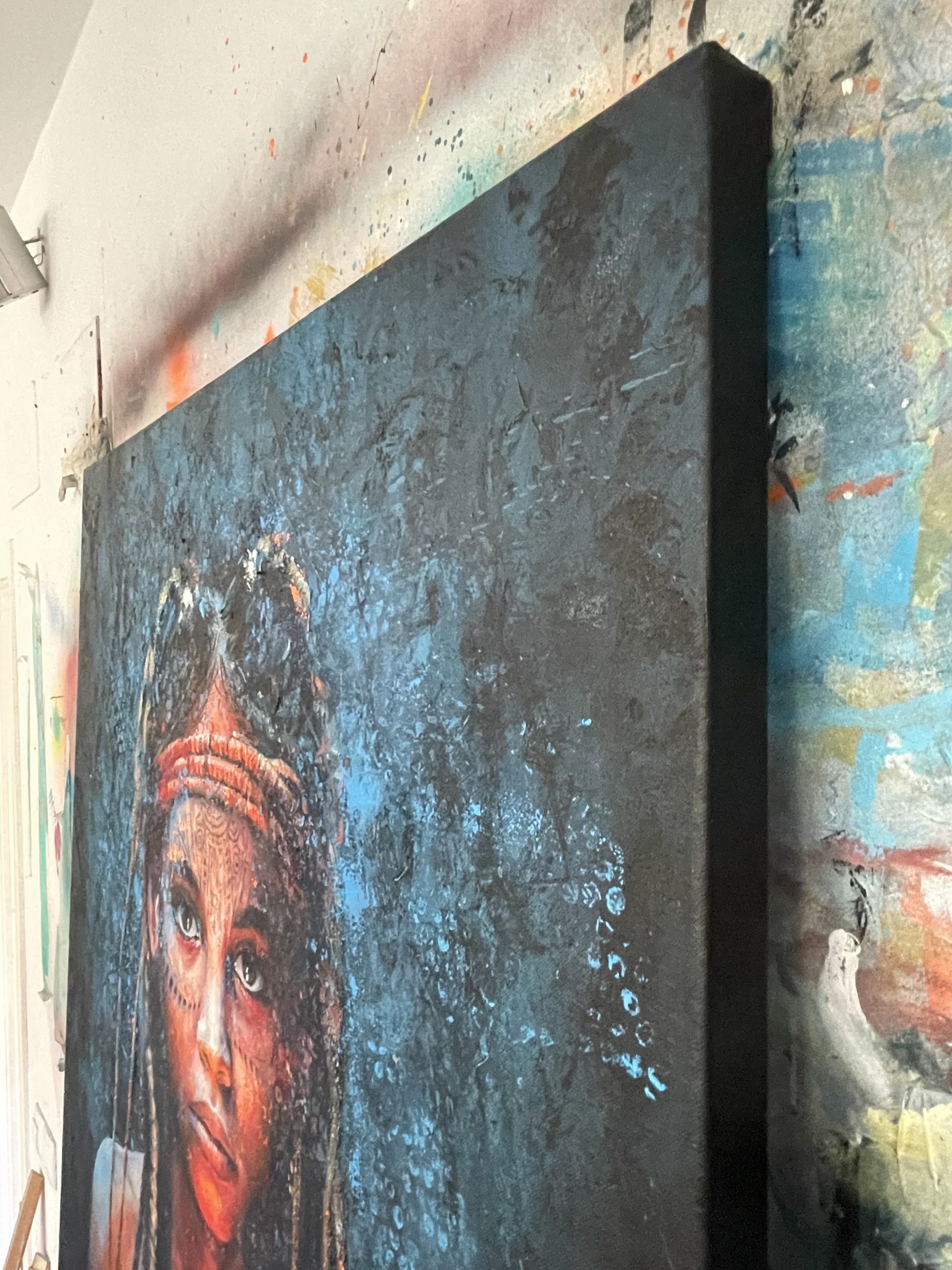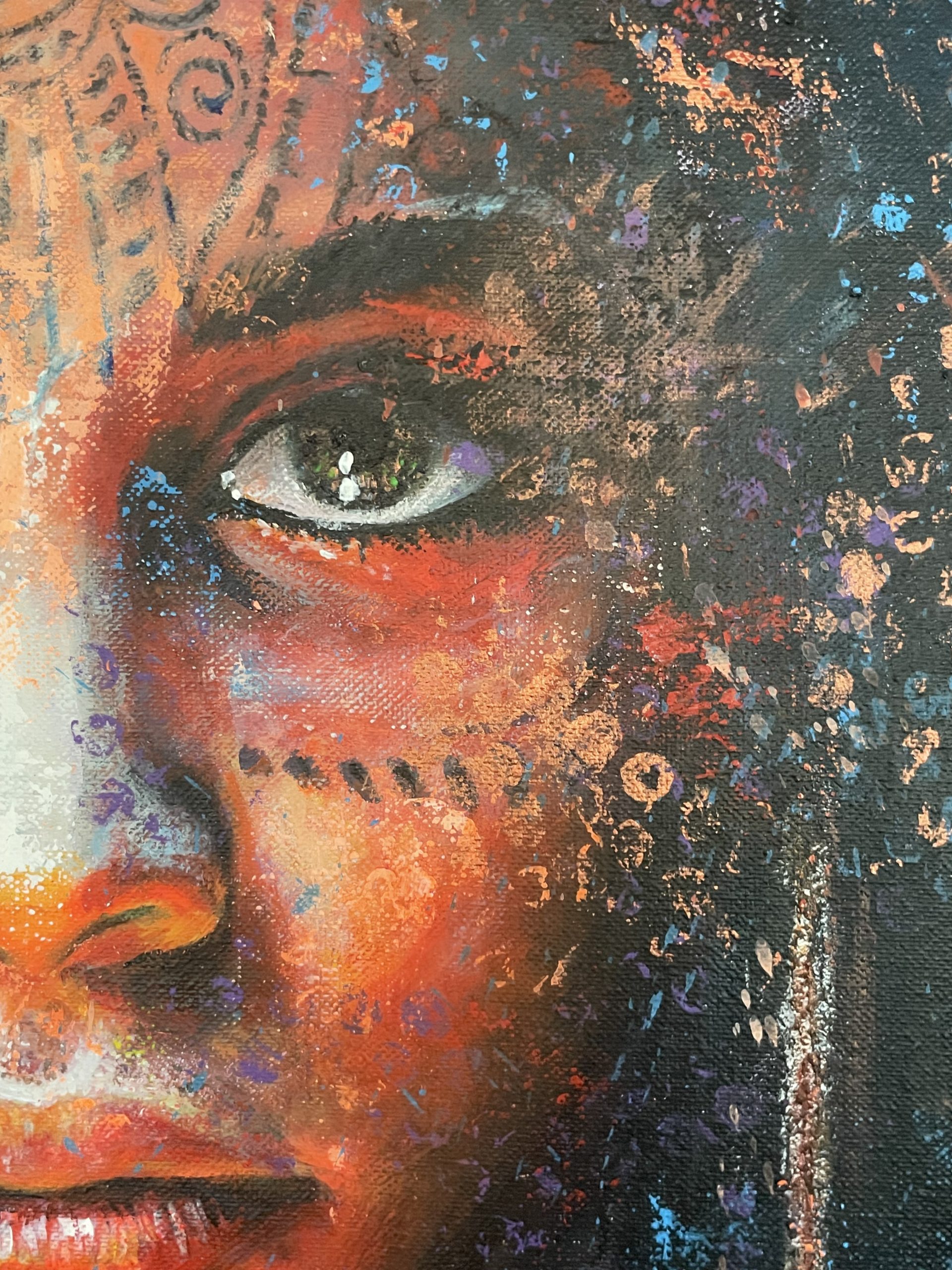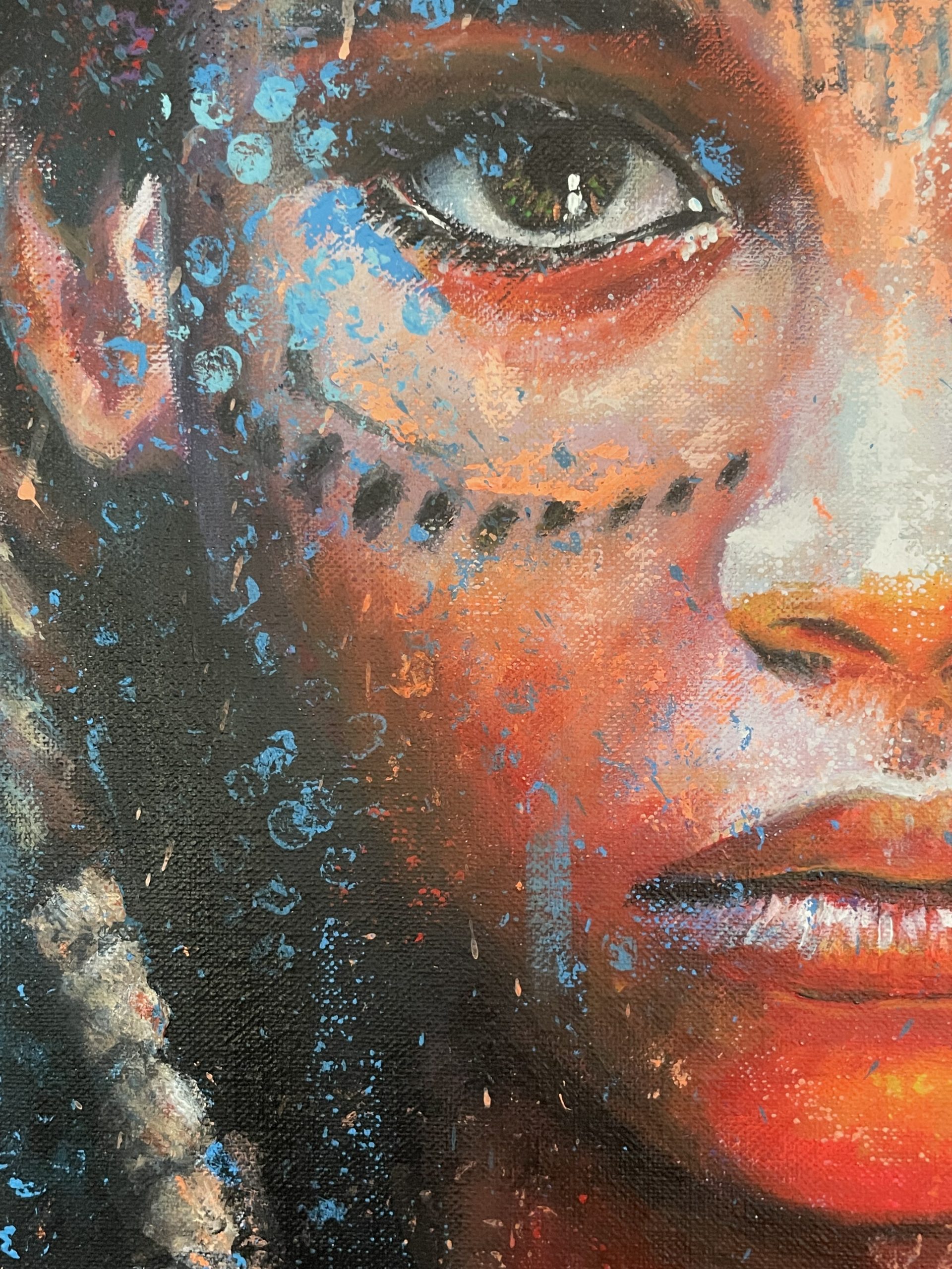 “Ofrenda” es una ventana a un mundo donde la luz y la sombra danzan en un equilibrio perpetuo. La joven, una emisaria entre dos mundos, sostiene en sus manos no solo una luminaria, sino la promesa de un conocimiento ancestral. La luz que se derrama sobre sus manos es como el agua de un río sagrado, purificando todo lo que toca.