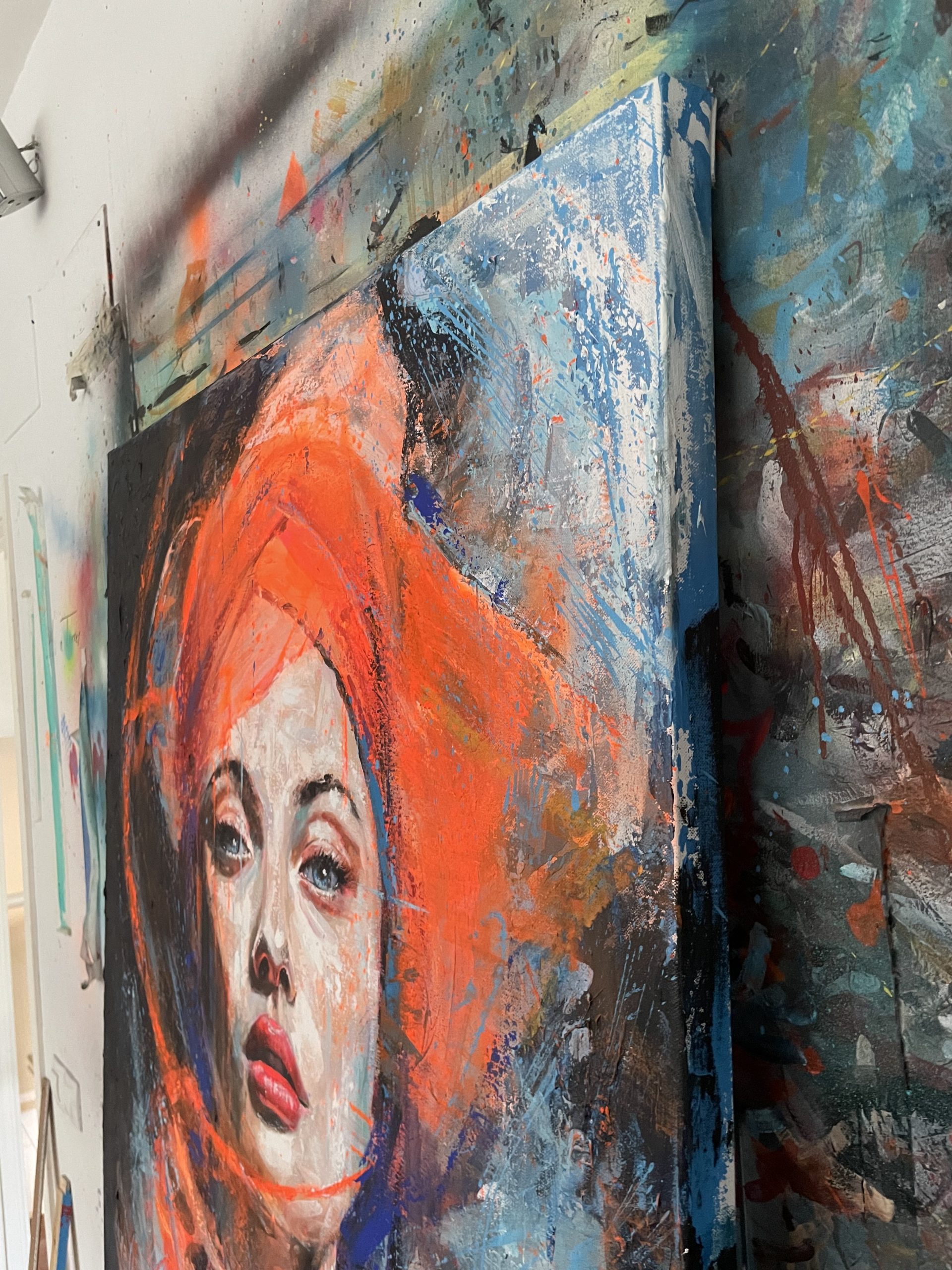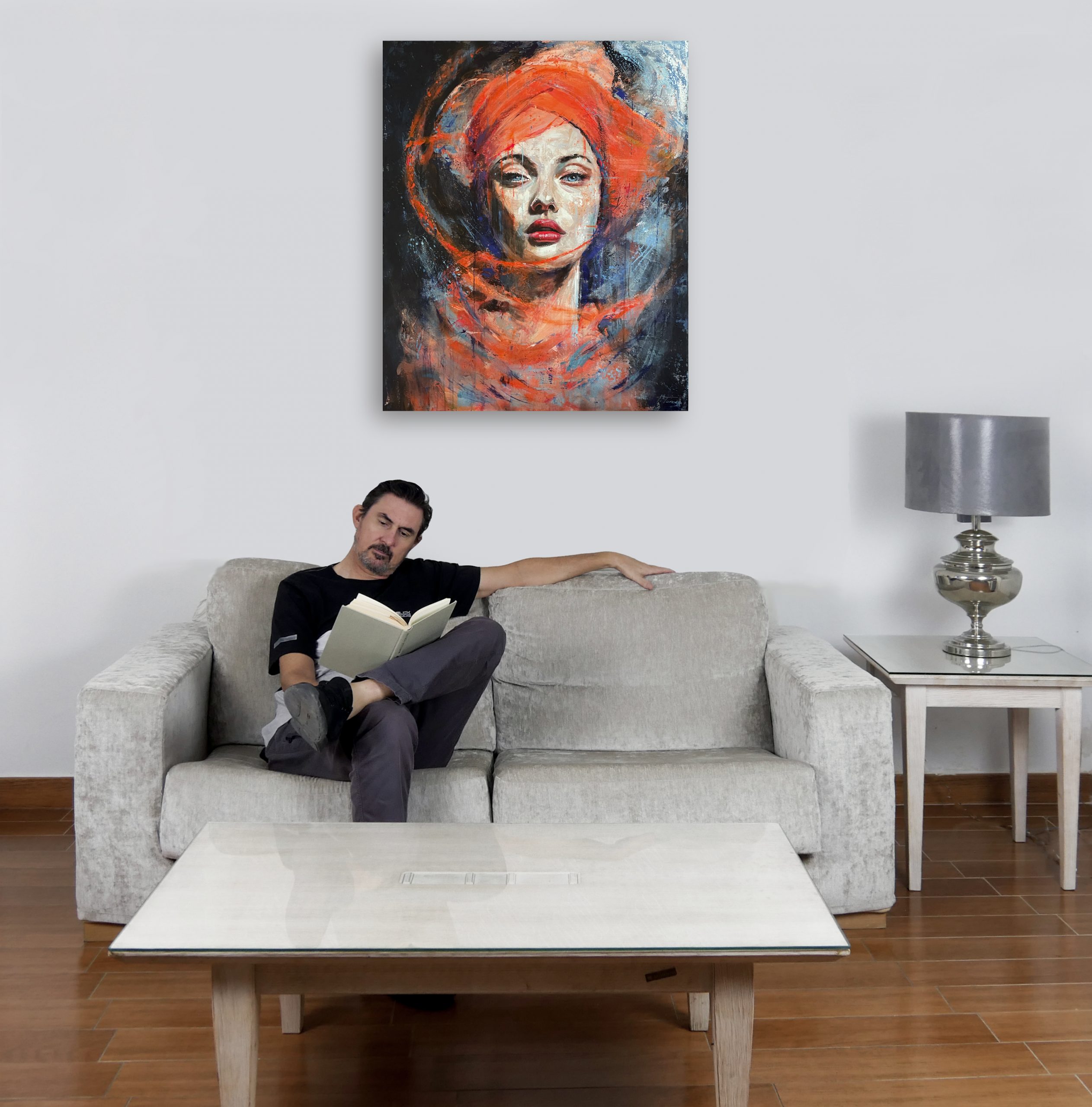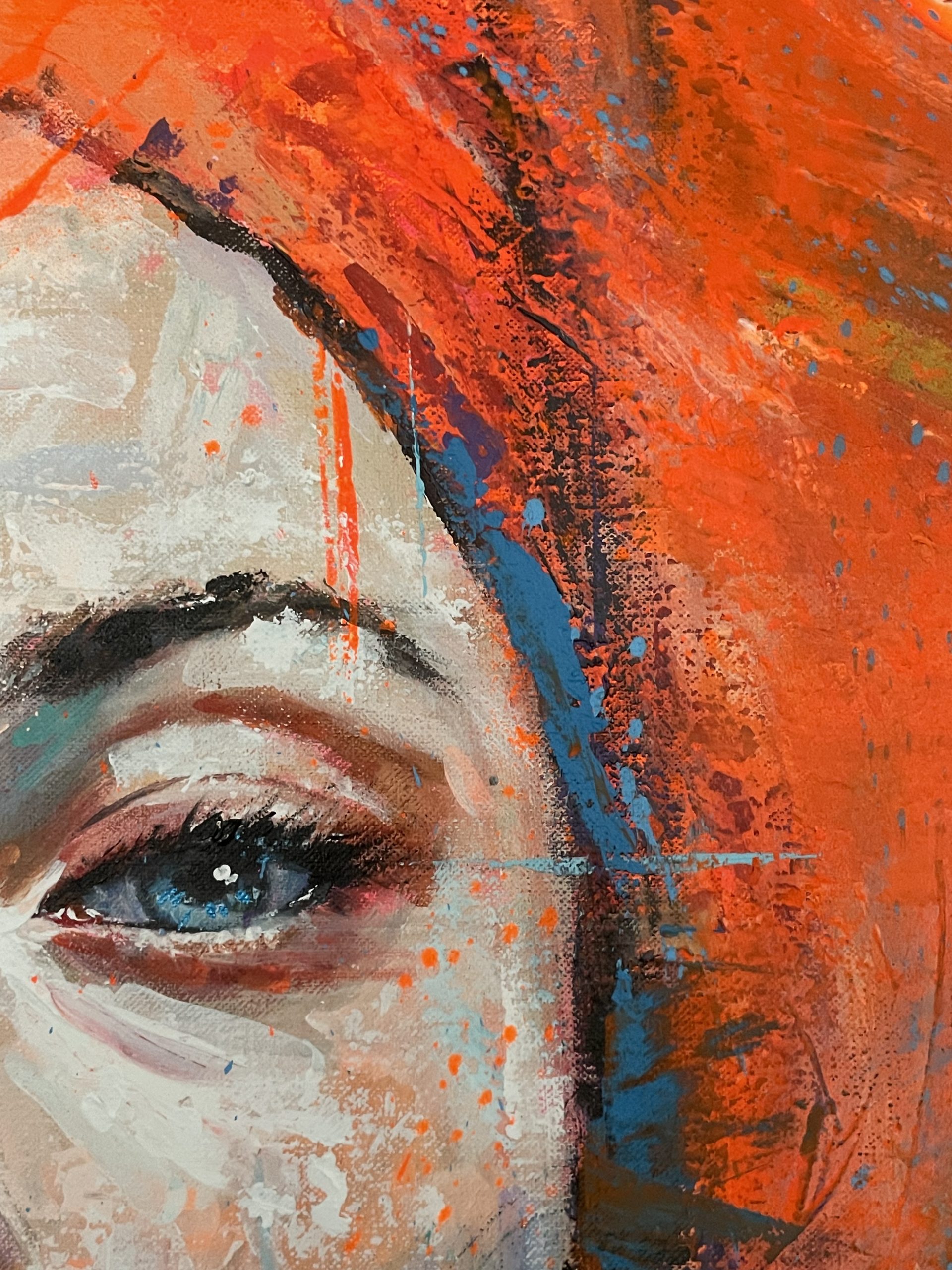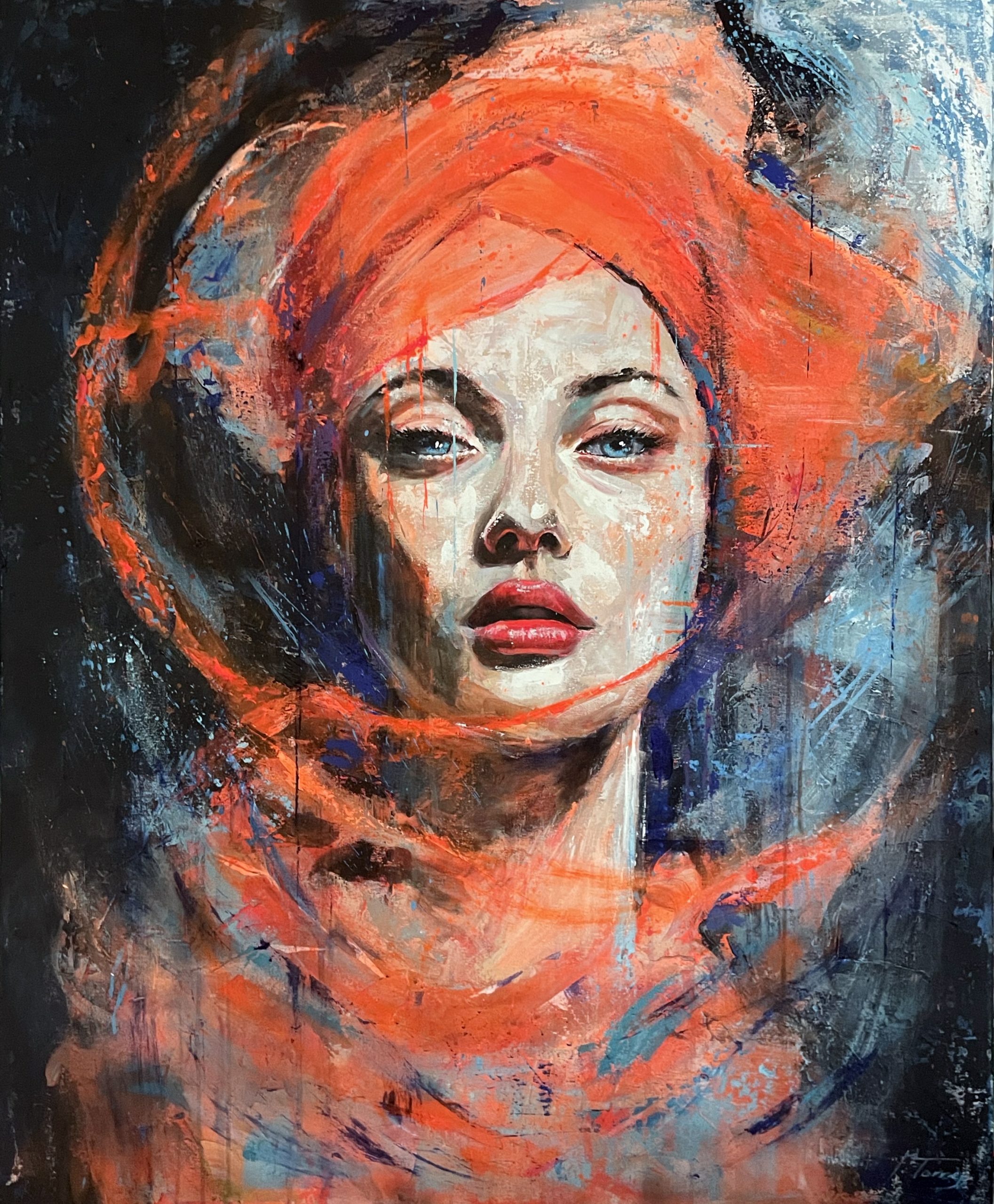 La paleta de colores utilizada en la pintura resalta la dualidad de sus emociones. Los tonos cálidos y suaves del rostro de la chica contrastan con los colores más oscuros y fríos del fondo, creando una atmósfera que invita a la introspección. Las pinceladas alrededor de su rostro son dinámicas y gestuales, sugiriendo un torbellino de emociones internas, mientras que los detalles delicados de su expresión capturan la esencia de su belleza y su dignidad.