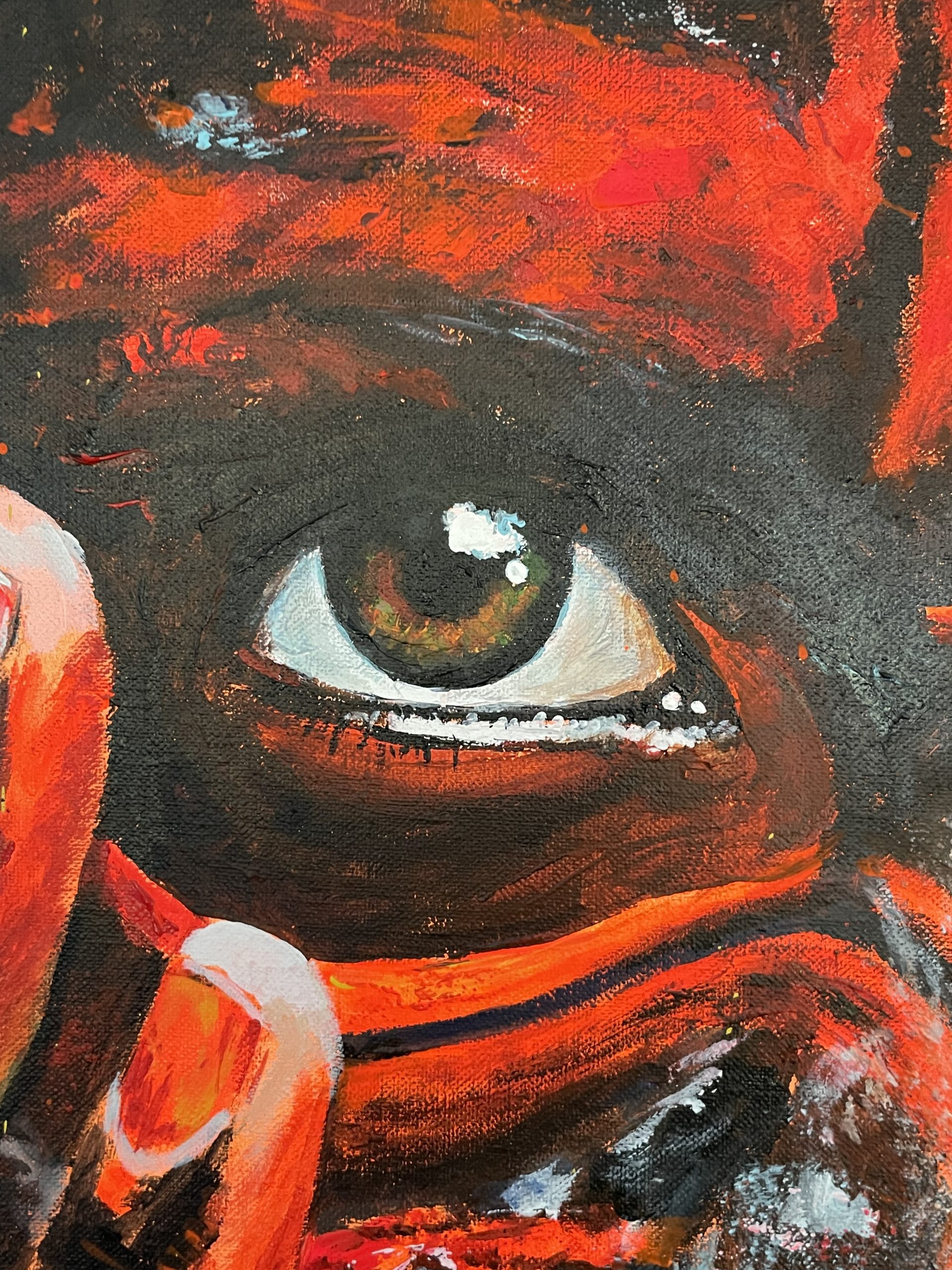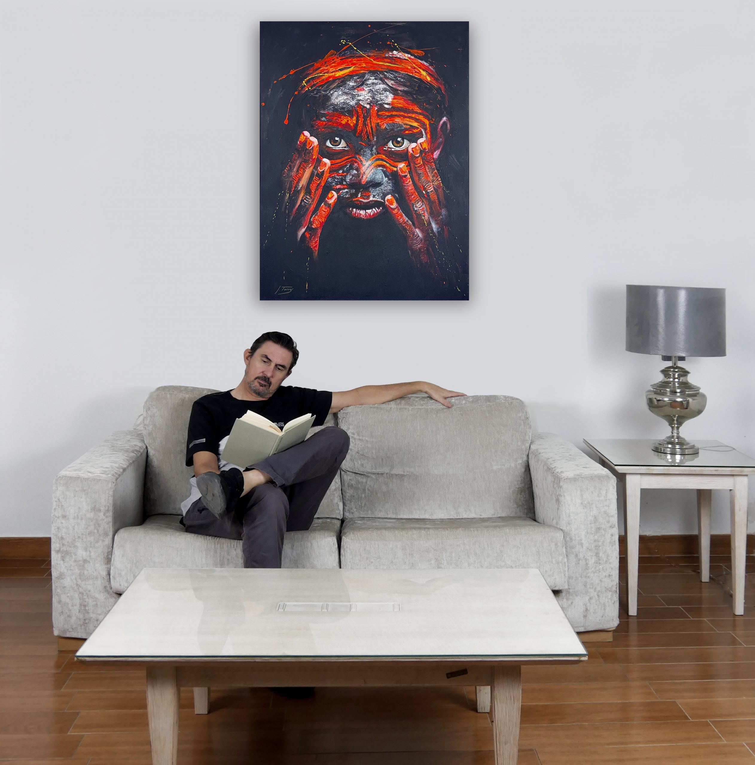 En esta pieza pretendo que nos sumerjamos en la intimidad de un momento tribal ancestral. La figura central, una joven, se presenta como la protagonista de una ceremonia cargada de tradición y significado. Los tonos ardientes de rojo y naranja sugieren una pintura ritualística, que posiblemente, simboliza su rol dentro de la comunidad.