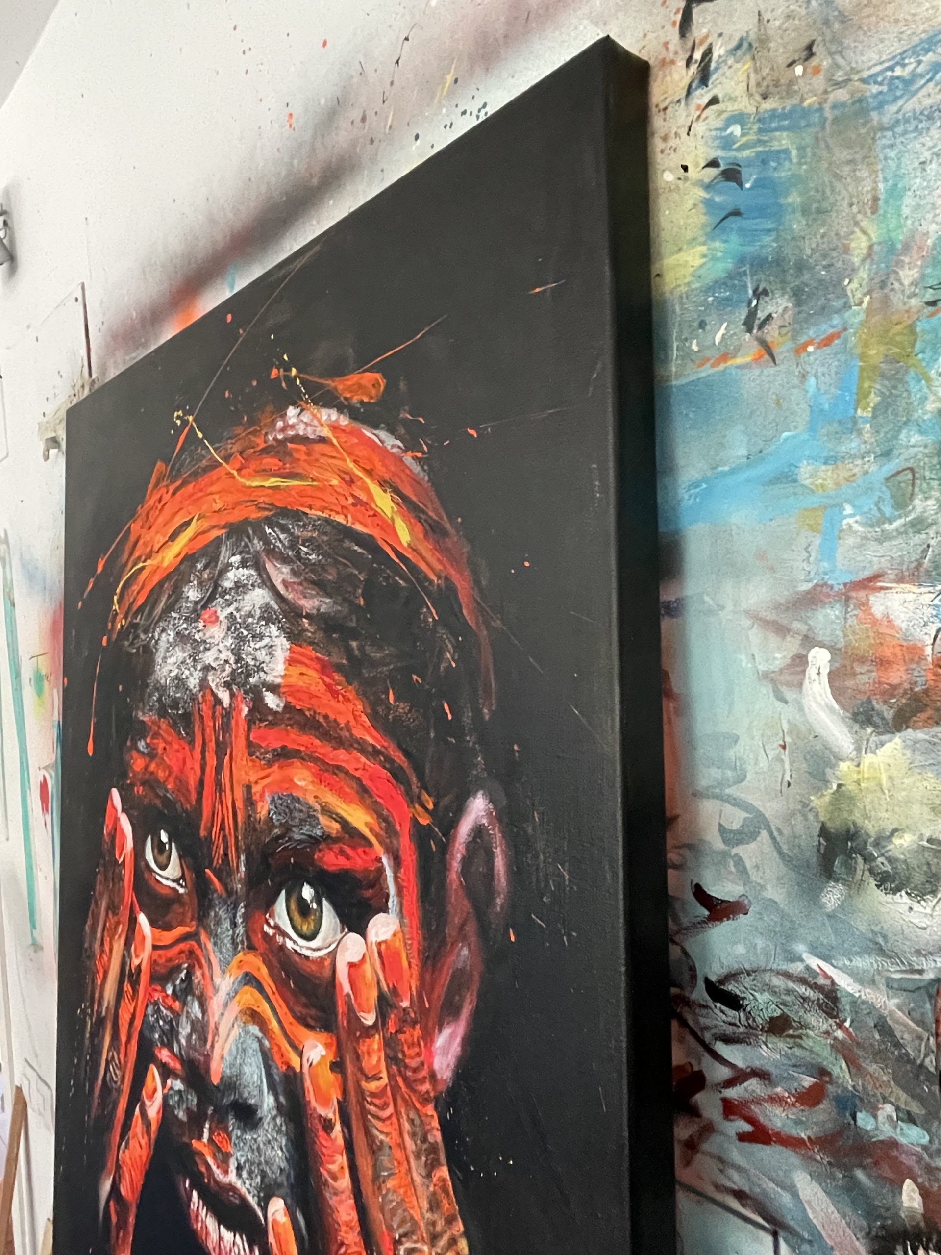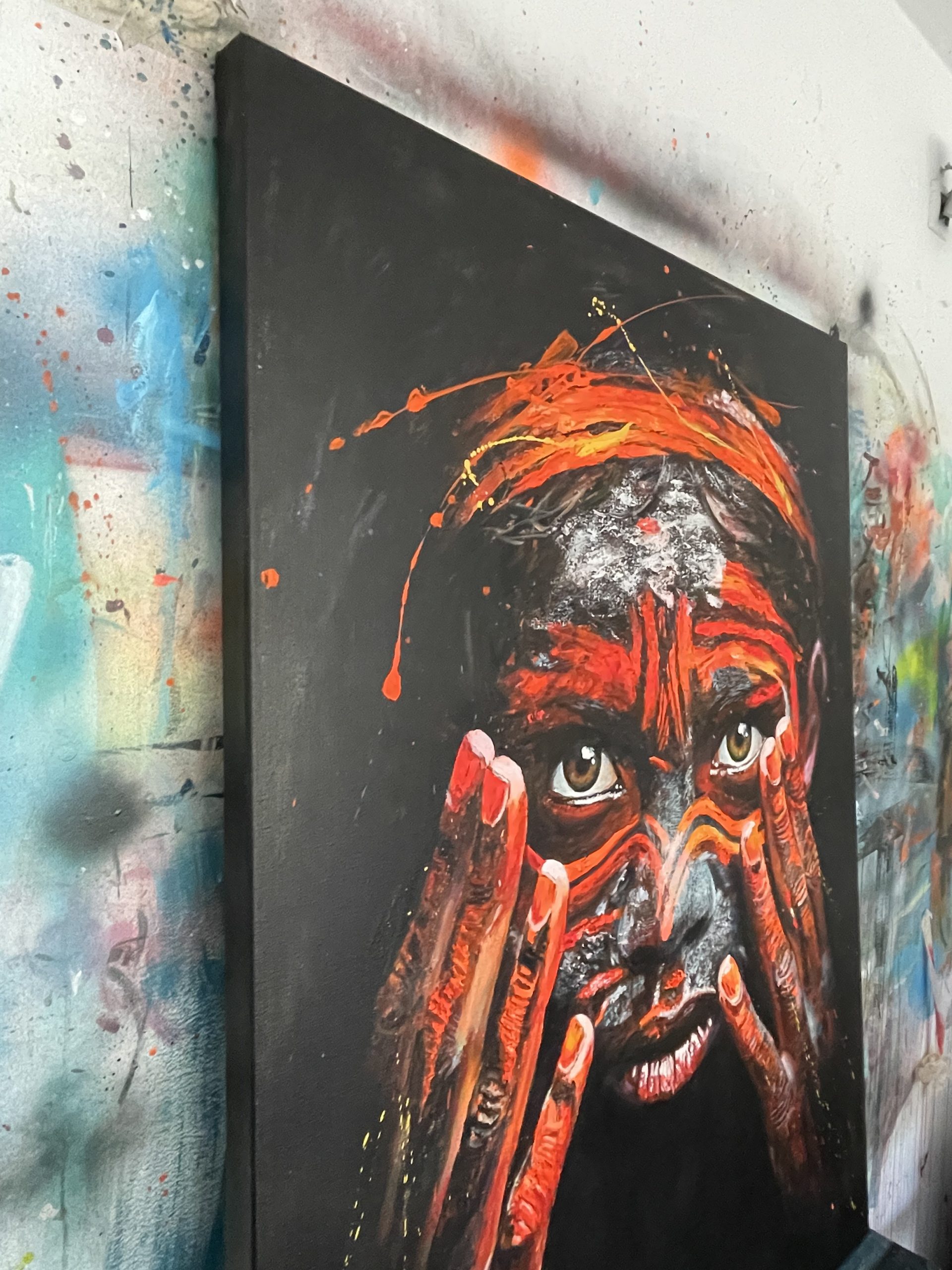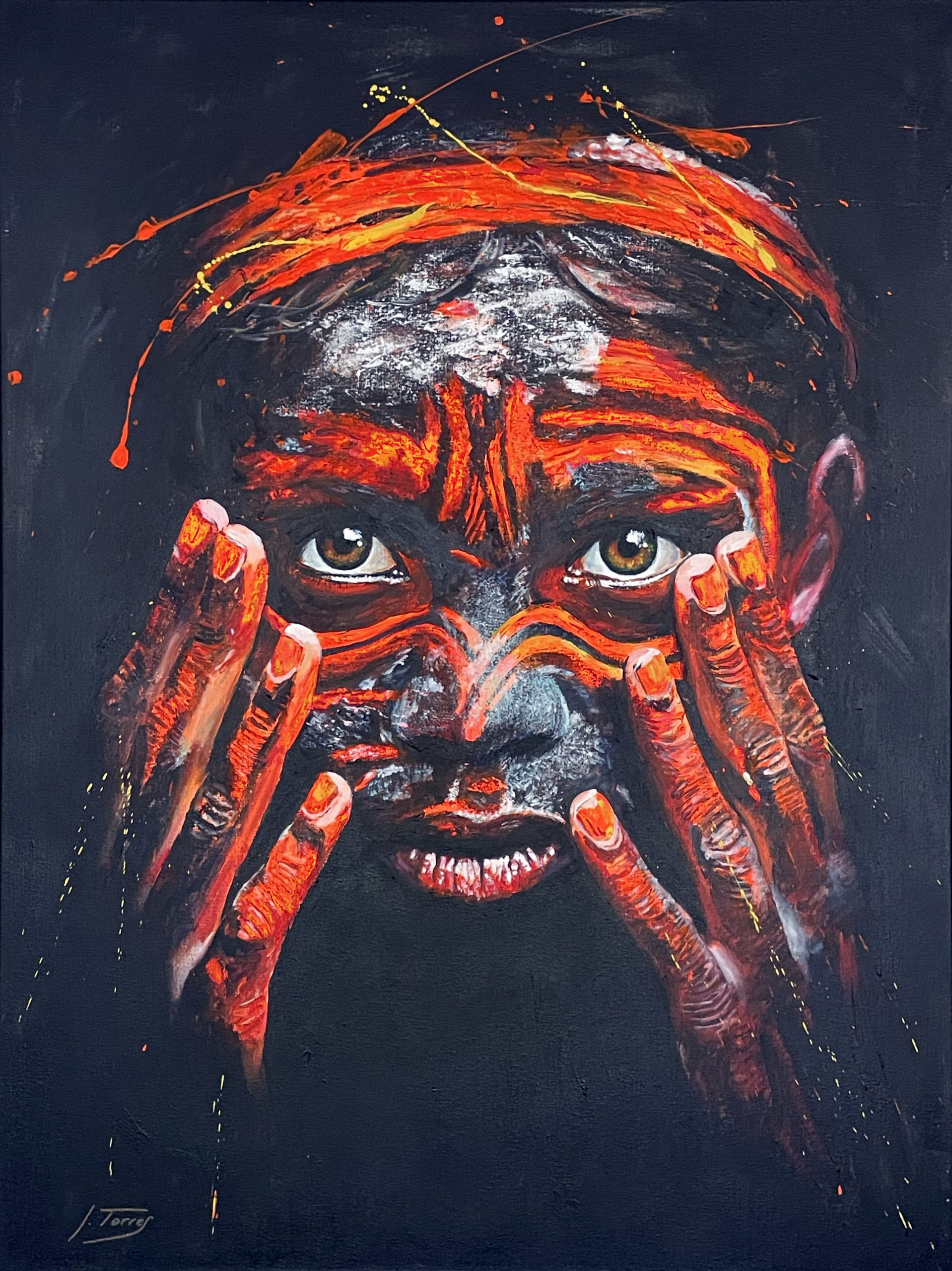 La mirada profunda, que transmite pureza e inocencia, intenta esconderse en el marco de unas manos, también impregnadas por colores vibrantes,