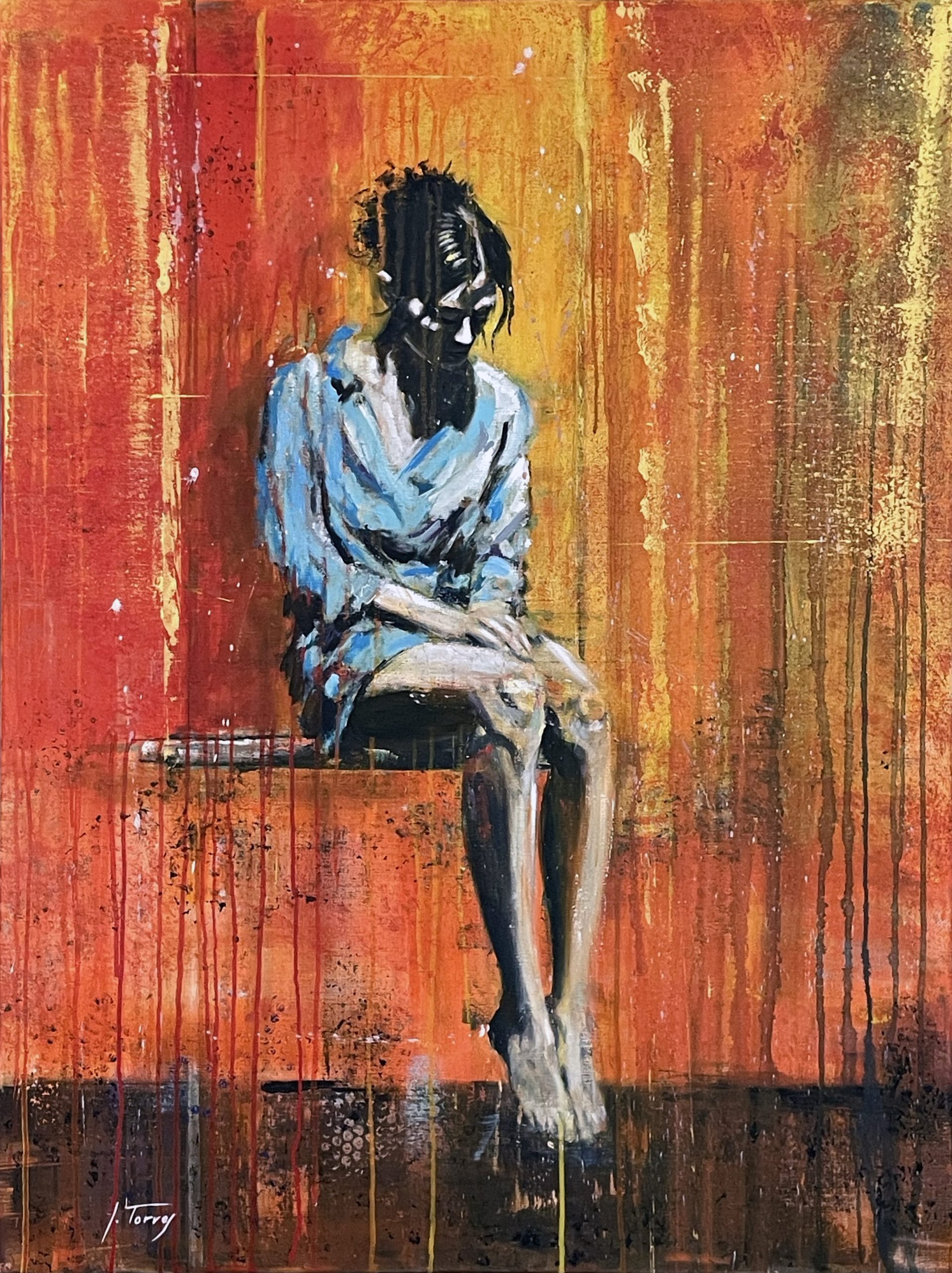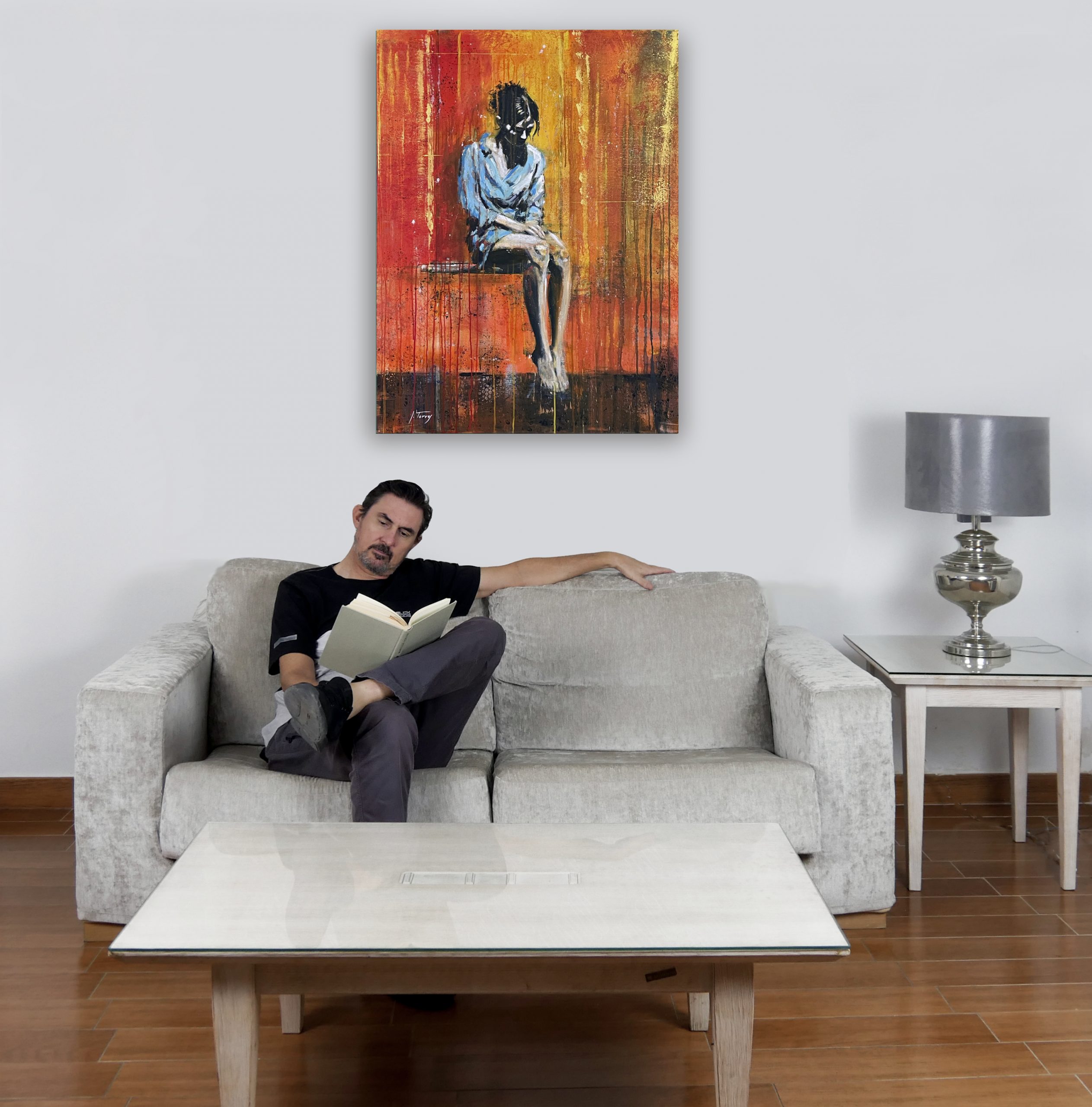 En esta obra, busco capturar la esencia de la introspección y la soledad. Usé acrílicos para dramatizar el contraste entre el cálido fondo rojo y naranja y la figura solitaria en azul, simbolizando la frialdad y el distanciamiento en nuestros momentos más reflexivos. Cada pincelada revela la tensión entre el aislamiento y el ardiente deseo de conexión. Este cuadro no solo decora un espacio, sino que invita a la contemplación y el diálogo interno.