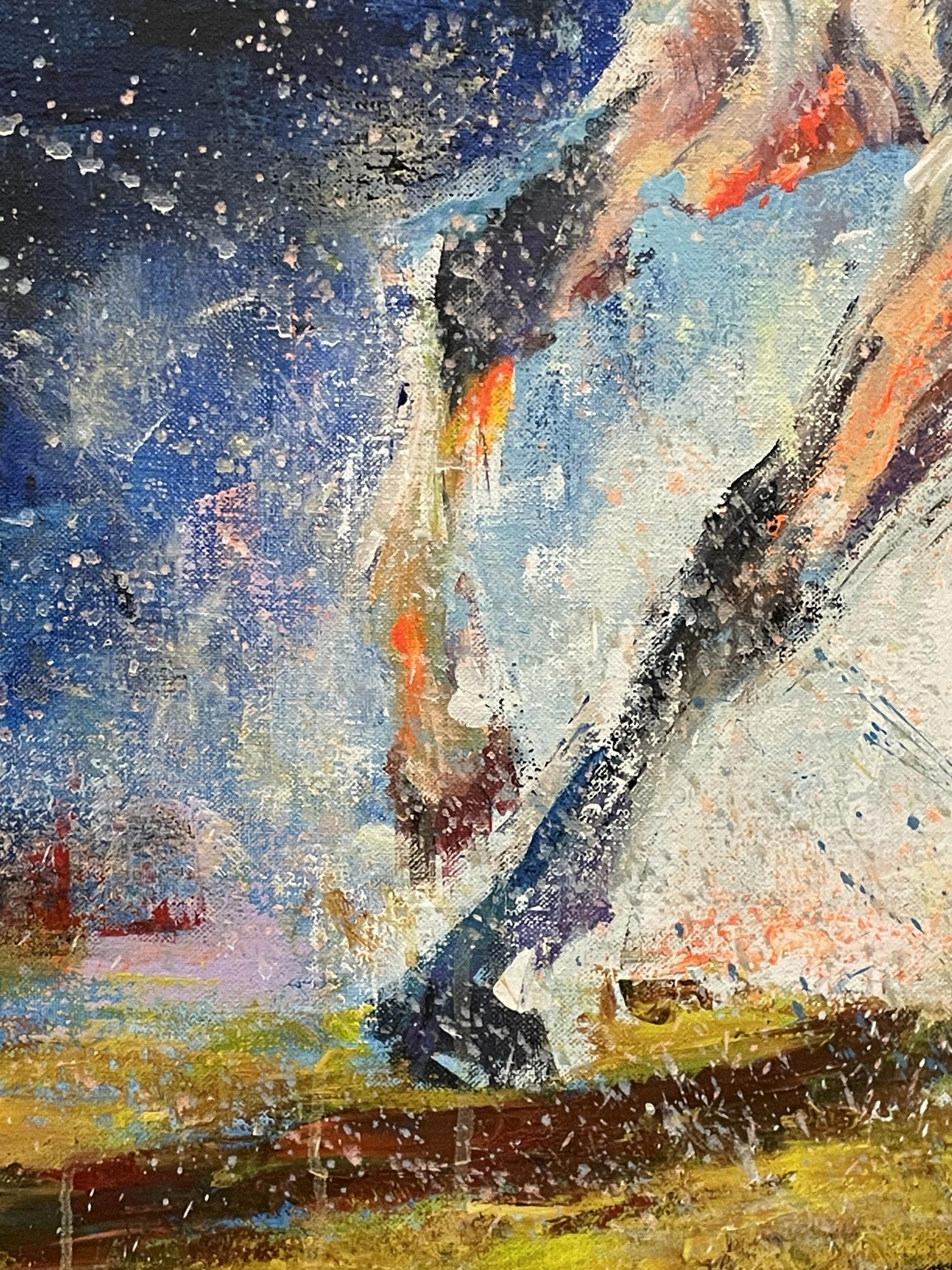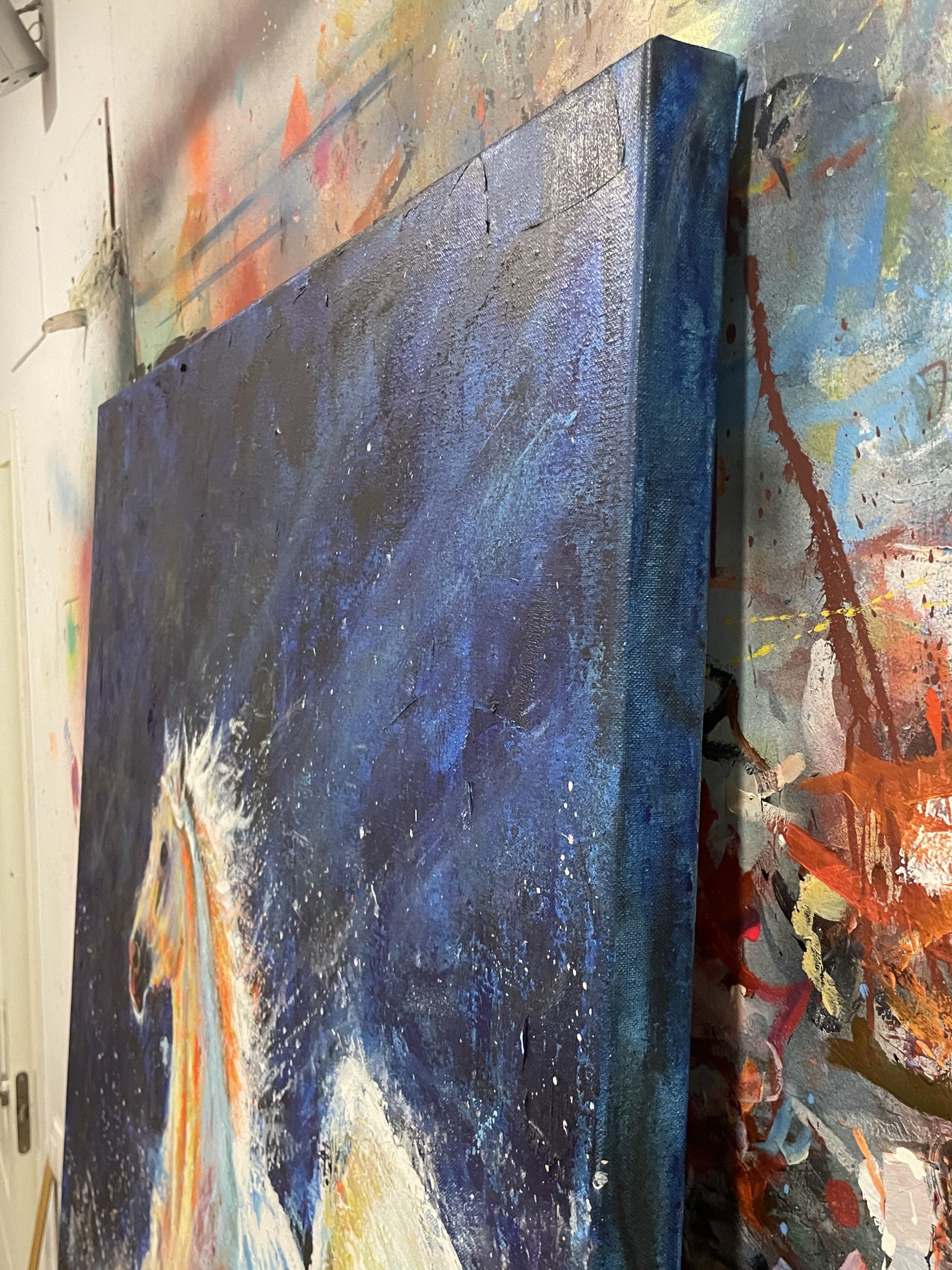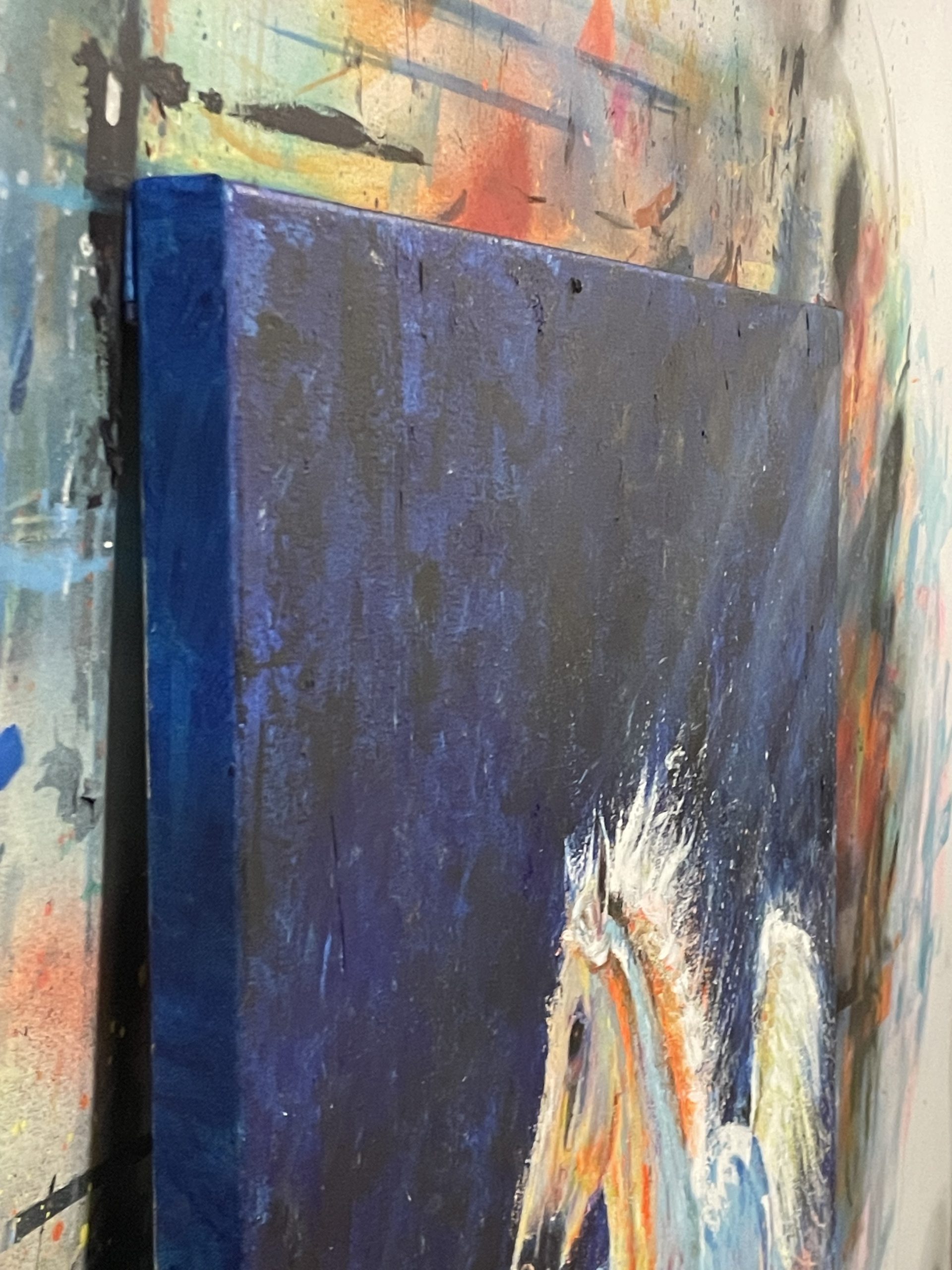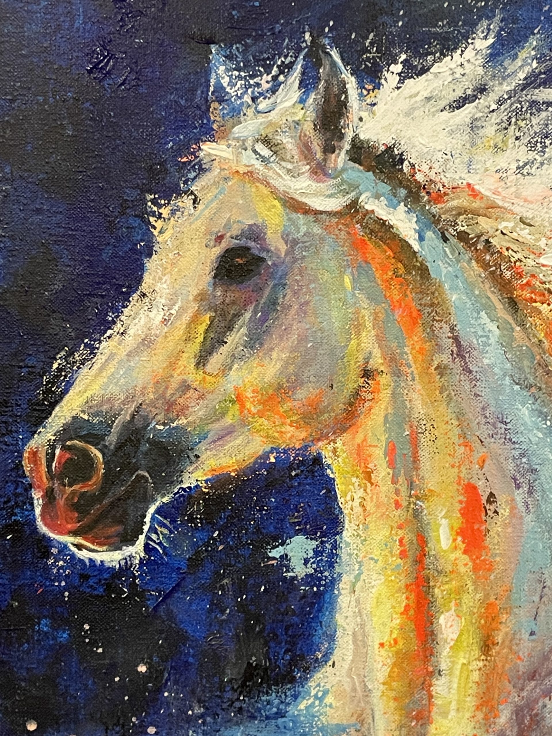 He utilizado una paleta de colores fríos y cálidos para resaltar la fuerza y la libertad del animal, con destellos de naranja y amarillo que sugieren movimiento y vitalidad. La melena y la cola del caballo ondean al viento entre salpicones de pintura, añadiendo una sensación de velocidad y ligereza.