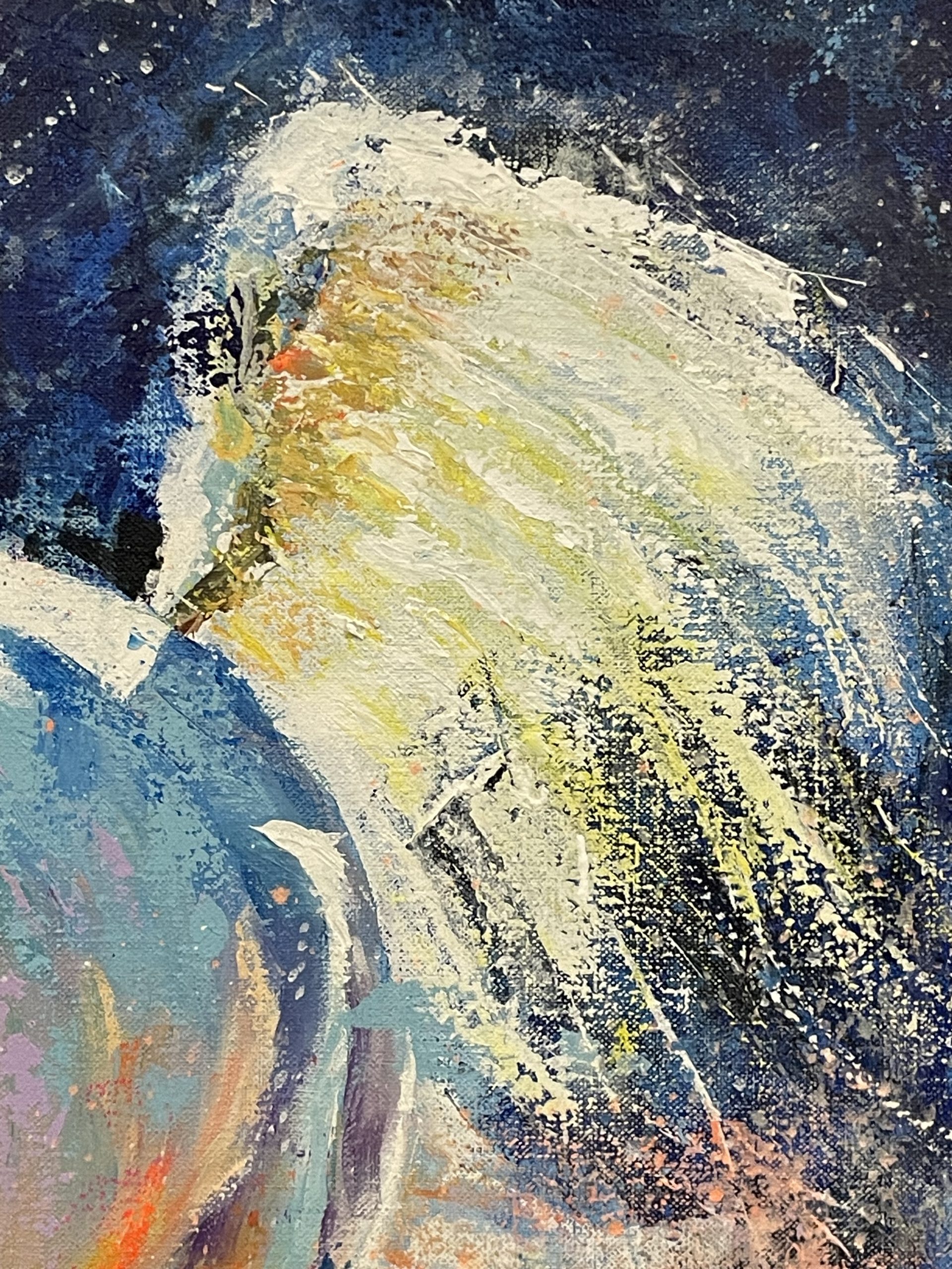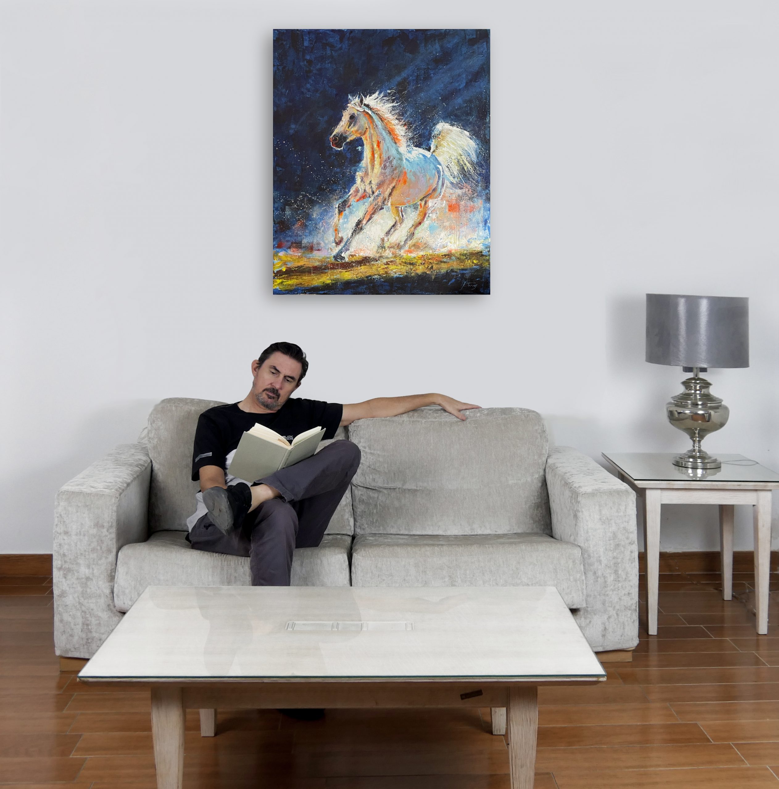 En esta pintura, he intentado capturar la esencia de un majestuoso caballo blanco en pleno galope, emergiendo de un fondo oscuro y nebuloso. La energía y el dinamismo del caballo se destacan a través de los trazos vibrantes y los contrastes de luz y sombra.
