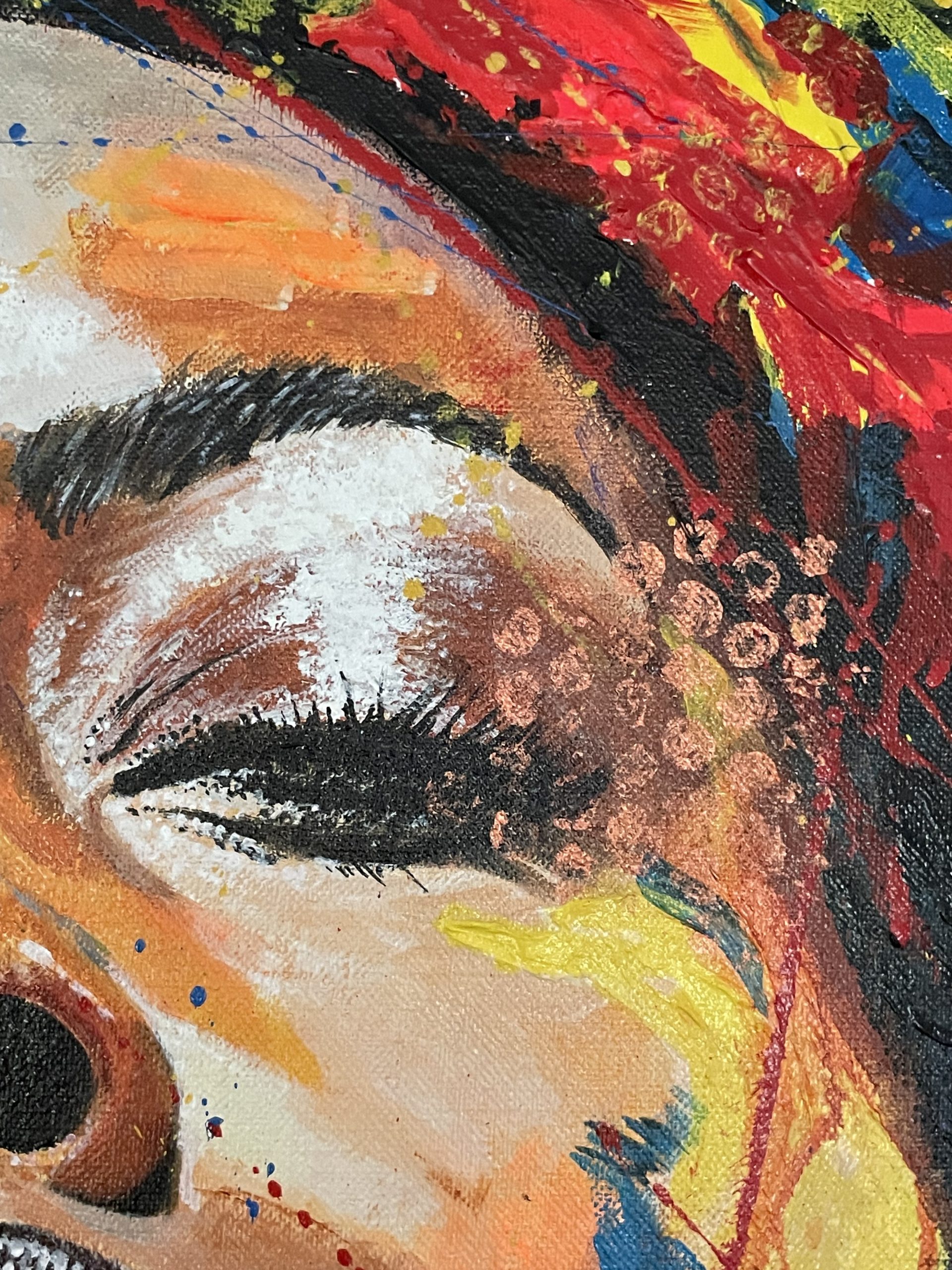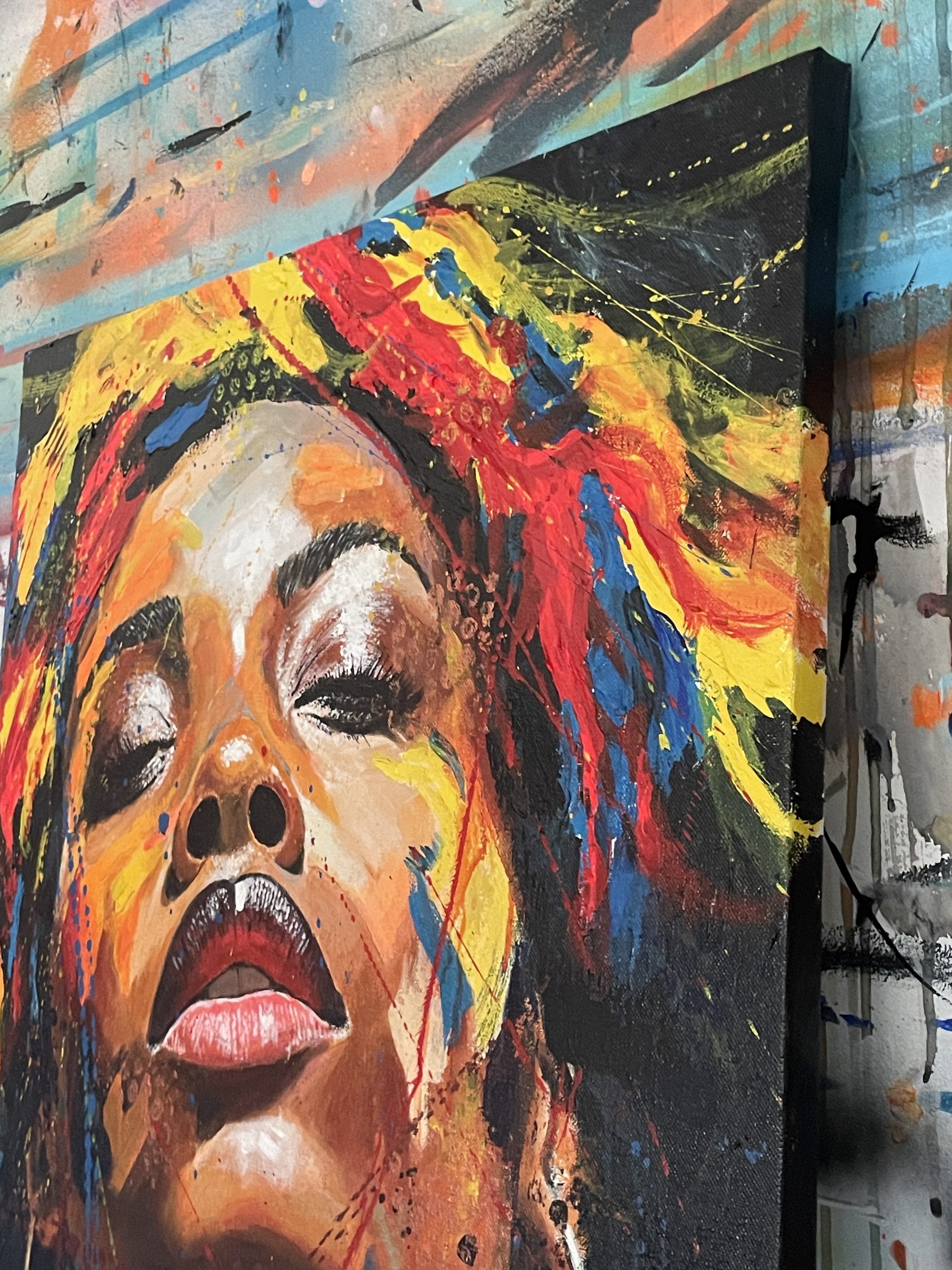 La interacción entre el realismo del rostro y la abstracción del fondo genera una tensión visual que invita al espectador a explorar más profundamente la obra.