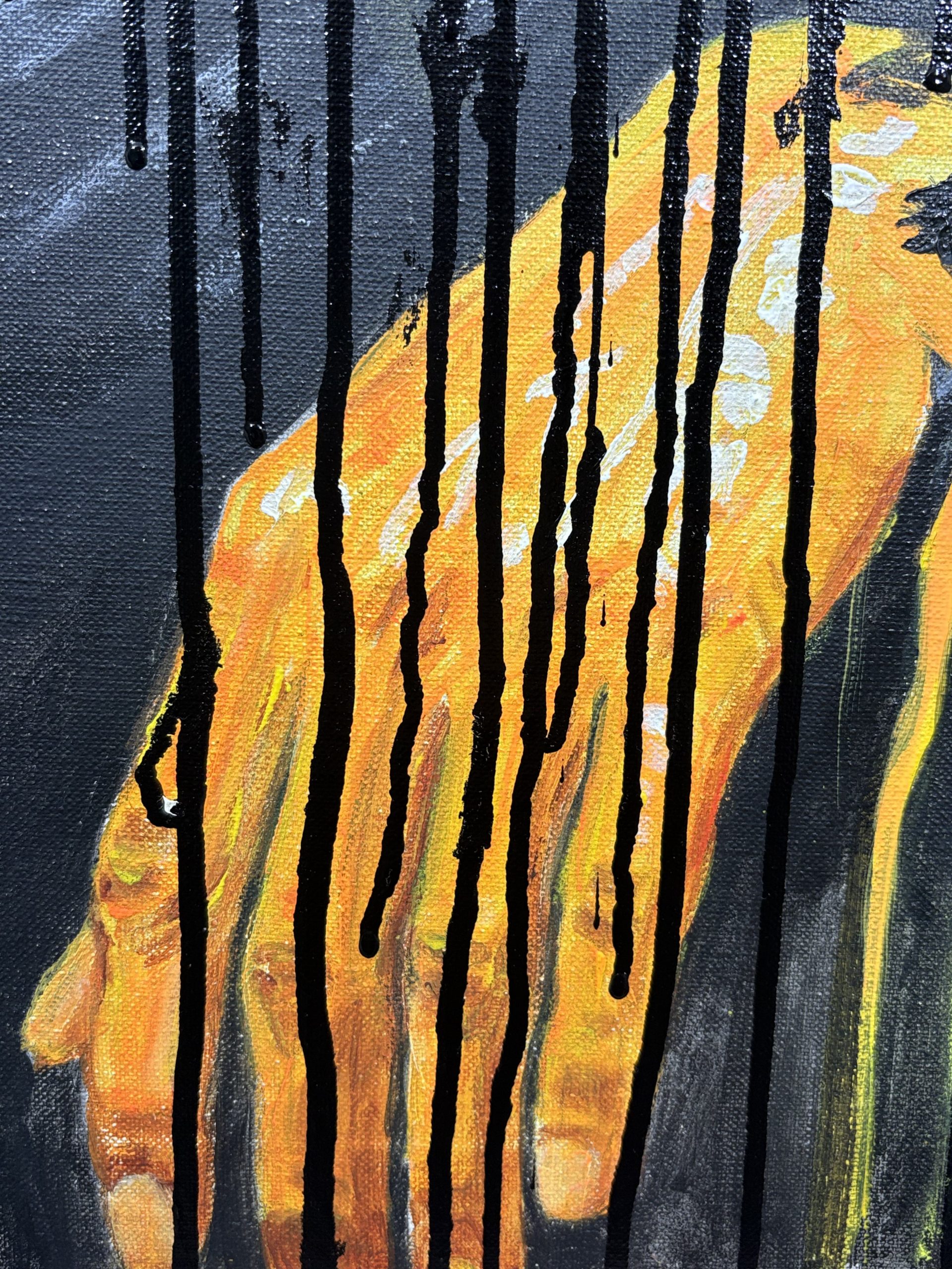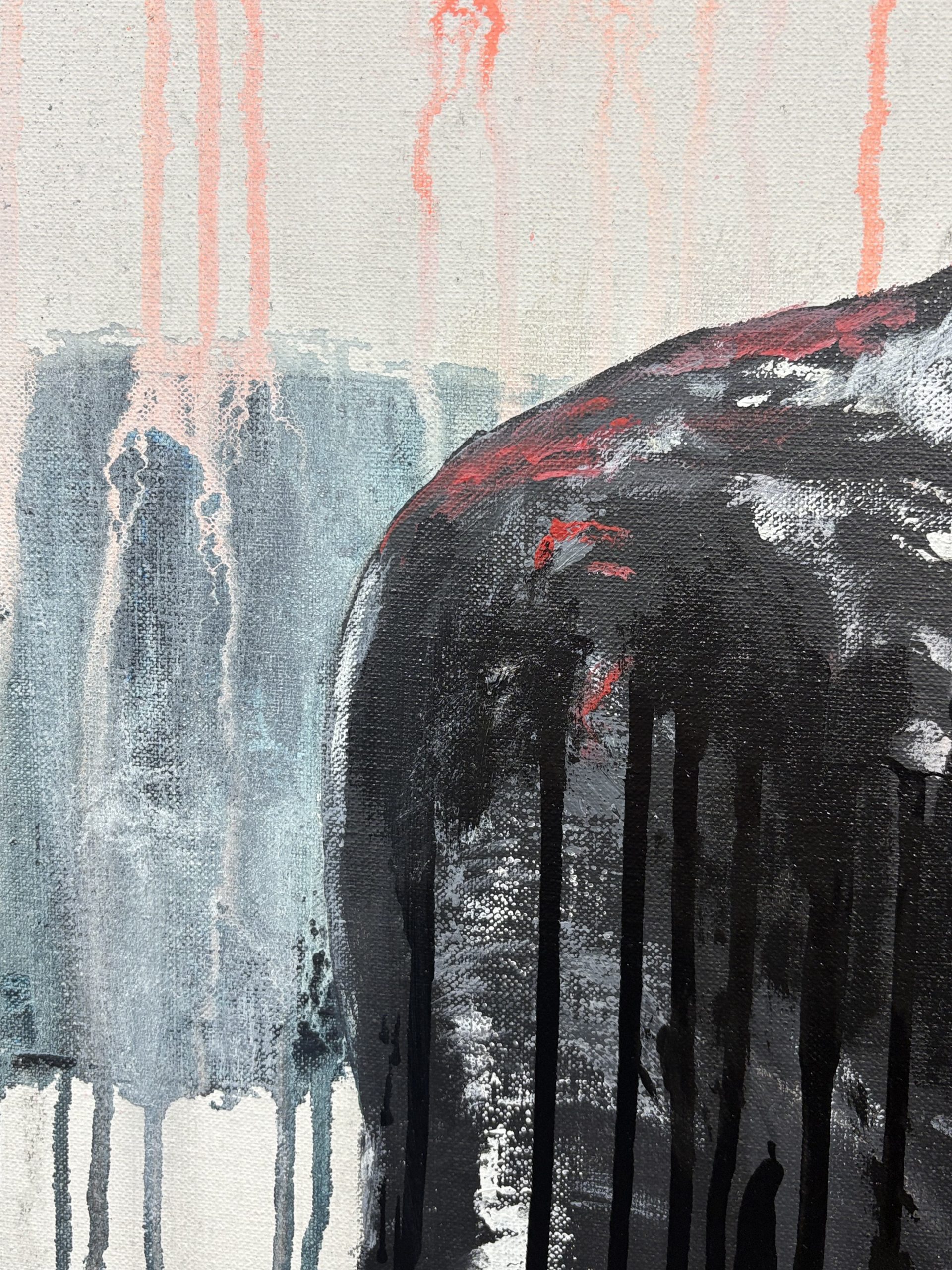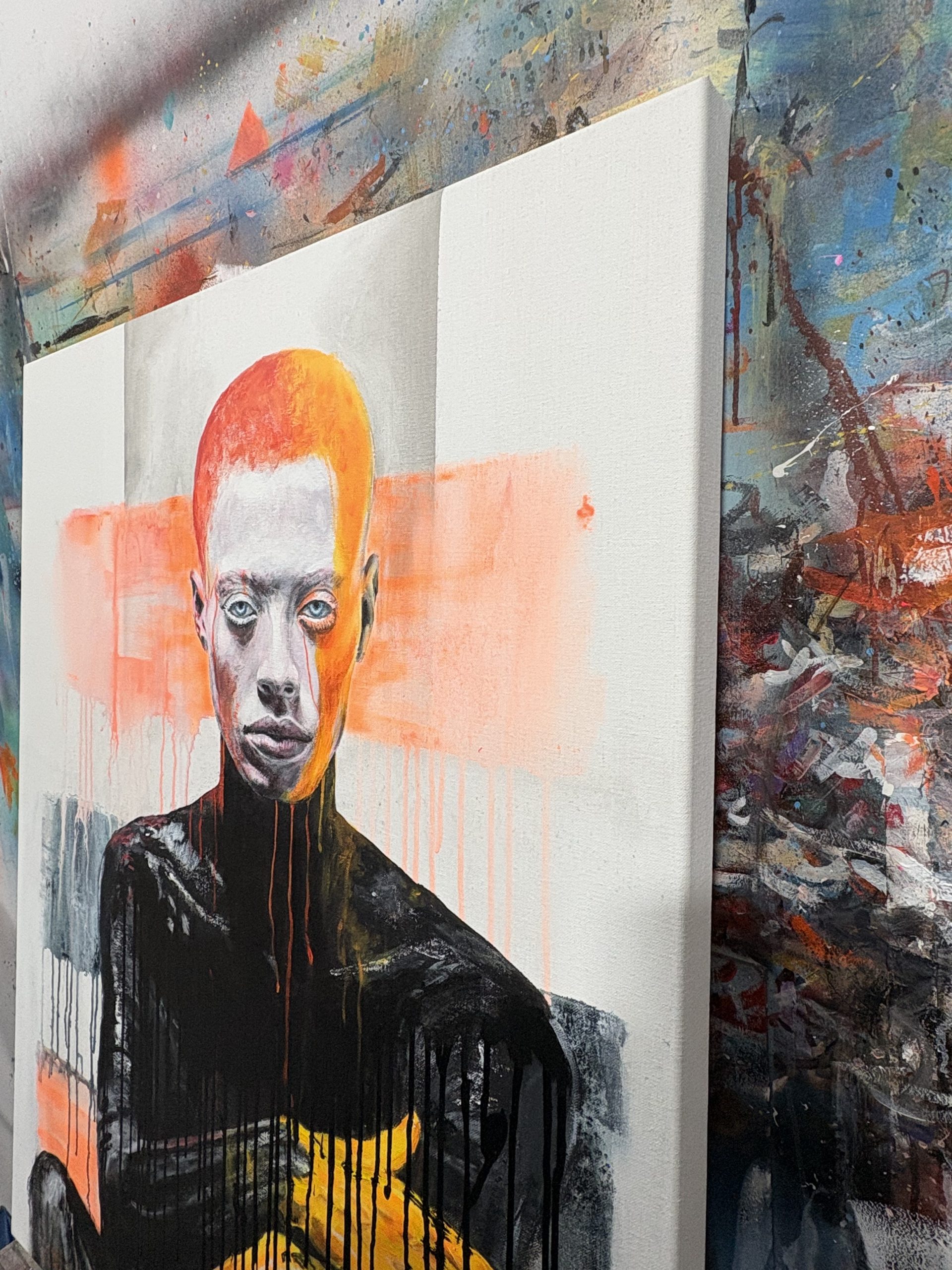 En cuanto a las líneas de pintura que gotean, esos trazos caóticos y fluidos, son la expresión de la emoción que se derrama, de la interioridad que busca salir. La idea es que sean como cicatrices, pero también como canales para la energía.