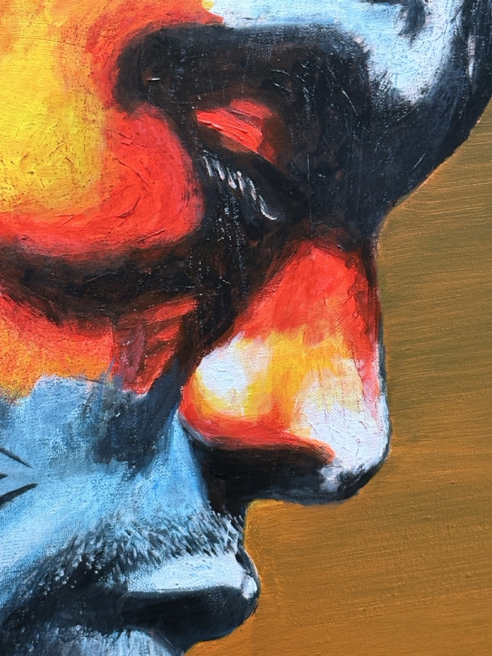 El color actúa como una presión emocional más que como un simple recurso estético. Las bandas cálidas parecen arrastrar al personaje hacia una zona de exposición, casi de incendio, mientras los tonos más fríos ofrecen una especie de refugio mental, un lugar donde seguir sosteniendo el personaje que se ha construido. Esa fricción cromática busca que quien mira se pregunte cuánto de su propia identidad está sostenido únicamente por el orgullo.