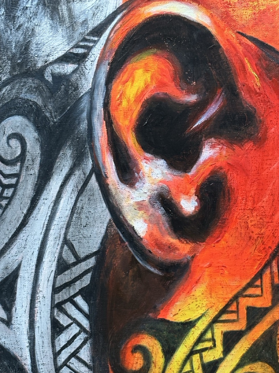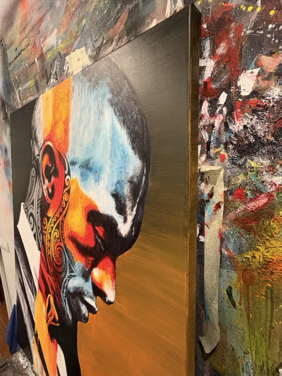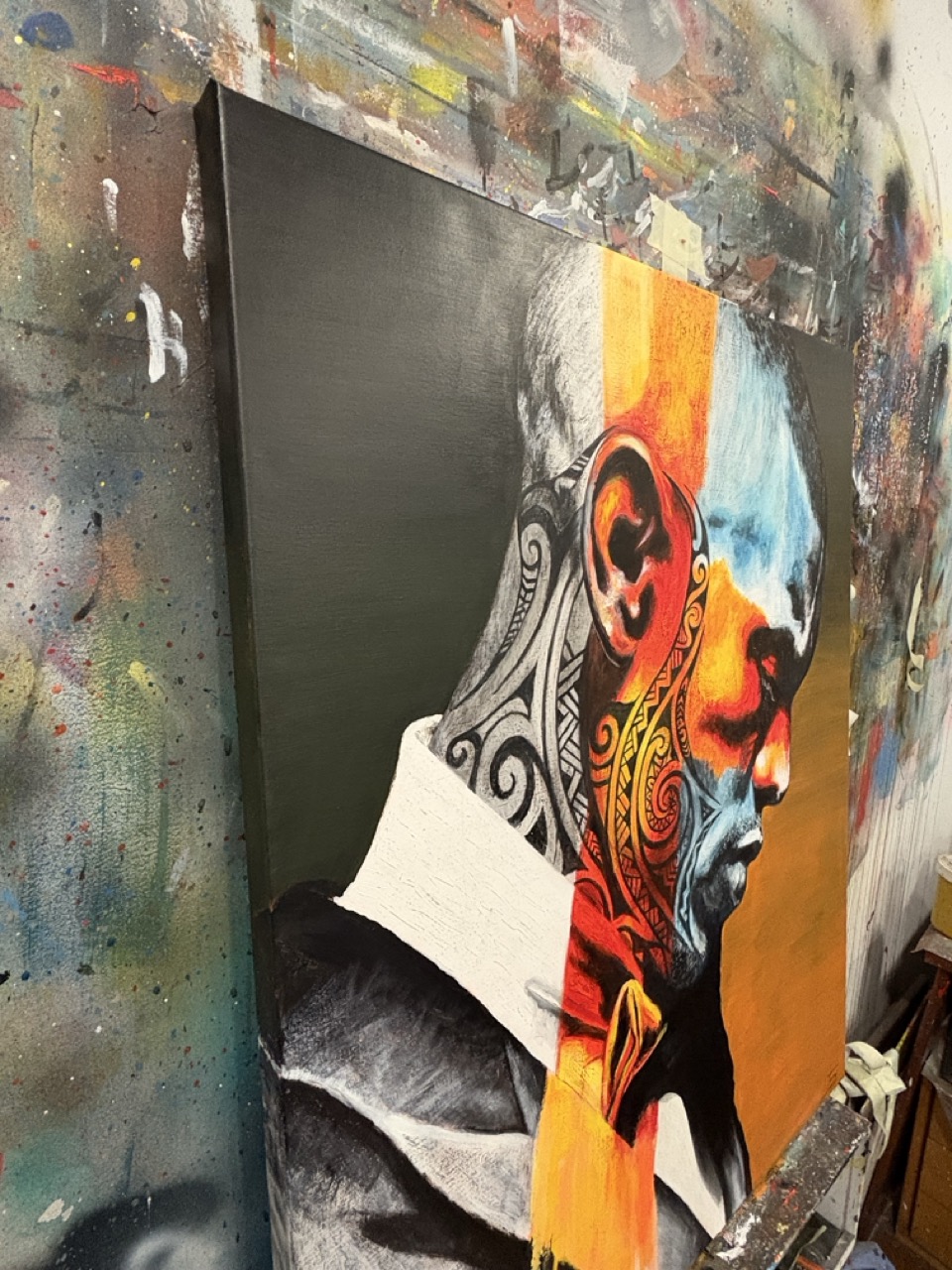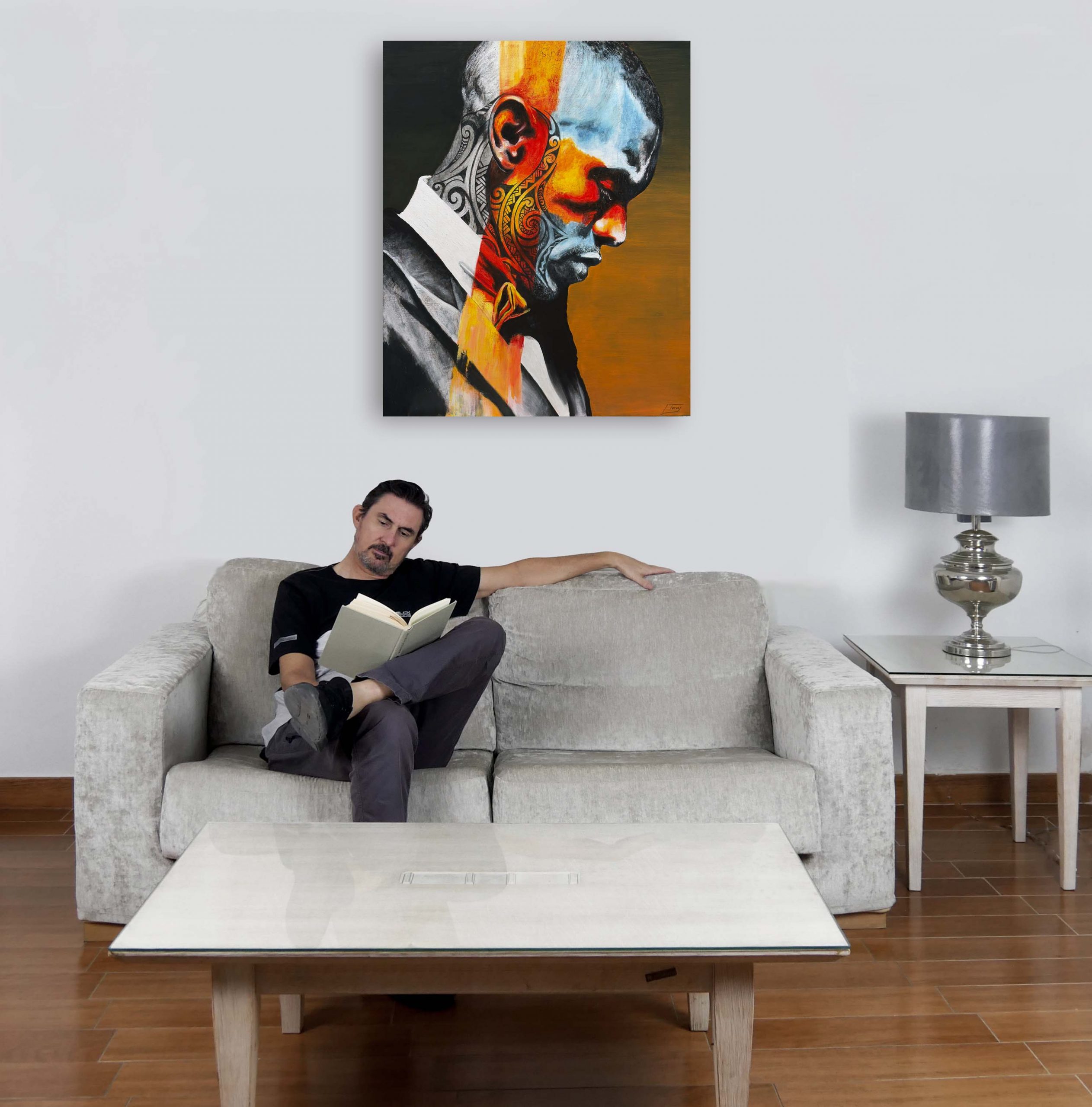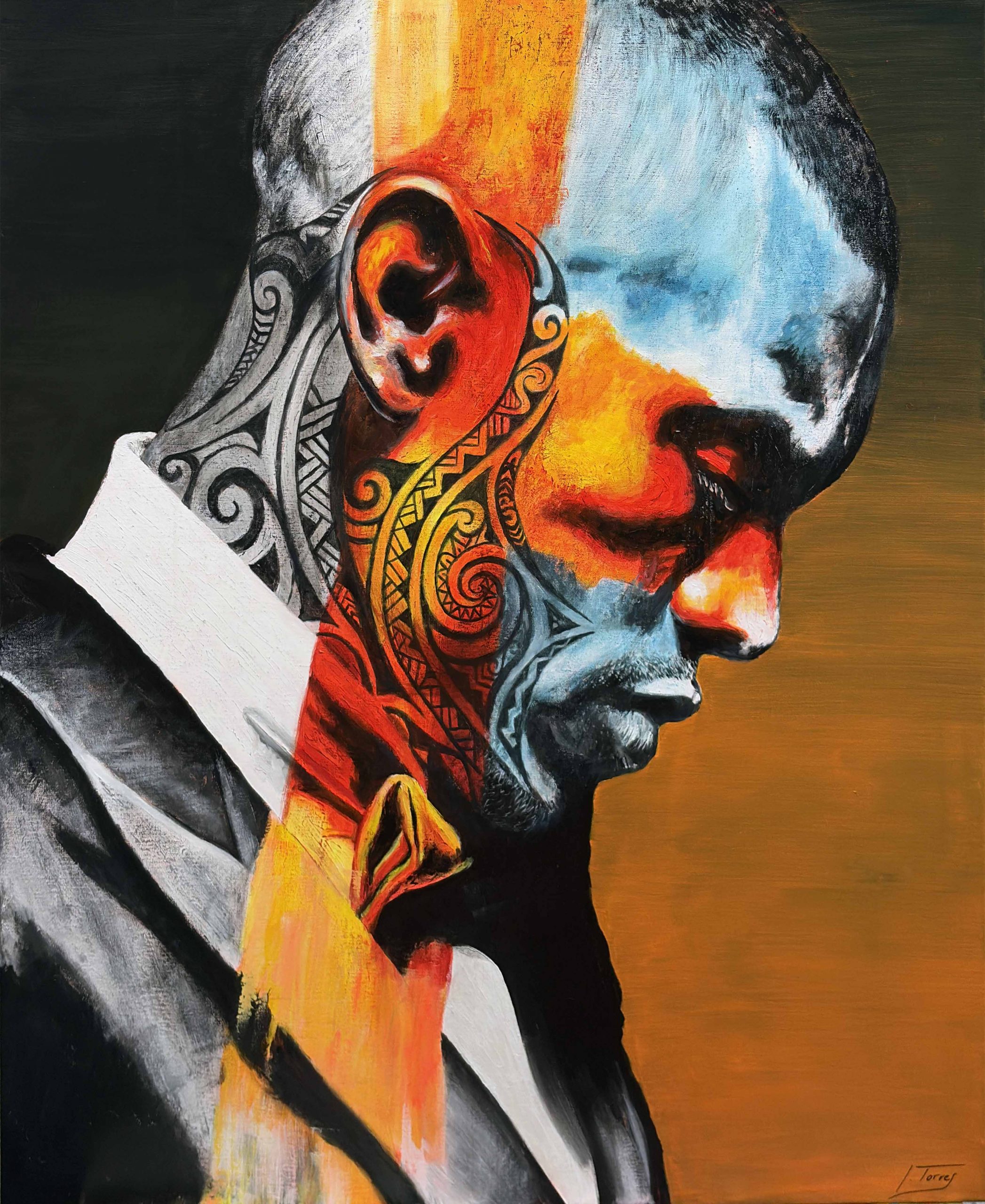 Me interesaba que el espectador sintiera una mezcla de admiración y sospecha. Hay algo heroico en esa postura erguida, en el traje impecable, en la elegancia del gesto, pero al mismo tiempo los tatuajes, la fragmentación del color y las franjas que atraviesan el cuerpo sugieren que ese orgullo tiene grietas, fisuras que no se dejan ver del todo. No es un orgullo confortable, sino un estado de alerta.