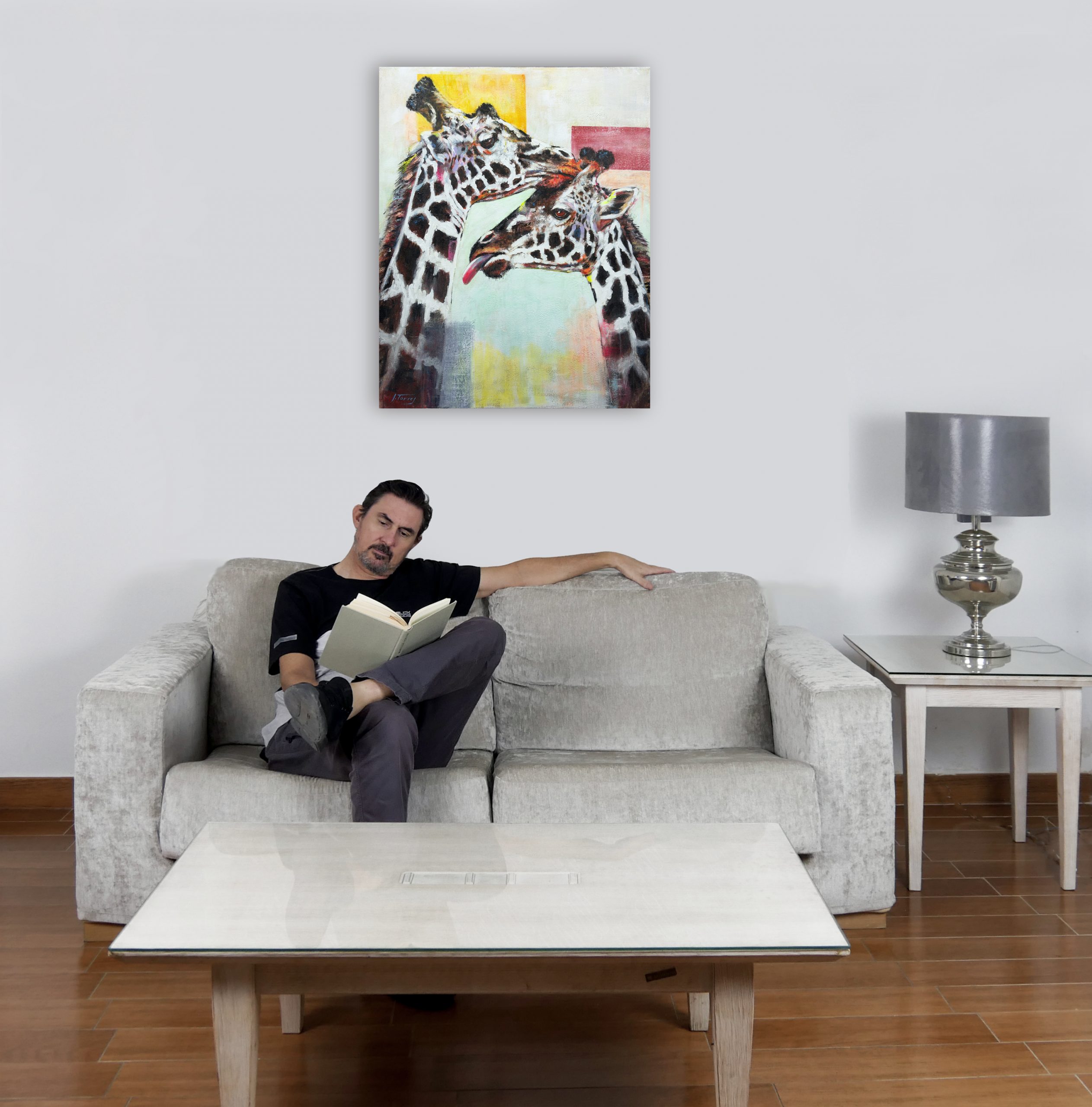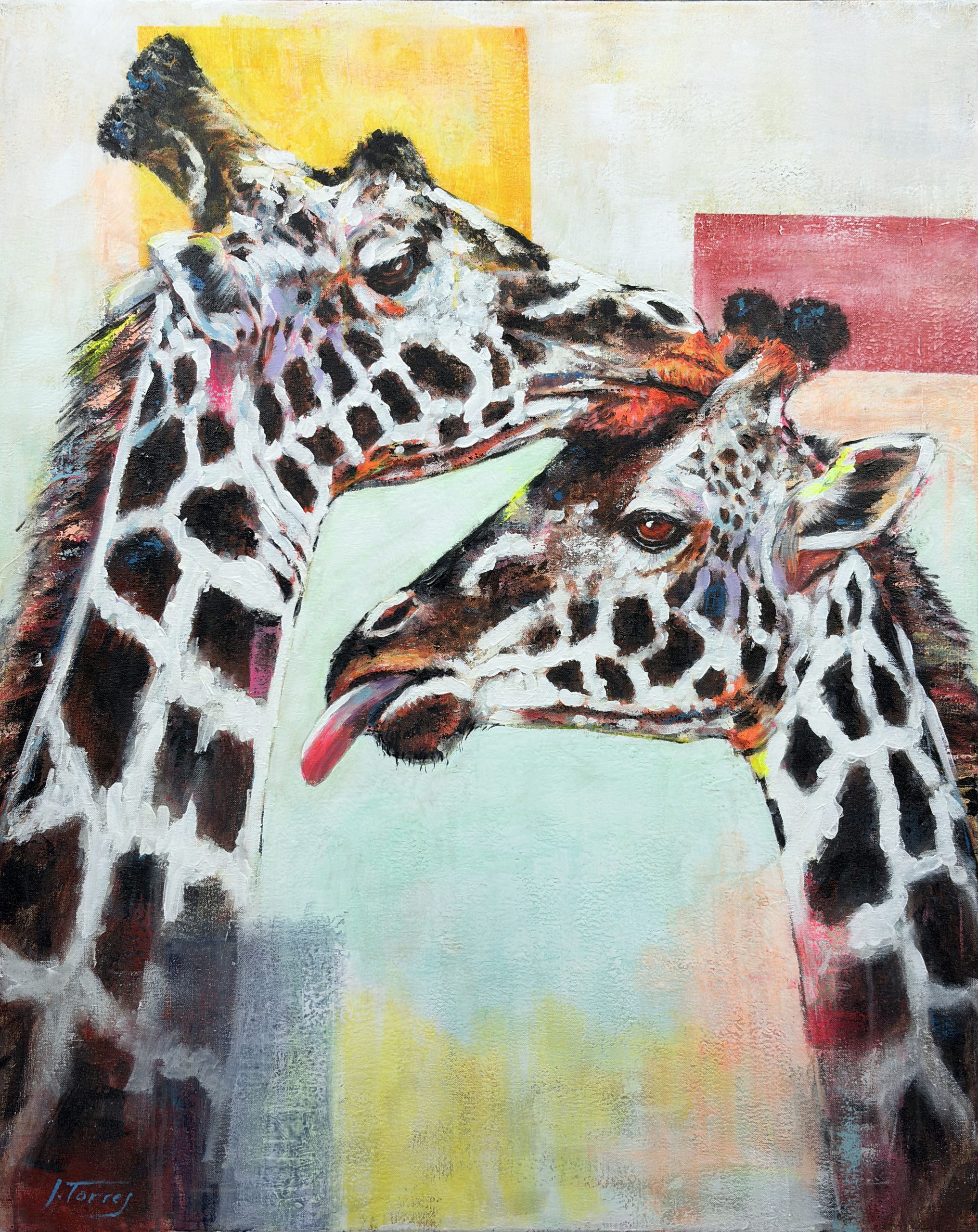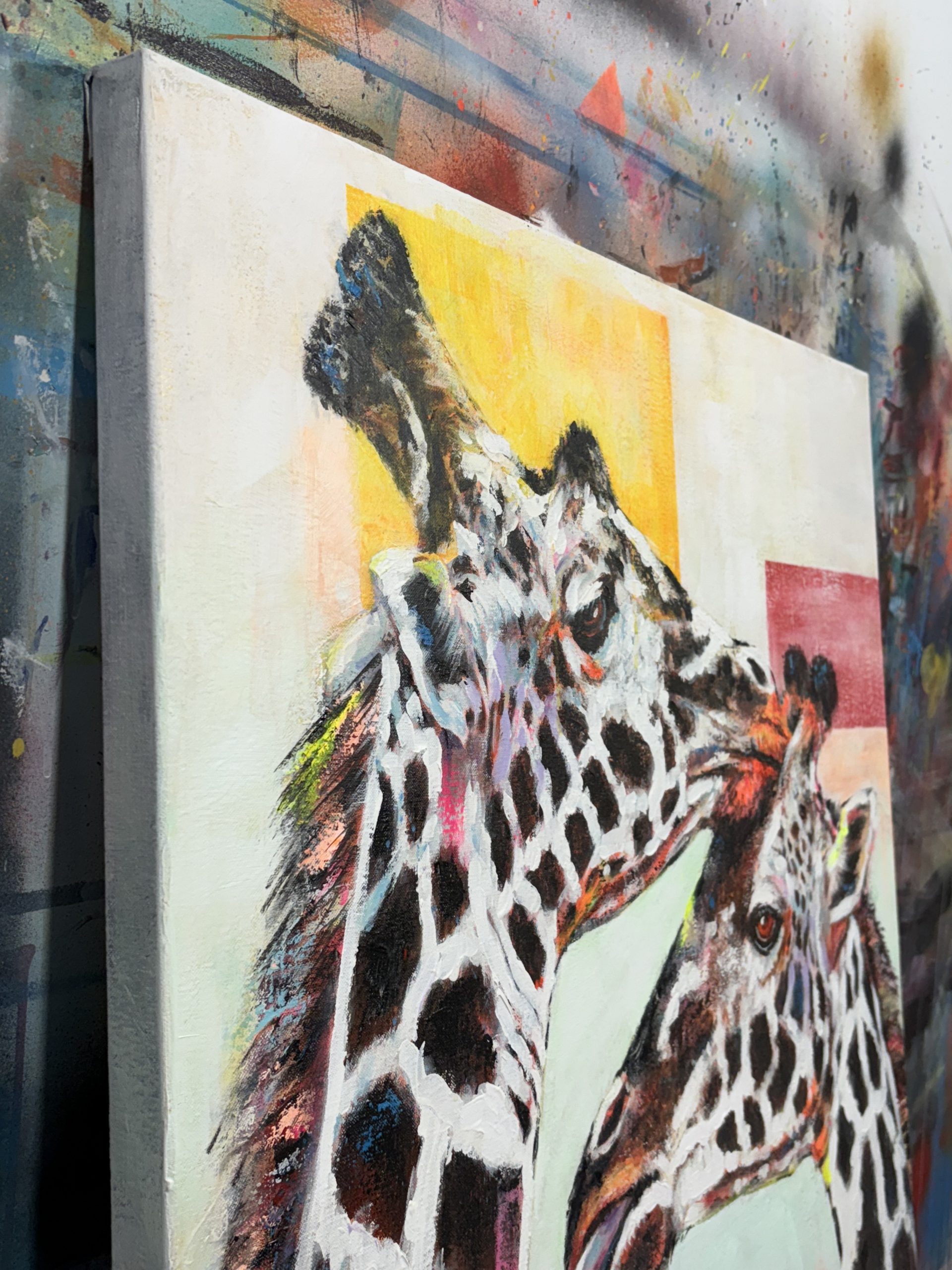 En “Vértigo”, he querido capturar un momento íntimo y casi surrealista entre dos jirafas. Sus largos cuellos se entrelazan en un abrazo casi cósmico, desafiando la gravedad y las leyes de la perspectiva. El fondo, una amalgama de colores vibrantes y formas geométricas, contrasta con la serenidad de los animales, creando una sensación de desequilibrio y movimiento perpetuo.