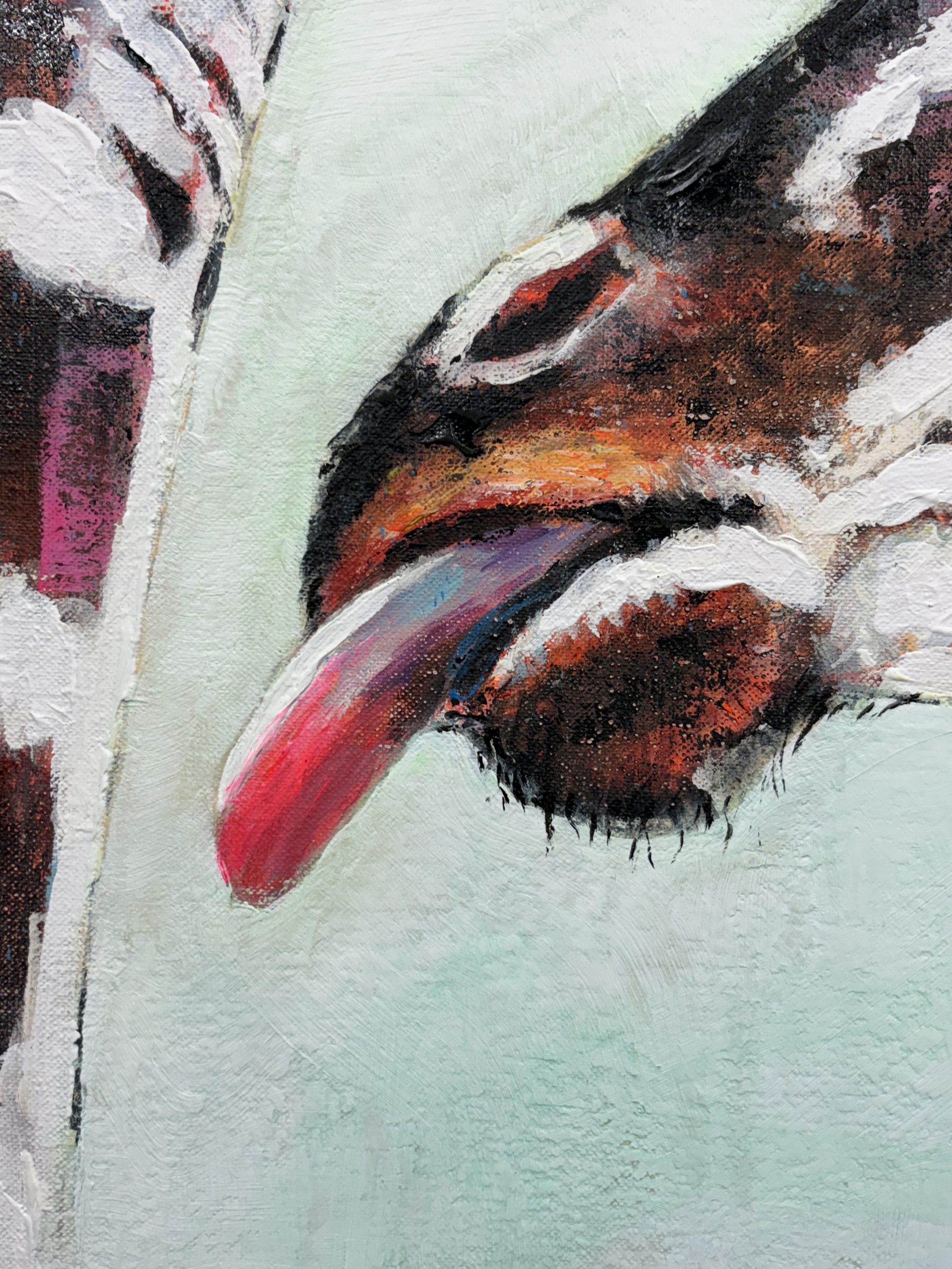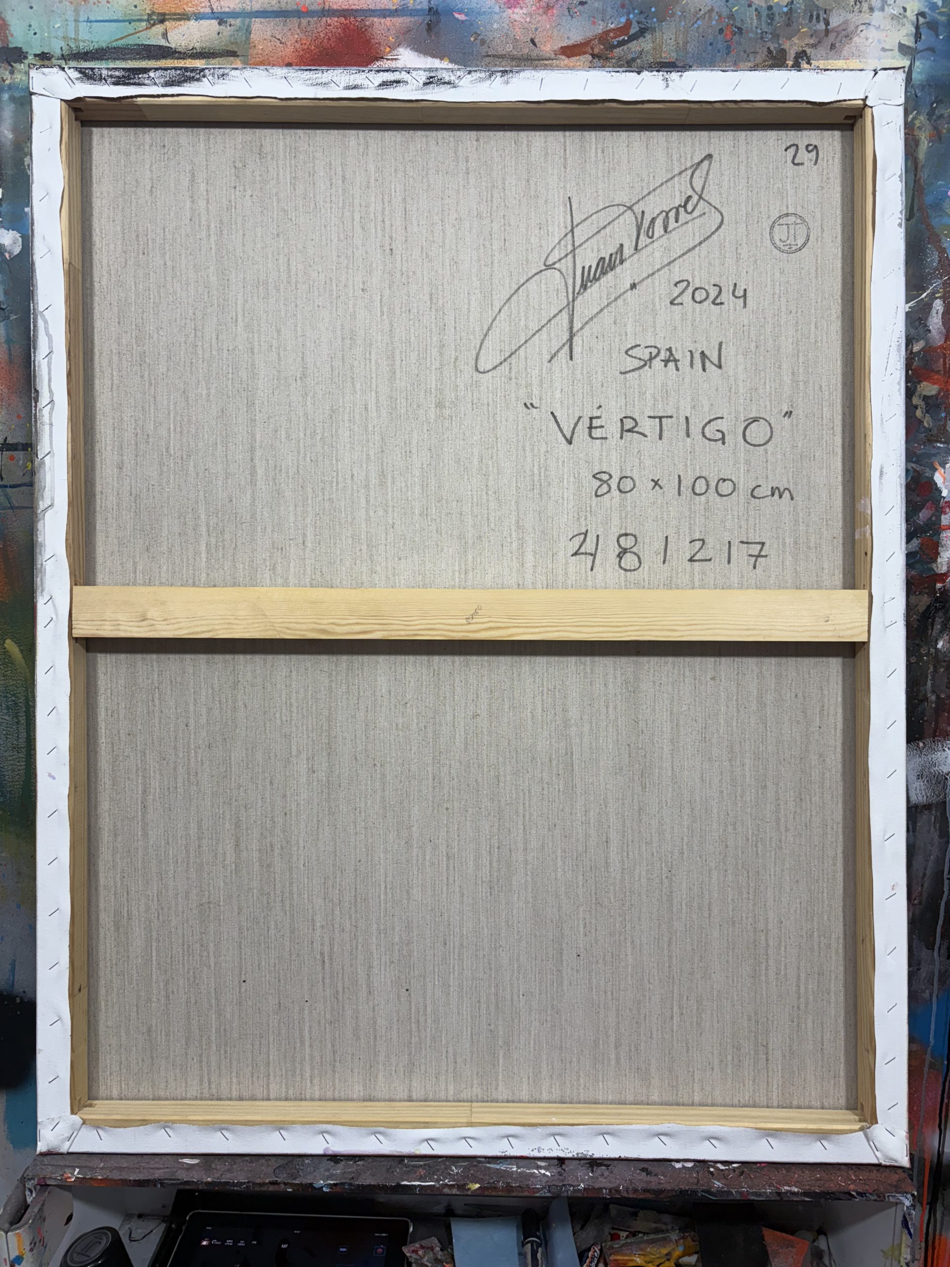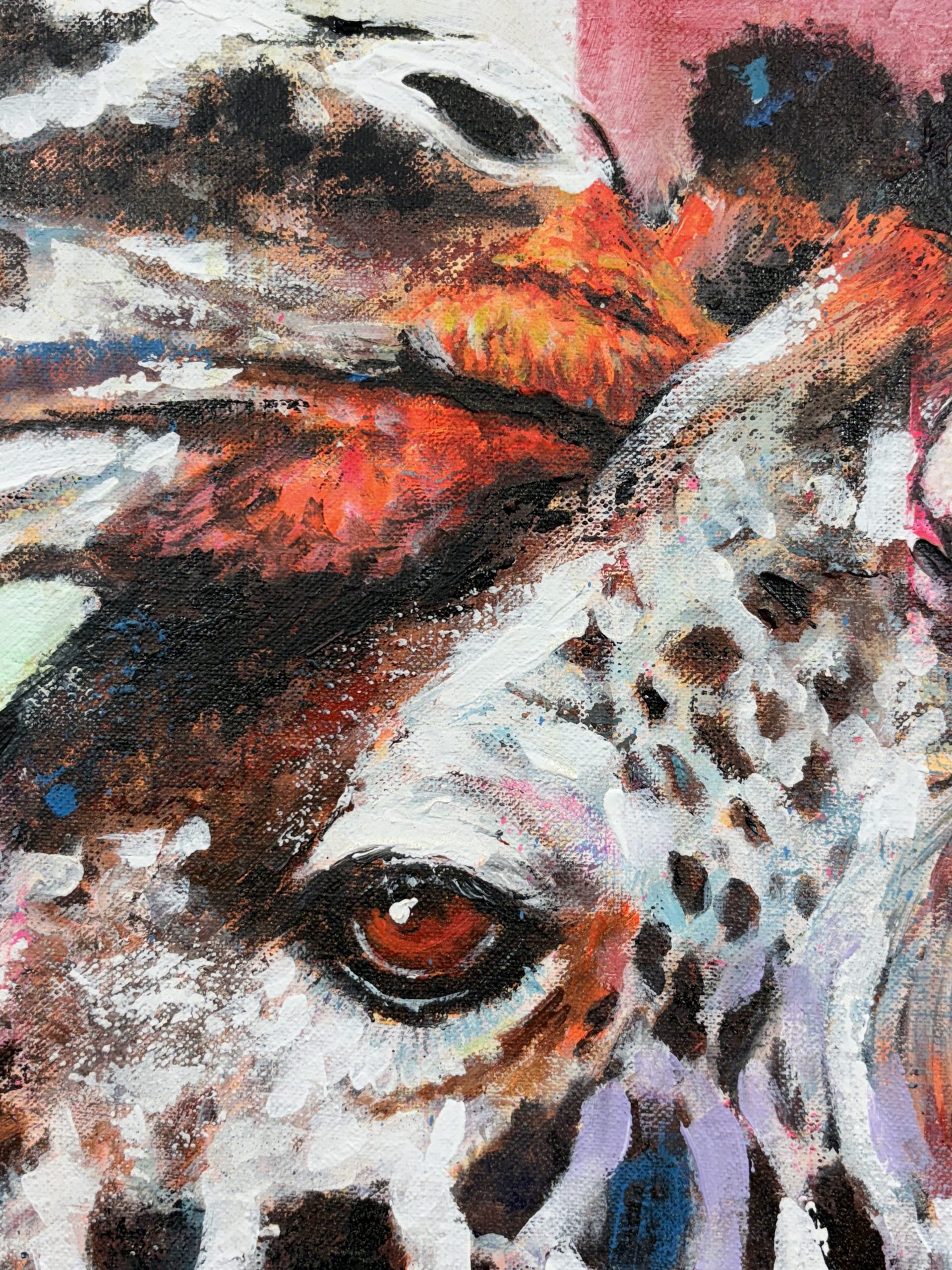 En “Vértigo”, he querido capturar un momento íntimo y casi surrealista entre dos jirafas. Sus largos cuellos se entrelazan en un abrazo casi cósmico, desafiando la gravedad y las leyes de la perspectiva. El fondo, una amalgama de colores vibrantes y formas geométricas, contrasta con la serenidad de los animales, creando una sensación de desequilibrio y movimiento perpetuo.